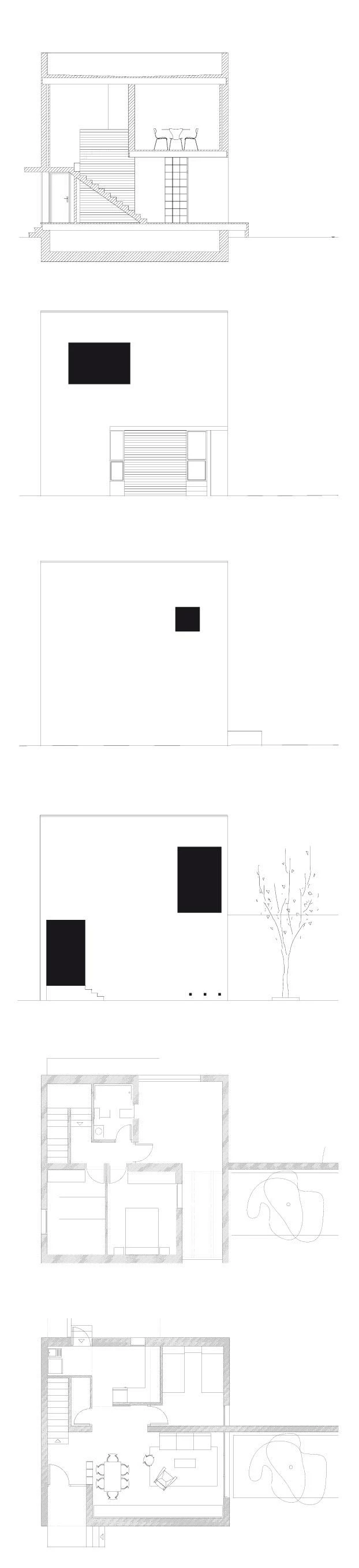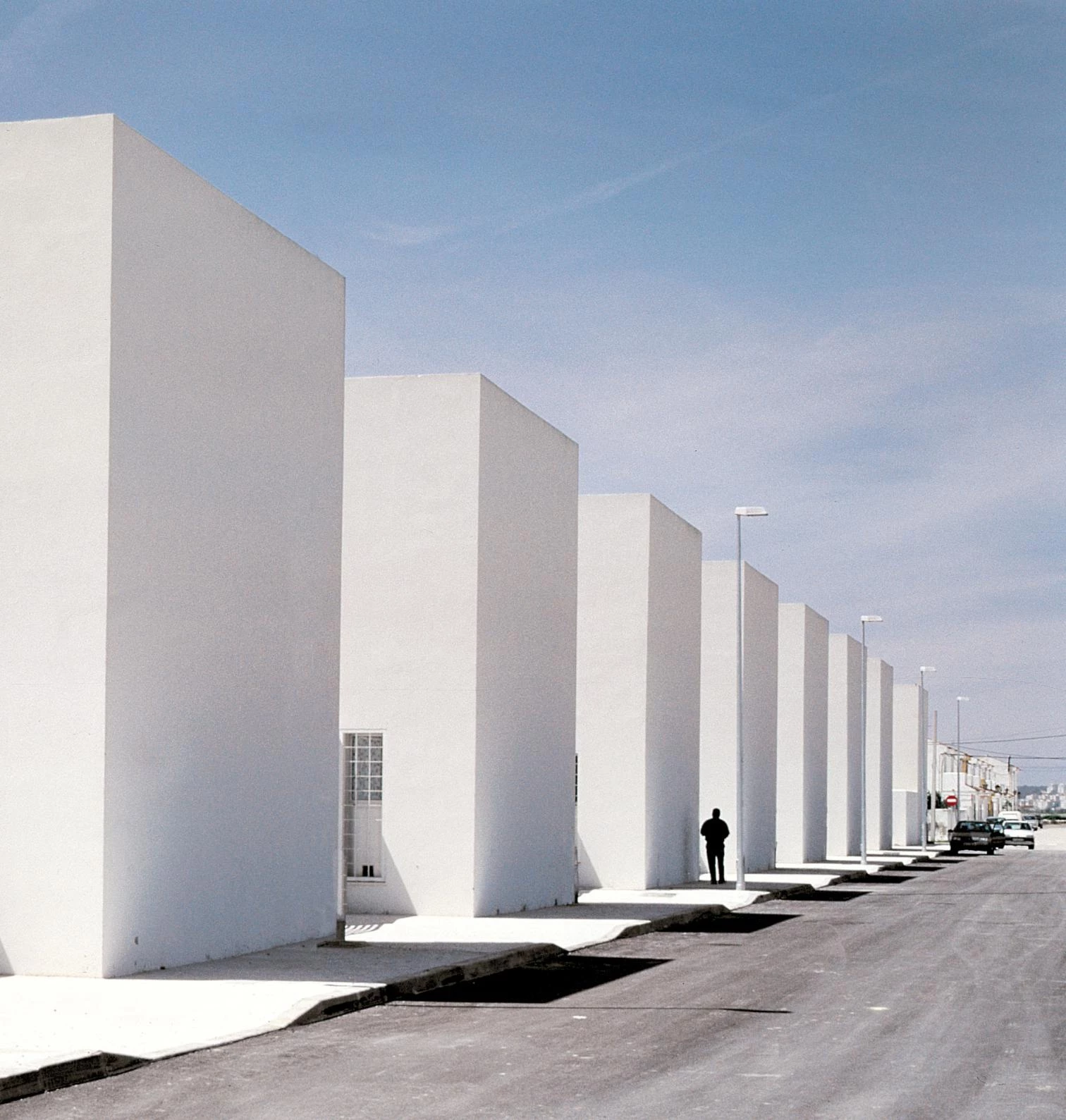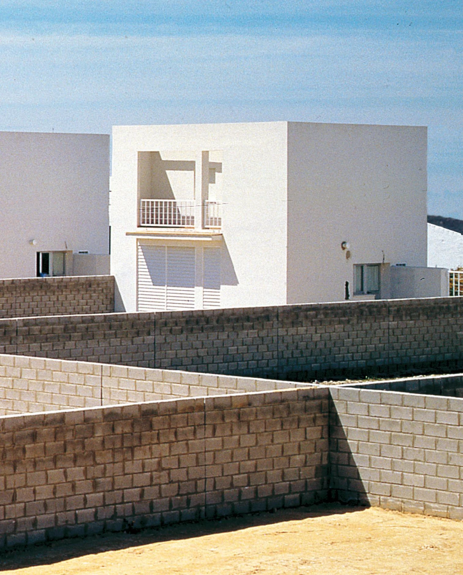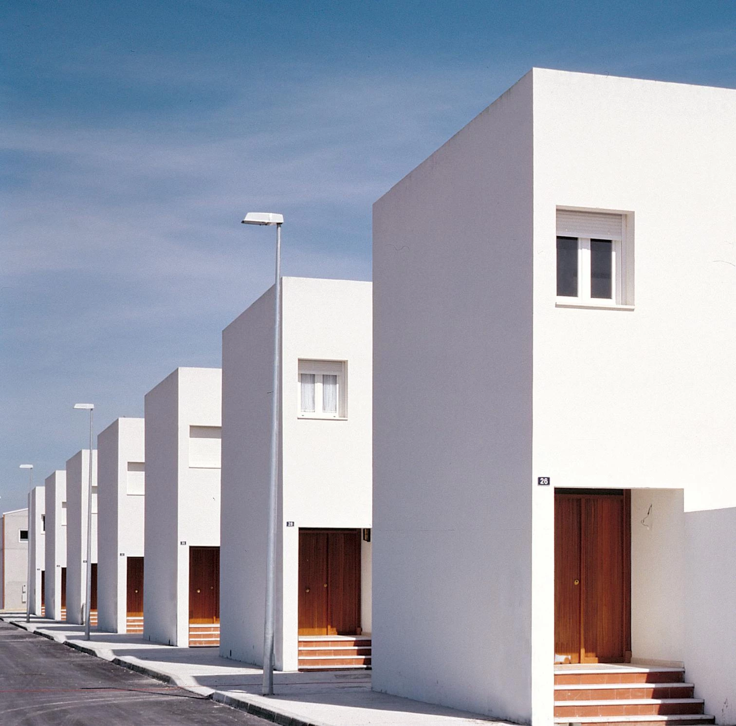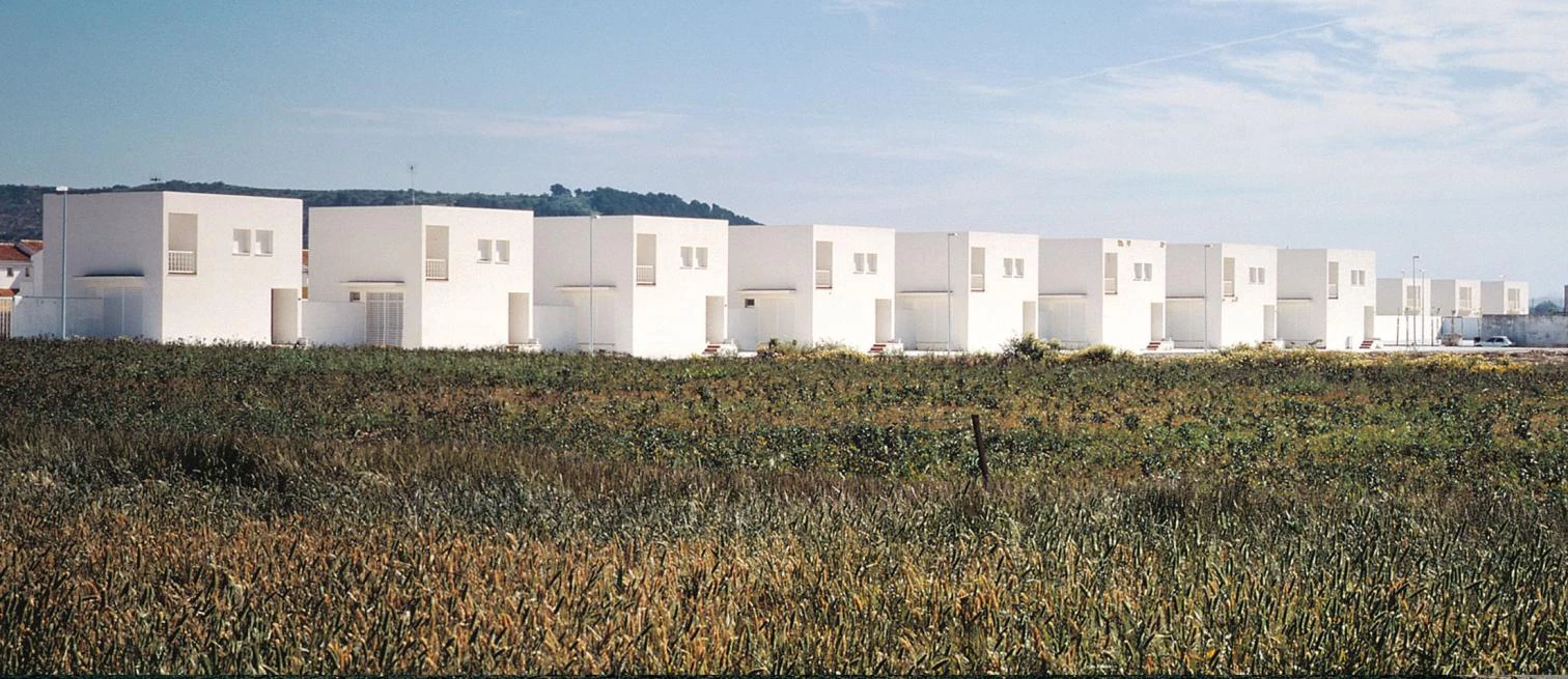 La sencilla ordenación opta por disponer los cubos blancos en el perímetro de dos manzanas y en el extremo de cada parcela, unidos por un muro de tres metros que rodea los jardines y penetra, según el caso, en el interior de las viviendas. Los paños blancos y regulares se abren en pequeños huecos allá donde el programa lo demanda. Tres escalones conducen hasta el nivel de la planta baja, ligeramente elevada respecto a la calle para dotar de cierta privacidad a los estares, expuestos a la visión de los paseantes. En el tipo sur, el más repetido, el salón y el dormitorio principal se abren a la calle y al sureste, encontrando su horizonte visual en las marismas y Medina Sidonia, mientras las zonas de servicio, cocina y baños vuelcan al jardín posterior. En el resto de los tipos, las viviendas cambian en razón de la orientación y la implantación, girando sobre sí mismas y acomodándose en los límites del cubo blanco y rotundo, que permanece exteriormente intacto. La reiteración de los prismas dibuja, como remate de la trama ortogonal del núcleo urbano, una línea horizontal y contundente que se hace eco del paisaje. Sobre los lados contiguos de las manzanas, dos pequeñas plazas funcionan como lugar de encuentro para los vecinos.