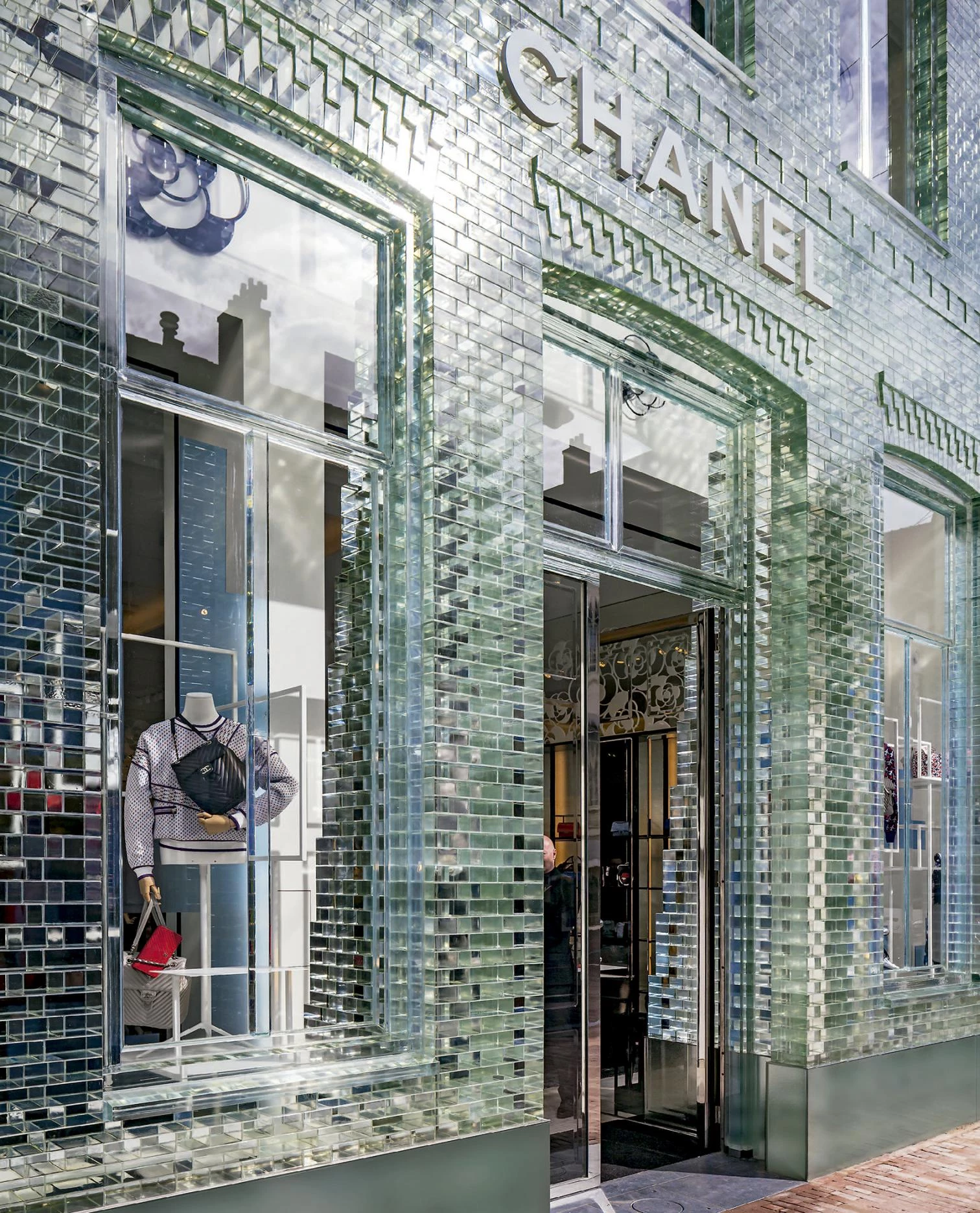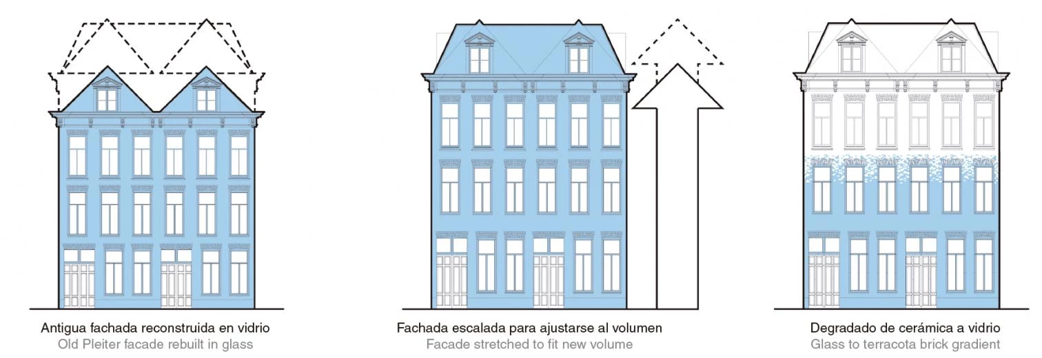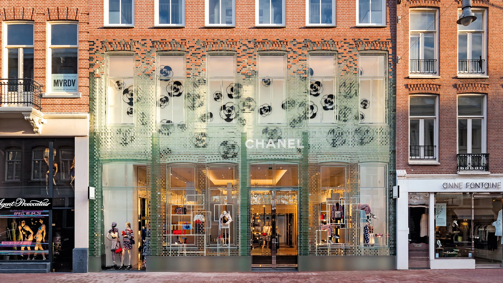 Destinado a albergar una tienda insignia en la calle PC Hooftstraat —la avenida de lujo del centro de Amsterdam—, este edificio sustituye a dos antiguas casas tradicionales cuyo volumen ha sido transformado para ampliar el espacio interior y adecuarlo al uso comercial. El nuevo diseño reproduce la composición original para no renunciar a las características propias de su arquitectura, pero trata de otorgarle una imagen más actual, para lo cual hace uso del vidrio como recurso de reproducción contemporánea. Así, la nueva fachada es una adaptación formal y material de la versión original. Ya que el volumen construido se modifica para adaptarse a la normativa vigente, la fachada se escala para mantener la composición de los elementos originales. De la misma forma, el vidrio se aplica en forma de ladrillos, por lo que, pese a cambiar su materialidad, el proceso constructivo es similar. Por otro lado, el frente se compone como un degradado que parte de los ladrillos translúcidos y va cambiando hasta ladrillos cerámicos, haciendo visualmente permeables las plantas inferiores y protegiendo las superiores. Para conseguir la máxima transparencia en el muro de vidrio, la Universidad de Delft y las constructoras desarrollaron un pegamento transparente de alta resistencia adherido mediante radiación ultravioleta.