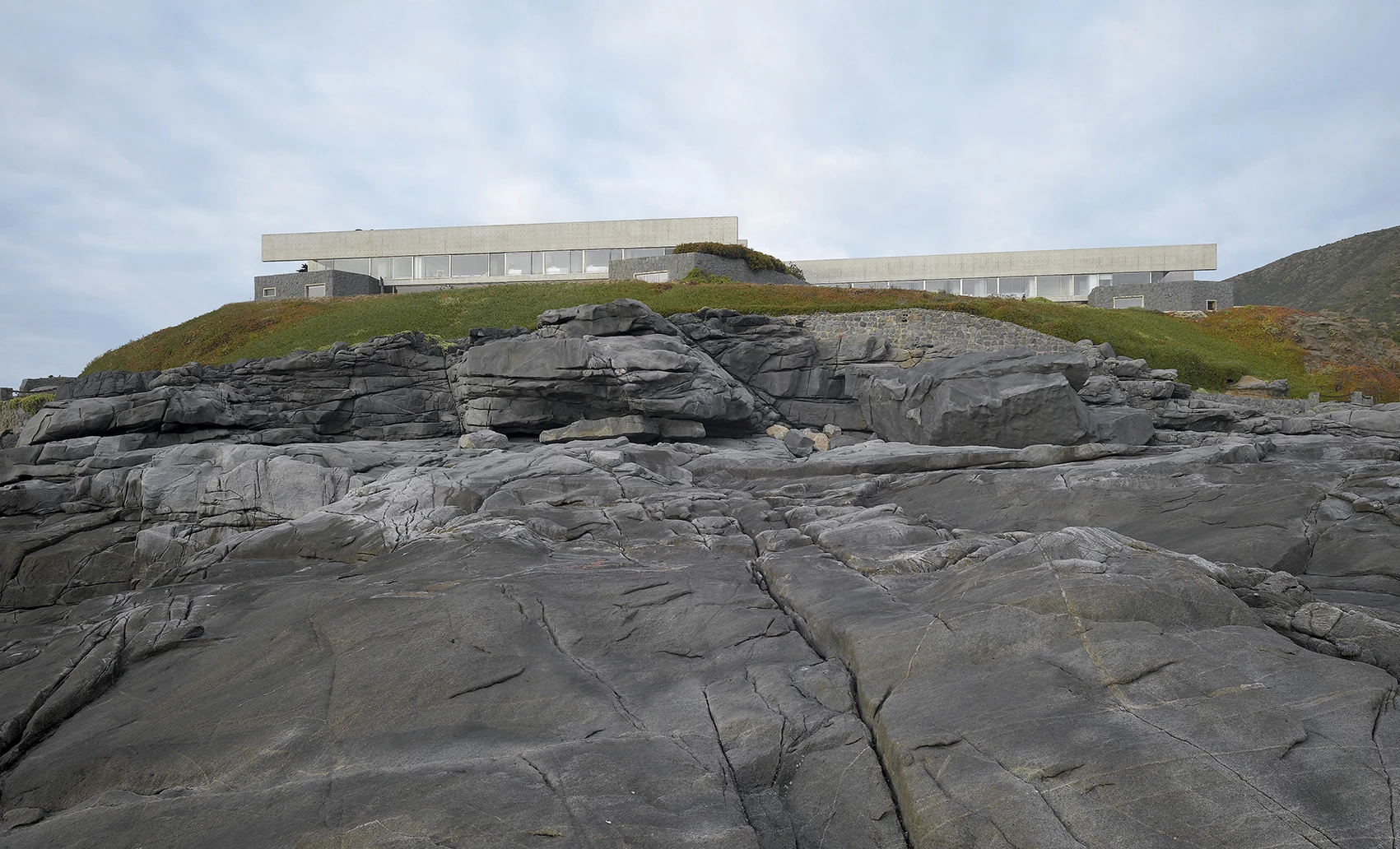 Fue preciso entonces construir dos paralelepípedos, extendidos y compactos, que abarcaron el terreno en su longitud celebrando el horizonte lejano. Desde la distancia los dos pabellones se funden en un solo trazo neto y directo, al tiempo que se erigen como contrapunto al relieve de las rocas y al perfil ondulante de los cerros inmediatos.