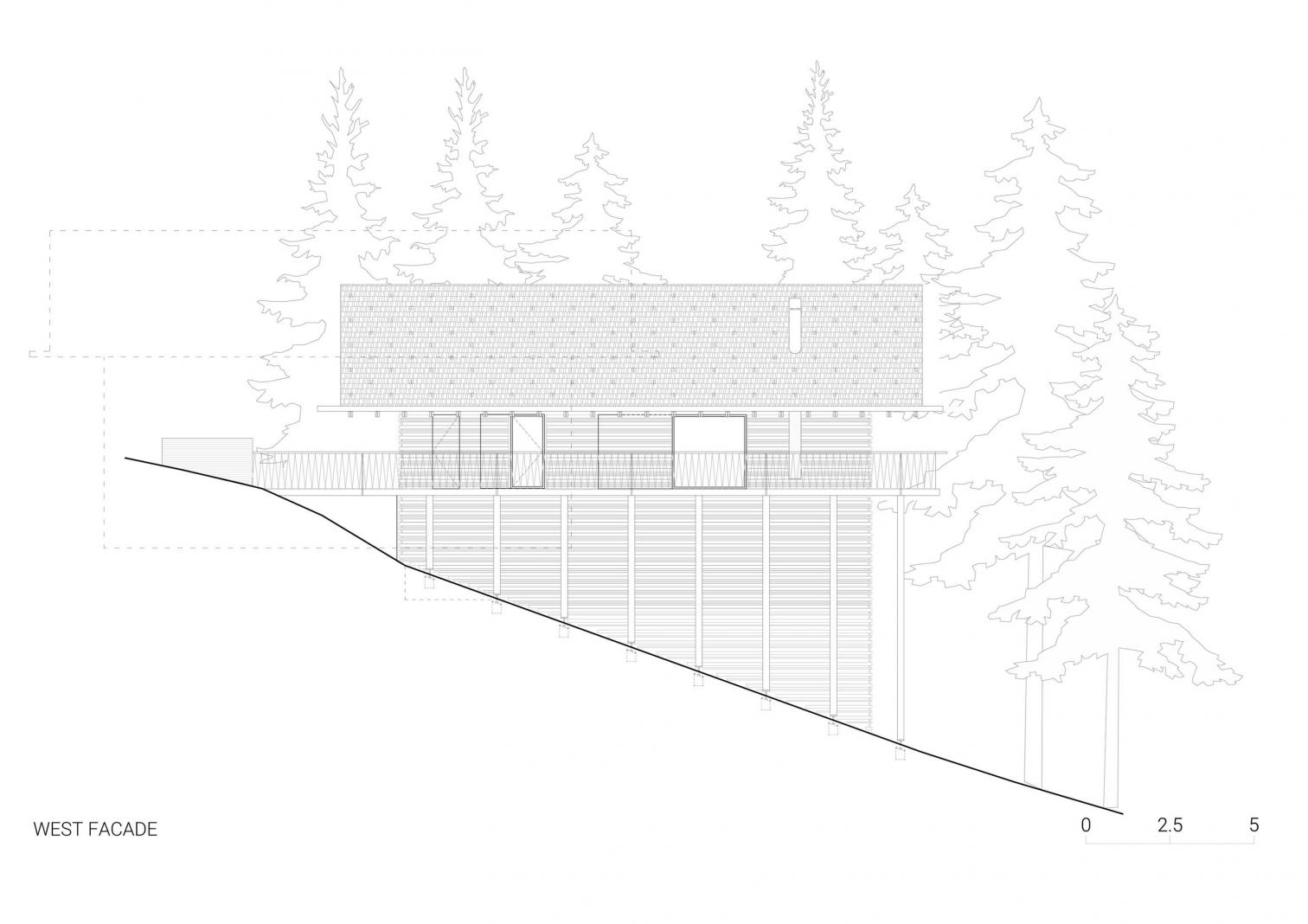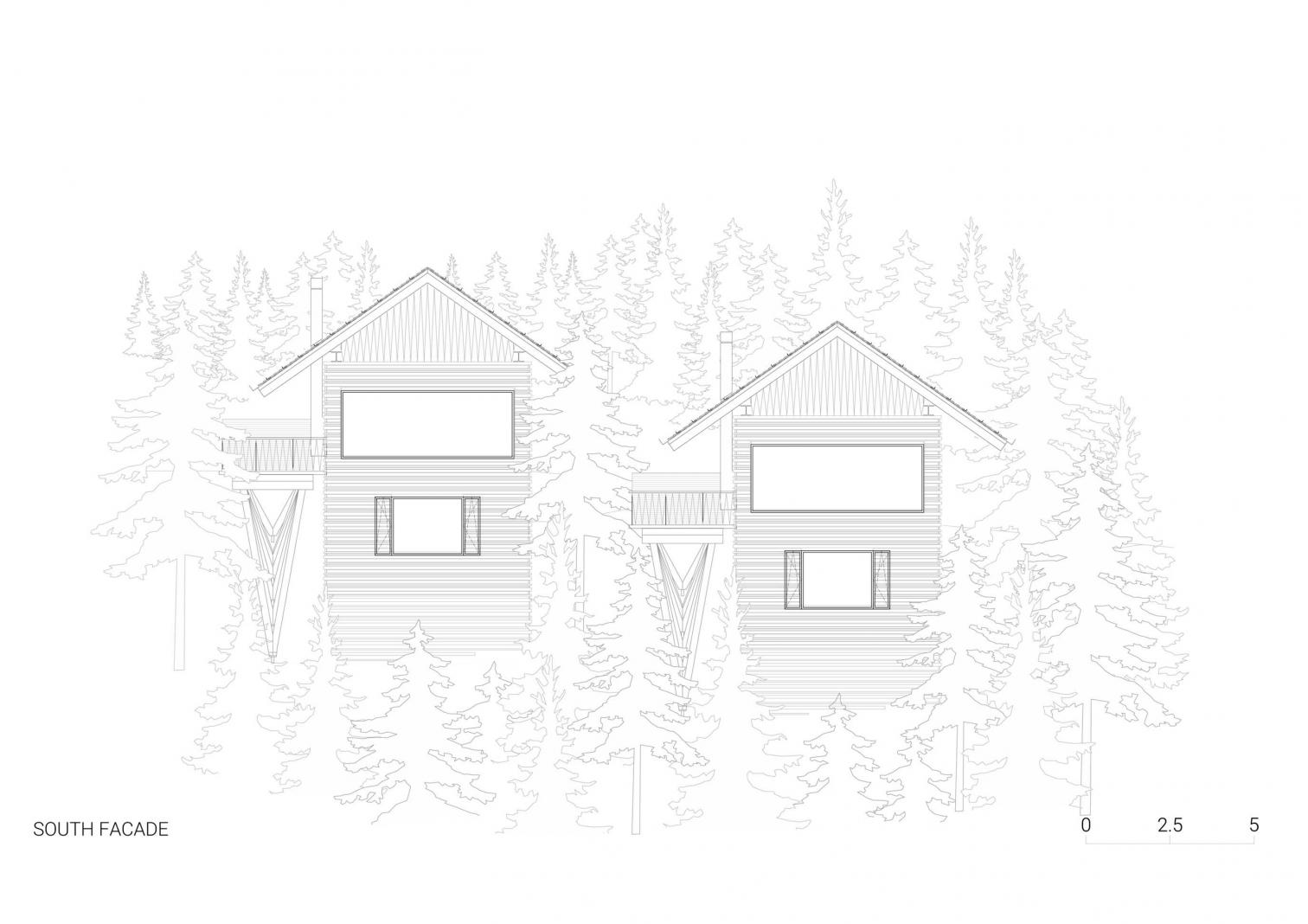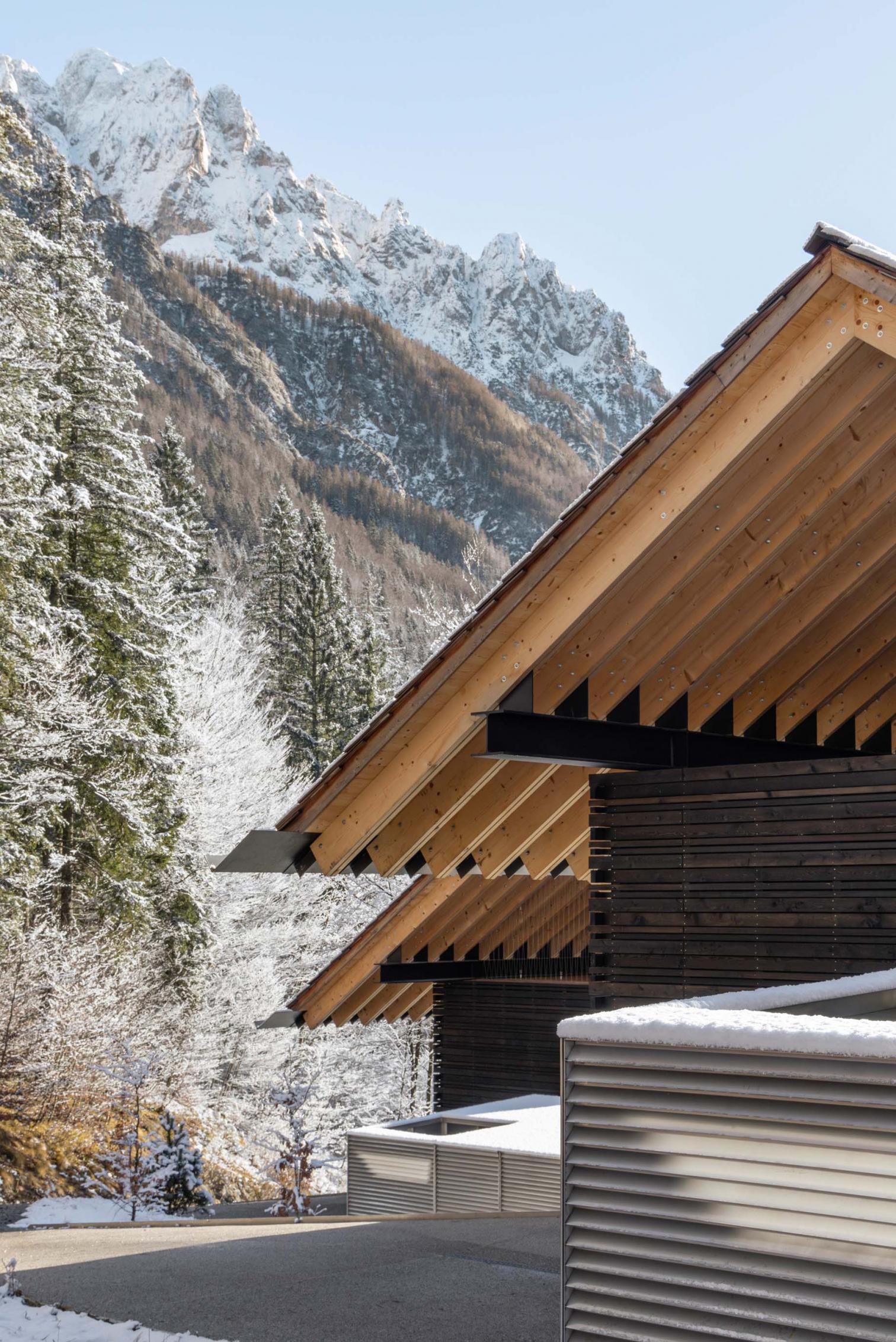 El emplazamiento de las casas en un terreno irregular se eligió cuidadosamente, aprovechando las vistas a los Alpes Julianos y al Jasna. El volumen alargado y sencillo esta recubierto con madera de tonos oscuros. Esta construcción se levanta con dos estructuras en forma de V: una es una cubierta a dos aguas, y la otra sirve de soporte para la terraza elevada, con columnas en V que mediante la repetición generan ritmo visual.