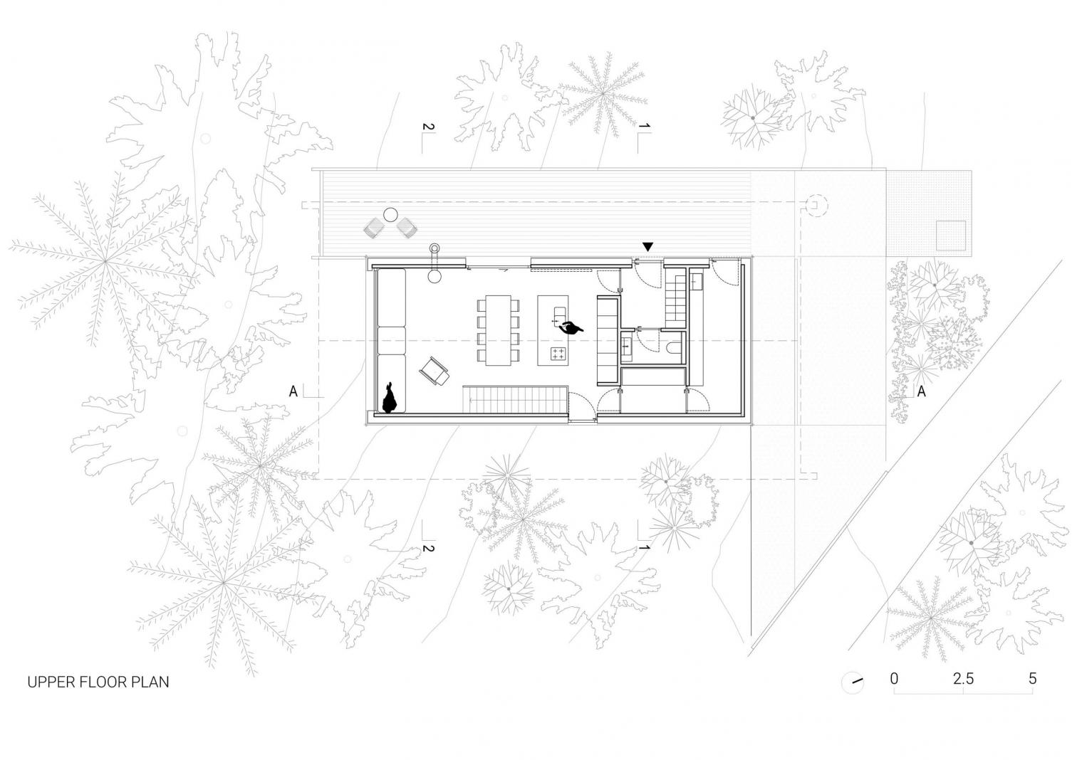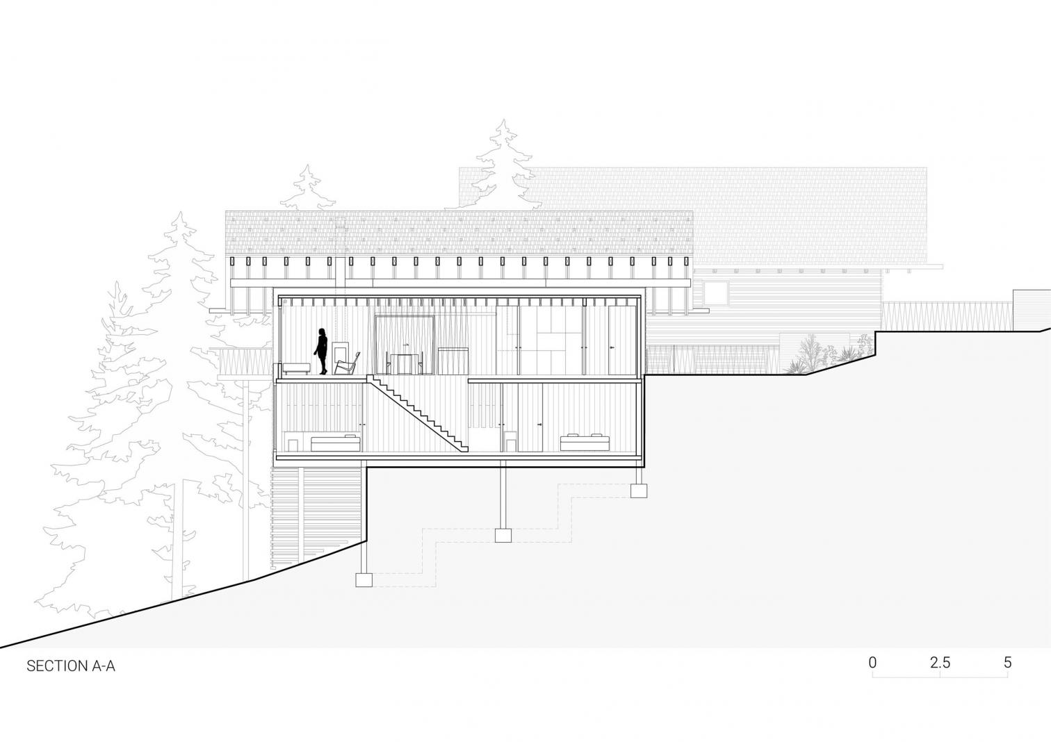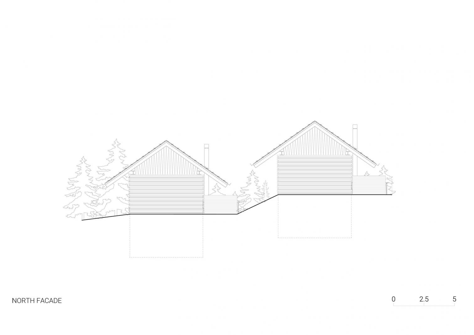 El emplazamiento de las casas en un terreno irregular se eligió cuidadosamente, aprovechando las vistas a los Alpes Julianos y al Jasna. El volumen alargado y sencillo esta recubierto con madera de tonos oscuros. Esta construcción se levanta con dos estructuras en forma de V: una es una cubierta a dos aguas, y la otra sirve de soporte para la terraza elevada, con columnas en V que mediante la repetición generan ritmo visual.