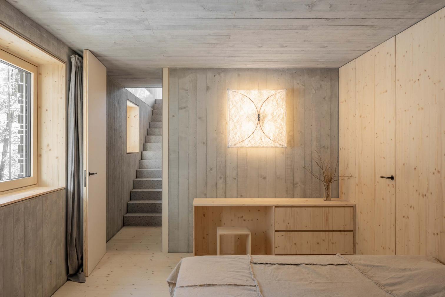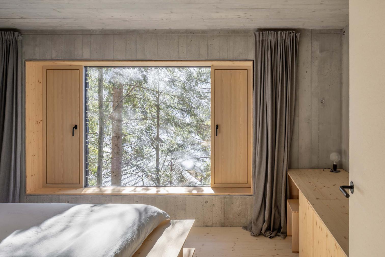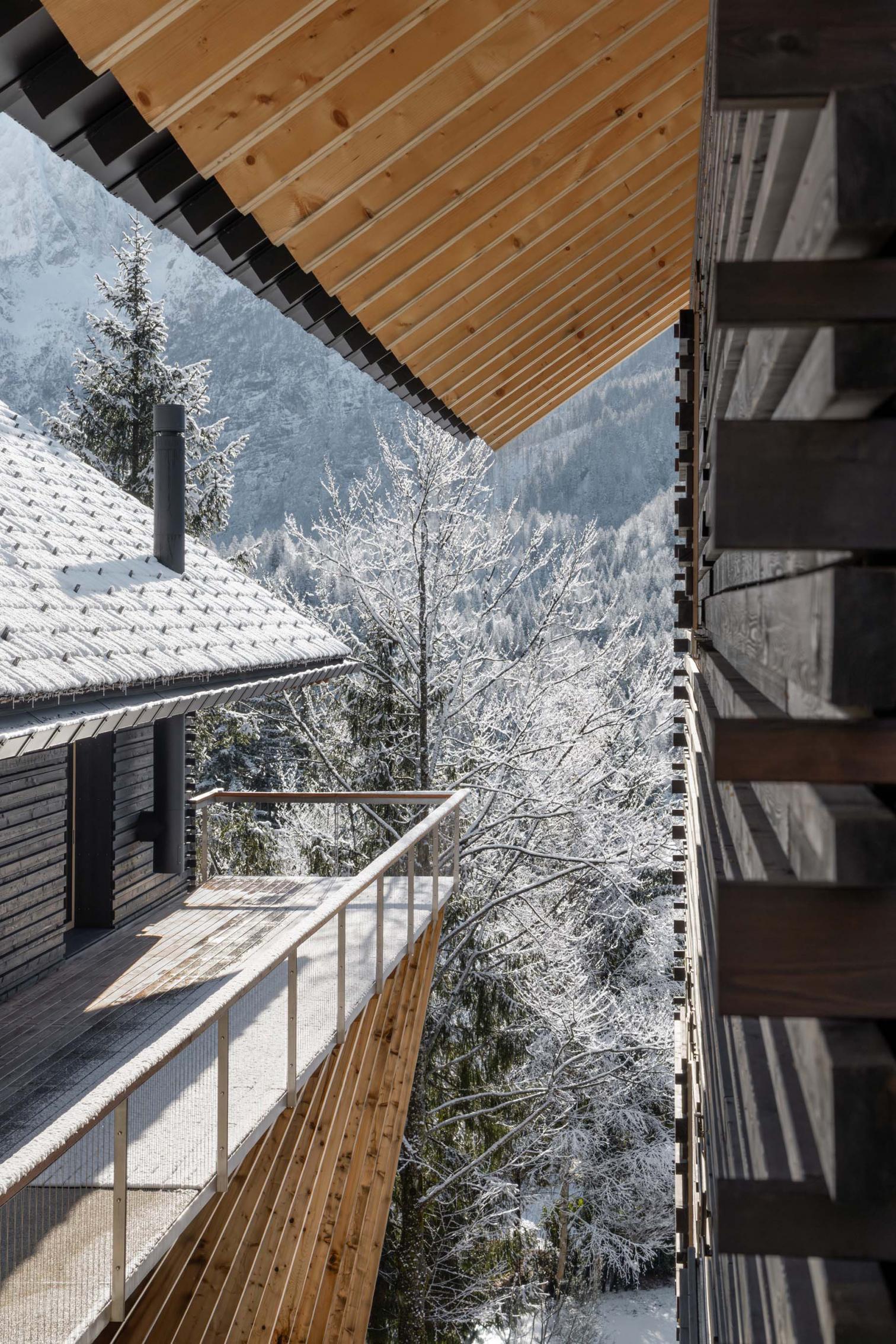 La cubierta flotante, con un pronunciado voladizo, se extiende hacia el paisaje, con piezas de alerce entretejidas en una retícula de protectores metálicos para la nieve, realizados a medida. La terraza lateral, que actúa como un mirador, ofrece vistas al lago.