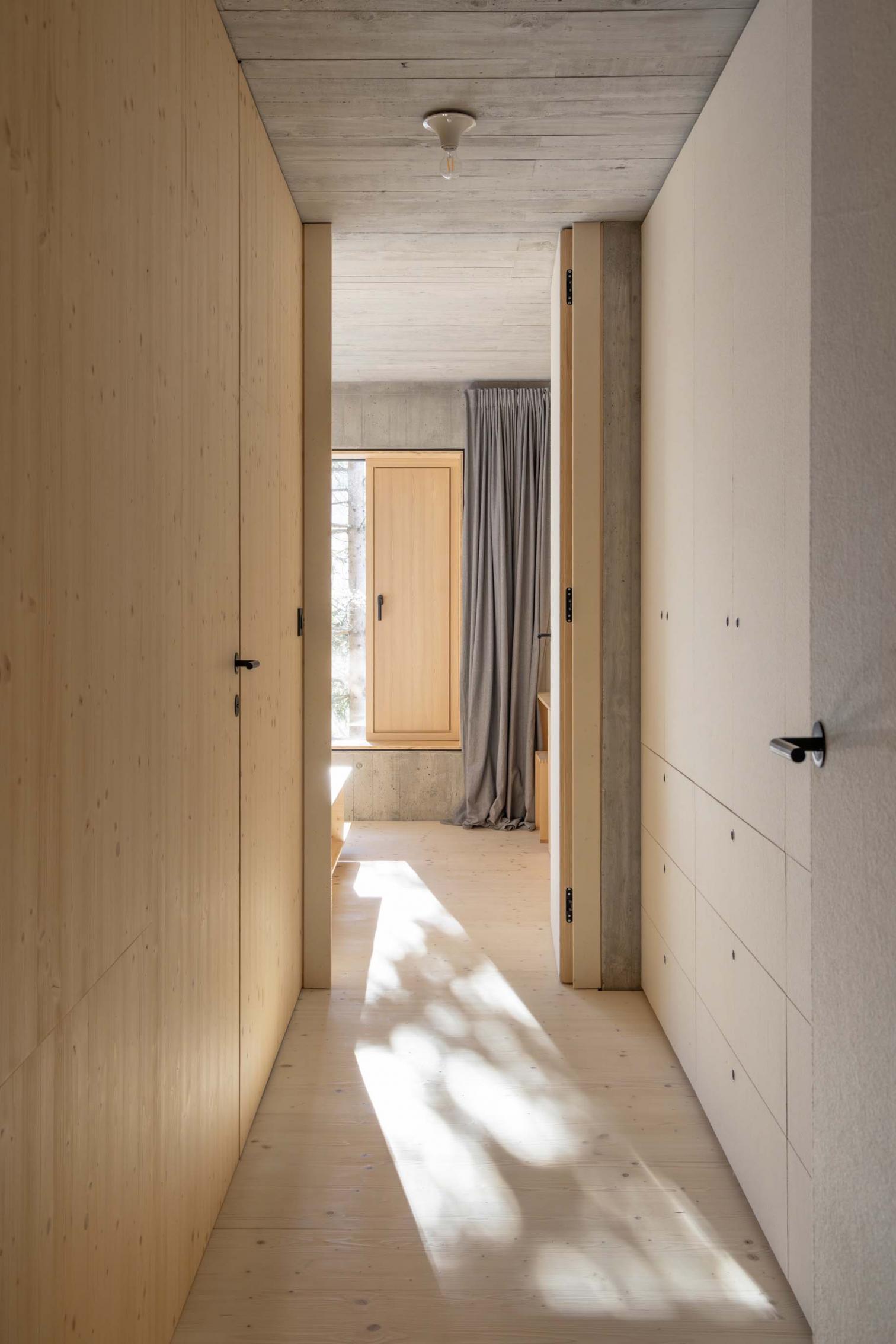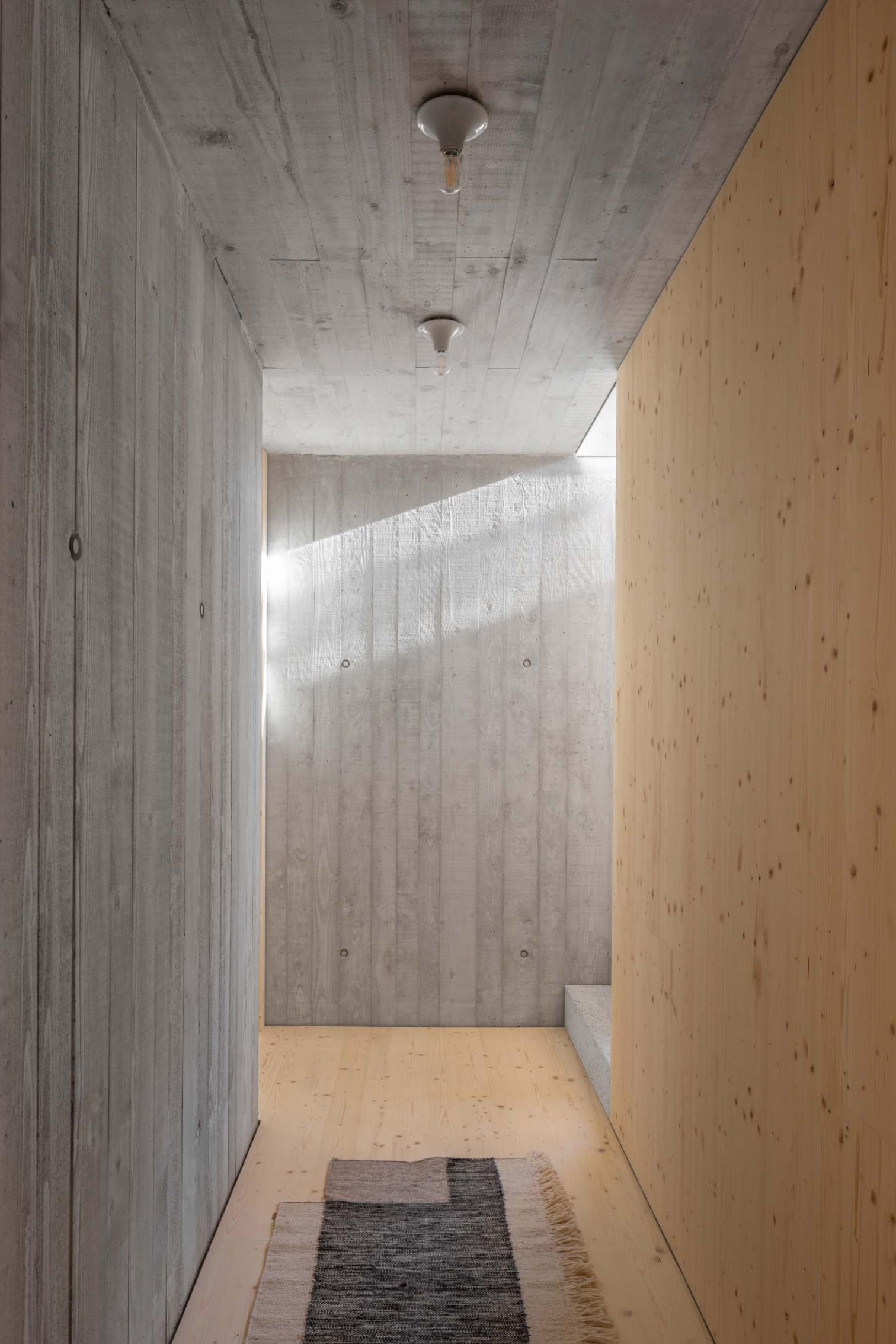 La fachada de madera oscura refleja la tradición de las casas locales. La forma longitudinal del volumen se acentúa aún más con una disposición horizontal de tablones de alerce con cuatro dimensiones ligeramente diferentes. La disposición en cruz en las esquinas suaviza la transición entre lo sólido y el vacío, entre la edificación y el paisaje.
