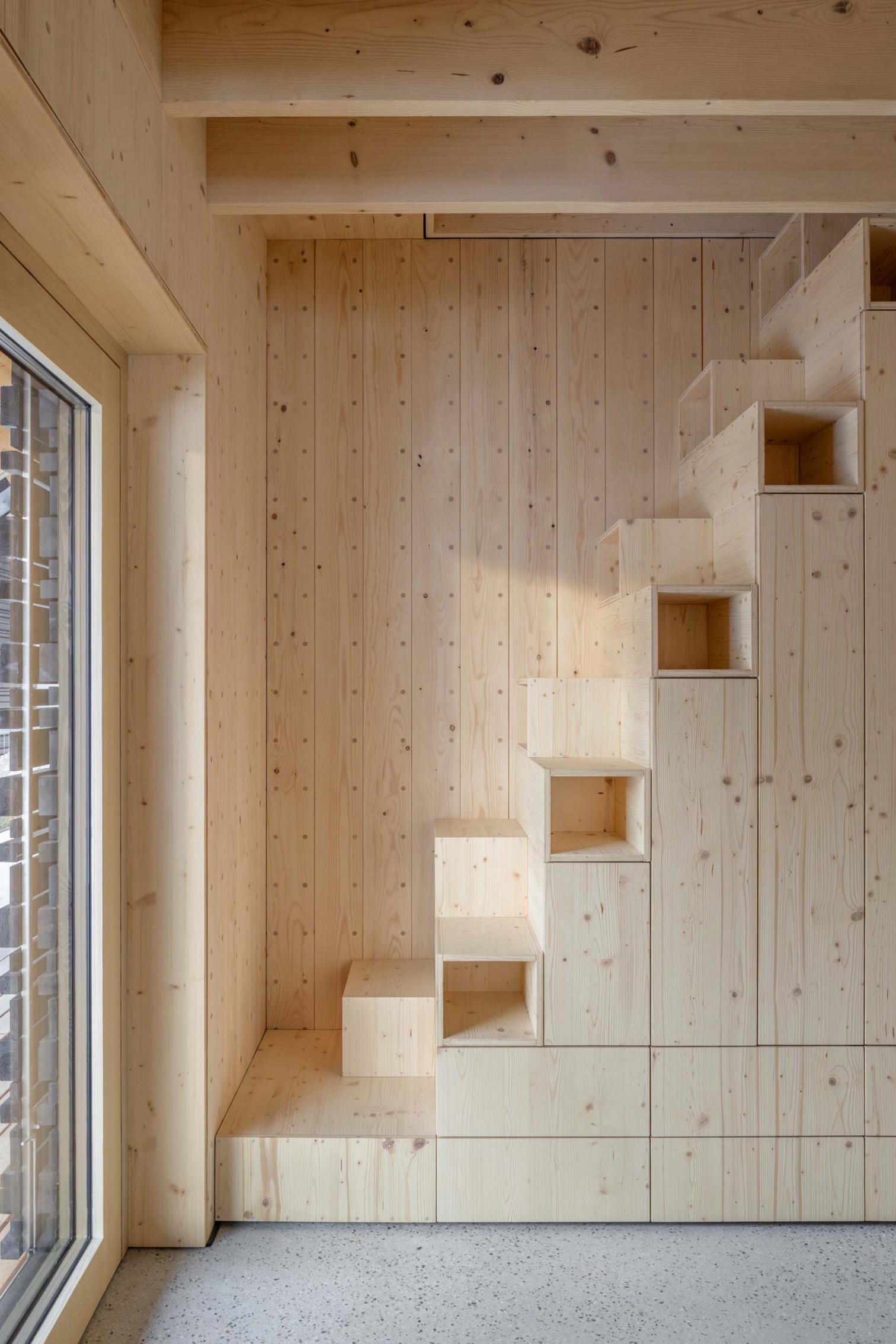 La estructura se divide en dos niveles: el inferior, de hormigón, y el superior, de madera, utilizando una técnica de madera maciza laminada ensamblada sin adhesivos perjudiciales, lo que subraya un compromiso ecológico. Este proyecto no solo redefine la arquitectura local, sino que promueve la conservación sostenible del patrimonio arquitectónico.