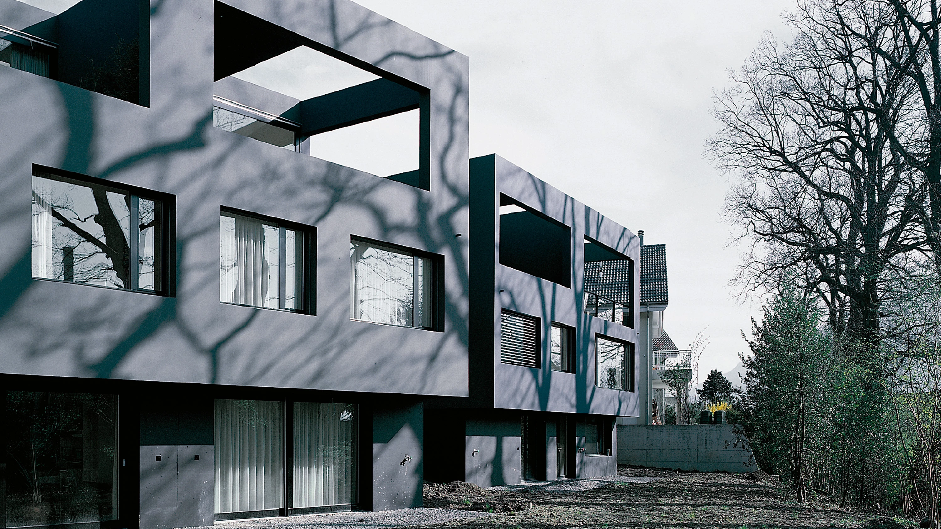 Un apacible barrio de villas con generosos jardines a las afueras de Lucerna está siendo objeto de un proceso de densificación levantando en las parcelas unidades adicionales de vivienda exenta. Para no perturbar la fisonomía actual de la colonia —configurada a partir de cuerpos aislados entre la vegetación— cuatro nuevas viviendas han sido agrupadas en dos casas dobles que procuran desde su geometría conservar las ventajas de las villas aisladas circundantes. La forma del solar inspiró dos cuerpos de planta trapezoidal que se giran levemente entre sí para afirmar su independencia. La fuerte pendiente del terreno permitió repartir la superficie edificada en tres alturas, concentrando las entradas en el nivel intermedio. En la parte alta del solar, un camino de acceso delimitado por muretes tiende pequeñas pasarelas de madera hacia las viviendas que salvan el desnivel existente, confiriendo a la vez una privacidad a los jardines difícil de conseguir dentro de la densidad propuesta.