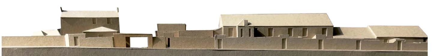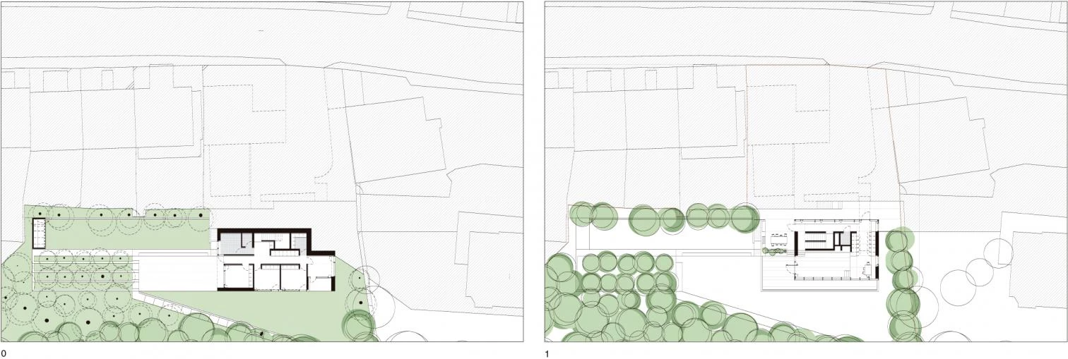 La casa 1, de cuatro plantas, sigue la configuración de las viviendas individuales y se separa veinticinco metros de la calle. Debido a la pendiente del terreno, el acceso se sitúa en la segunda planta, independizando las habitaciones privadas en los niveles superiores y los espacios comunes en la altura inferior. Por su parte, la casa 2 continúa la alineación de las viviendas adosadas, aprovechando el muro existente como límite de la propiedad e introduciendo luz y ventilación en el nivel inferior a través de un patio inglés. En ambos casos se propone una construcción tradicional de ladrillo con un recubrimiento continuo de cal y cemento que genera una textura uniforme en sintonía con las construcciones del entorno.