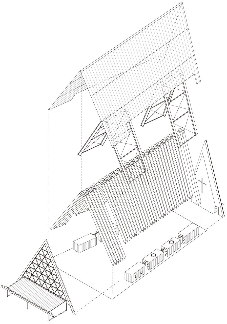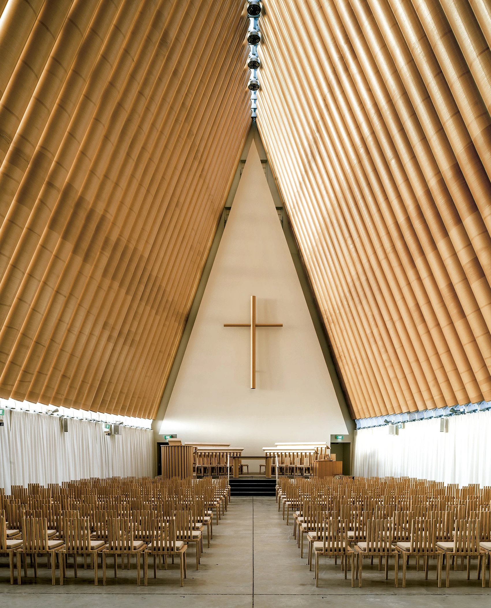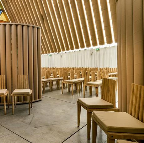 En febrero de 2011 un terremoto castigó con dureza Christchurch, en Nueva Zelanda, matando a doscientas personas y causando graves daños en la catedral neogótica de la ciudad, de más de un siglo de antigüedad. Construido en un plazo muy corto, el edificio temporal que la sustituye tiene una sola nave protegida por una cubierta a dos aguas de faldones muy inclinados que llegan hasta el suelo, dejando libres los dos testeros, de los cuales uno hace de telón de fondo para el altar mientras que el otro funciona como vidriera.