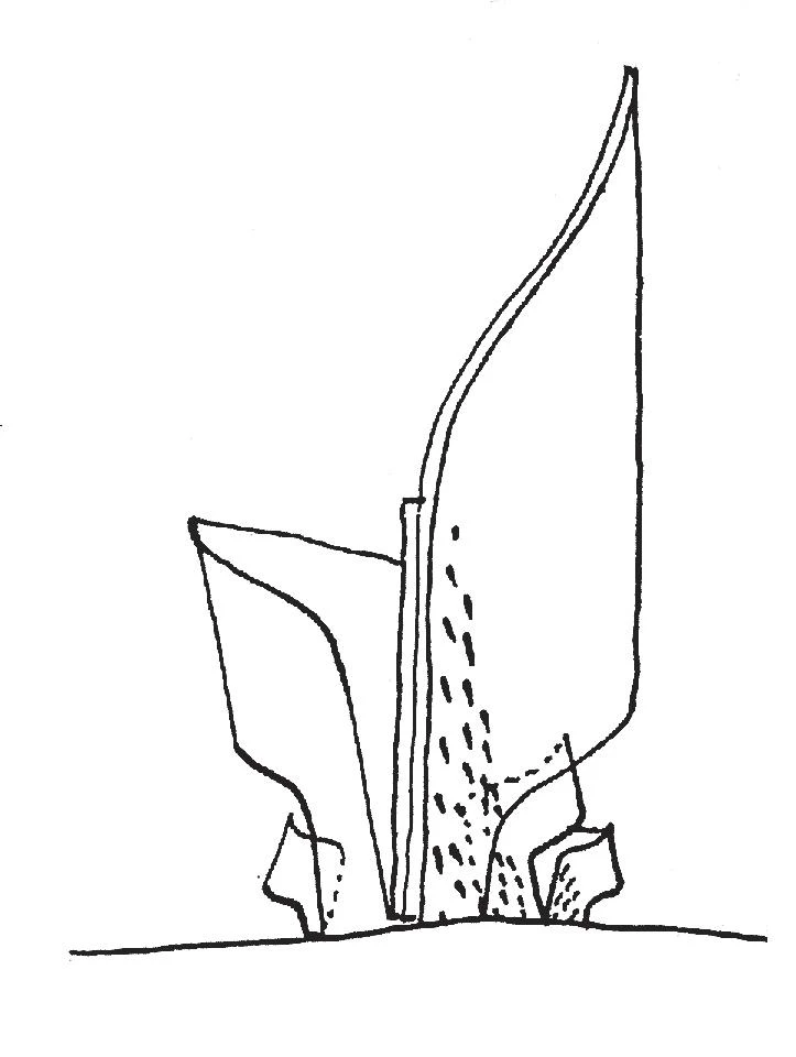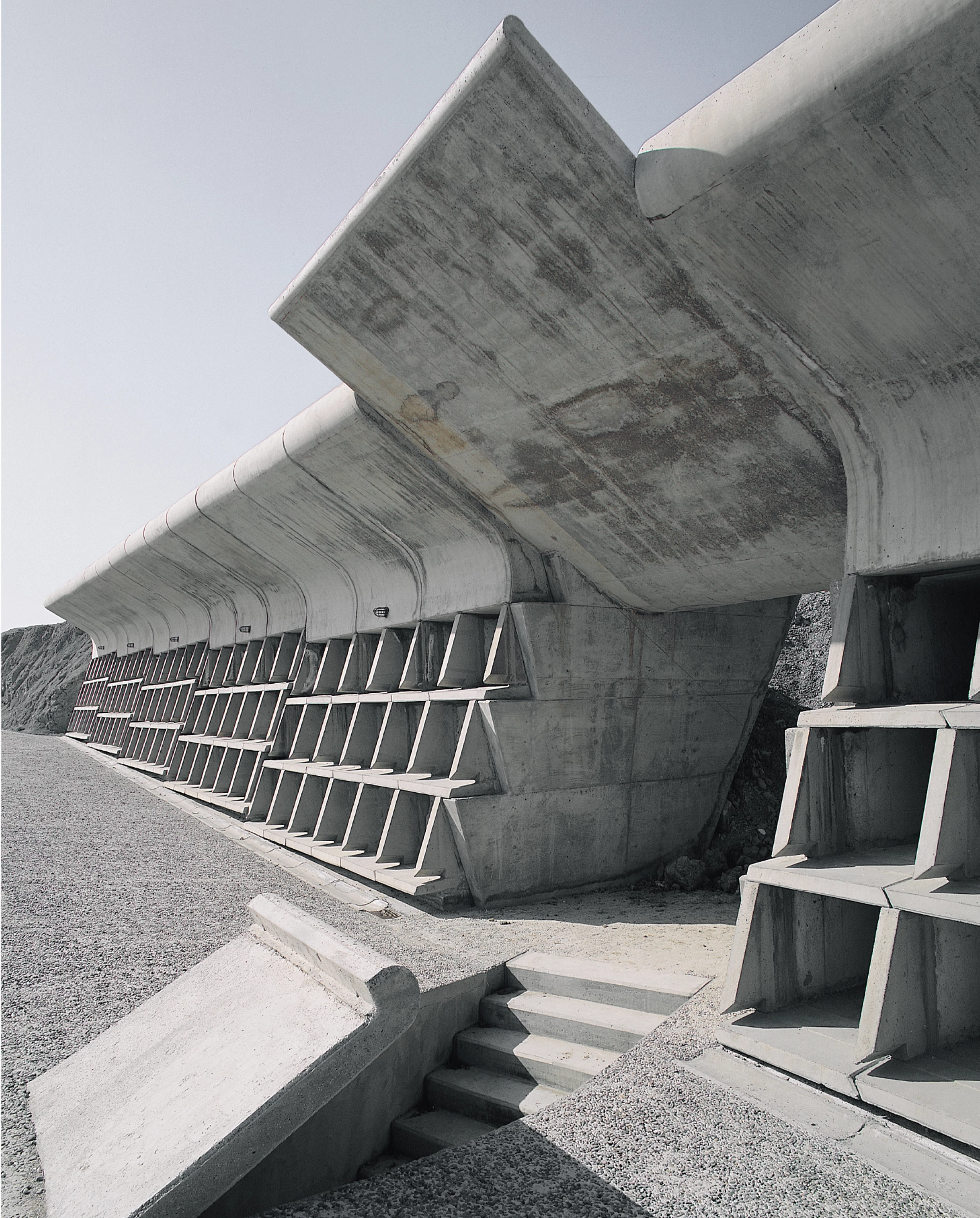 Se asciende por la ladera y se alcanza la excavación que aloja el cementerio. Un cementerio en una fosa, dispuesto como una cantera a cielo abierto. La herida del suelo mantiene el sentimiento de la cantera abandonada, cuyos taludes se desmoronan bajo el tiempo y el sol del Mediterráneo. La excavación concéntrica de gradas permite apoyar contra el terreno los nichos de hormigón, y pasear, como por una ruina, por sus soleadas terrazas. El recorrido concéntrico del cementerio se condensa en una suave bajada hacia un patio central abierto al cielo, un plano inclinado con un pavimento continuo en que afloran apenas grandes tablas que parecen flotar corriente abajo, hacia el remanso del patio. Este río de almas produce una imagen extraordinariamente poética, especialmente cuando se remansa como en un estanque. Es como los ríos que afluyen en el desierto y la arena se traga silenciosamente. Sobre los taludes, los nichos se salen de plomo; a veces como muros de contención, a veces como márgenes vencidas del río de almas. Y los panteones toman el aspecto de los hipogeos del desierto, una imagen insólita junto a los gaviones hidráulicos. Uno de ellos aloja los restos del arquitecto.