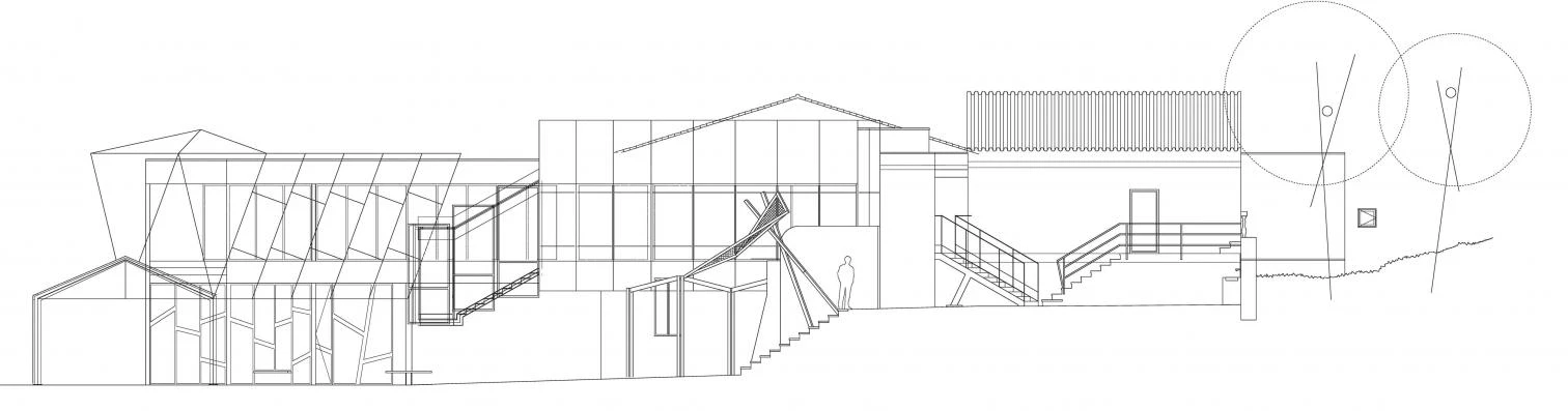 Por otro lado, la galería exterior en forma de T que une los dos cuerpos tiene la función de pasillo entre las diferentes estancias y es tectónicamente diferente a la que existía, al estar sustentada por una estructura metálica cubierta con paneles sándwich. La nueva intervención se ha construido en seco, con materiales semi-industriales que consiguen hacer de un pasillo un filtro entre las habitaciones y el exterior.