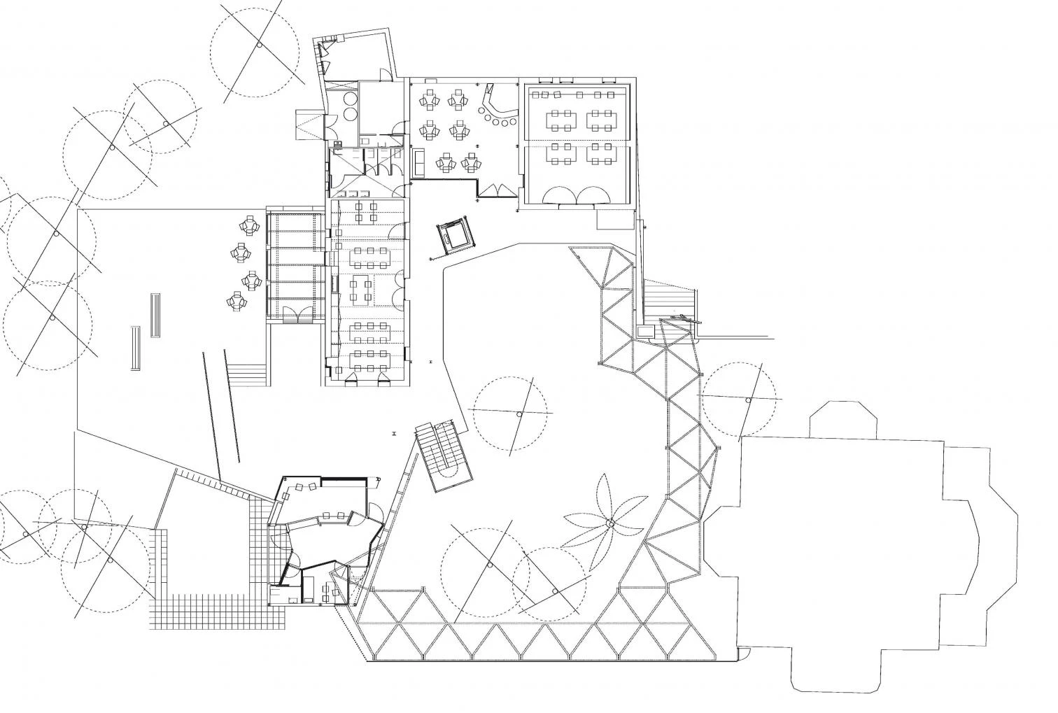 El programa funcional o de necesidades definido por la propiedad contemplaba la ampliación de los dos edificios auxiliares mediante la cubrición del patio que los separa. El proyecto propone un sistema de circulación/pasillo de entrada a los diferentes talleres y a las habitaciones en el primer nivel que envuelve el espacio central del patio, cubierto con un cerramiento ligero. Este pasillo funciona como transición entre el interior de los talleres y el patio. La incorporación de estas habitaciones al programa existente permitirá concentrar las actividades internas y de gestión en la edificación principal, y dotar a los pacientes de más espacios en el nuevo edificio.