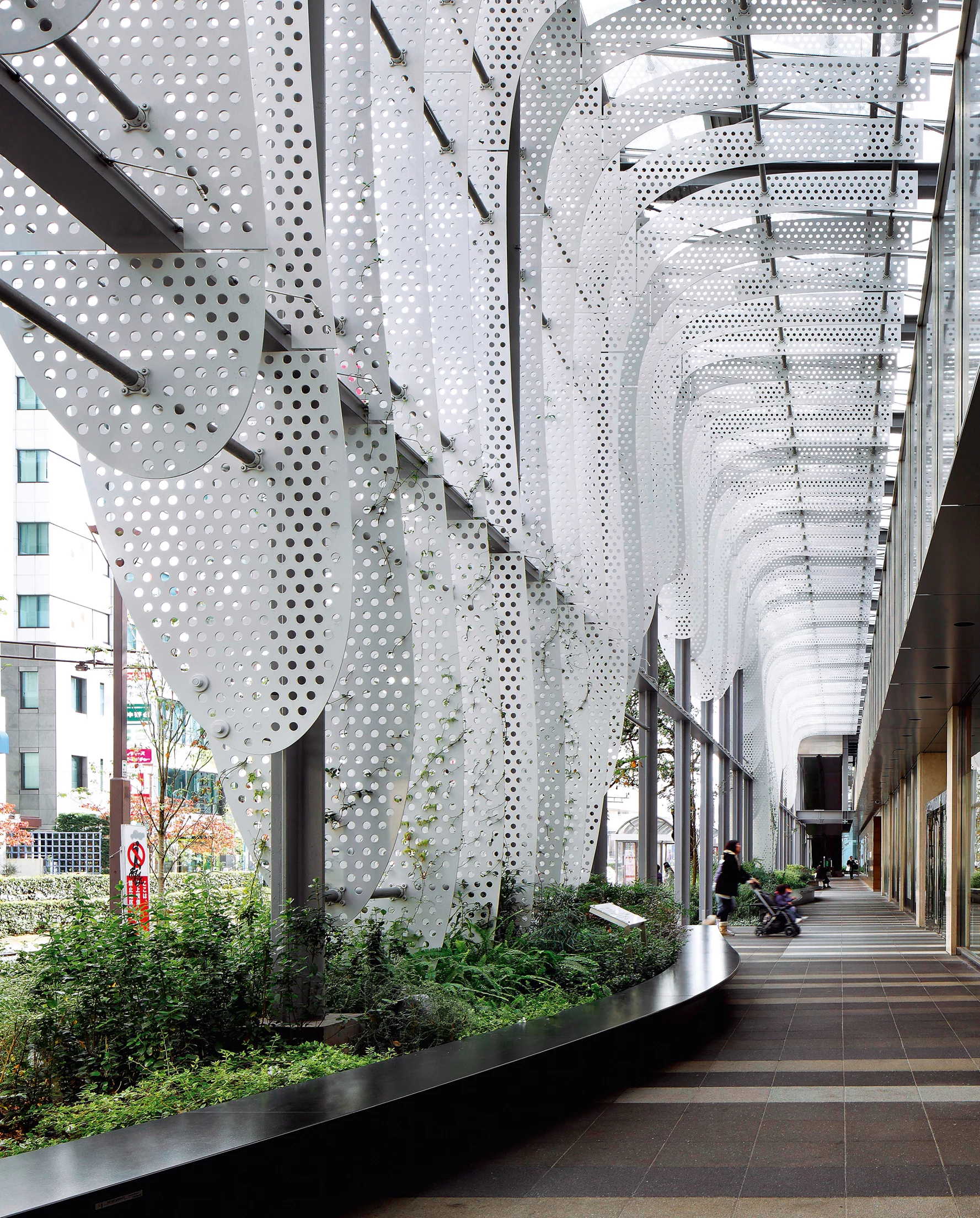 Situado en el barrio residencial de Setagaya en Tokio, el centro comercial Takashimaya se inserta en un tejido urbano de densidad media con amplias avenidas y aceras. La renovación de su fachada, llevada a cabo con motivo de su cuarenta aniversario, tiene el objetivo de crear un espacio transitable lleno de luz y vegetación protegido del sol directo y de la lluvia. A lo largo de los 140 metros del frente principal, una sucesión de lamas metálicas dispuestas transversalmente a la fachada establece la transición entre el edificio existente y los árboles de la calle. La vegetación crece entre las lamas blancas perforadas, desde el cerezo silvestre en planta baja hasta un jardín de rosas en el tercer nivel. Así, la nueva fachada funciona, además, como filtro verde que renueva el aire, amortigua la contaminación que llega al centro comercial y protege a los peatones del tráfico.