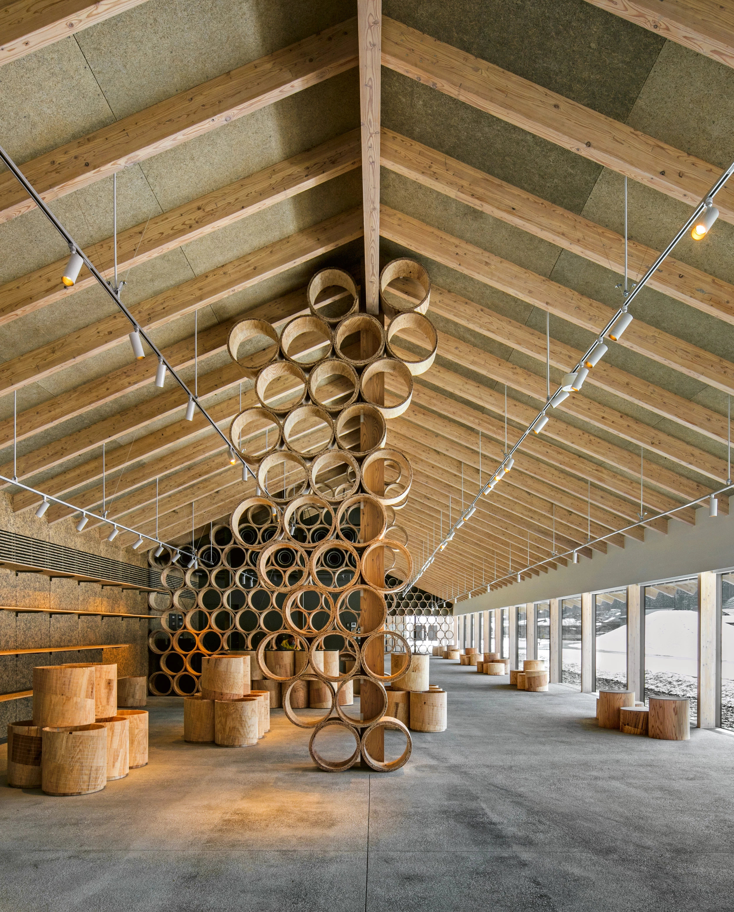 Situada en la prefectura de Akita, junto al Parque Nacional de Towada-Hachimantai, la ciudad de Kazuno es famosa por las aguas termales de Oyu Onsen, que se explotan desde hace más de 800 años. Para mejorar la oferta turística de la región, se decidió construir un centro comunitario que reuniese bajo una gran cubierta continua una tienda, una cafetería y un punto de información, acompañados por un estanque, un biotopo y un auditorio al aire libre. El proyecto incorpora el saber artesanal de la región de Akita a través de una pieza conocida como mage wappa, una canasta cilíndrica que se utiliza habitualmente para transportar comida, y que aquí se reinterpreta para crear tanto particiones transparentes como repisas o estanterías. Fabricados con chapa de madera laminada, los cilindros se ensamblan entre sí dando lugar a un patrón repetitivo que aporta una imagen característica y añade variedad al gran espacio longitudinal.