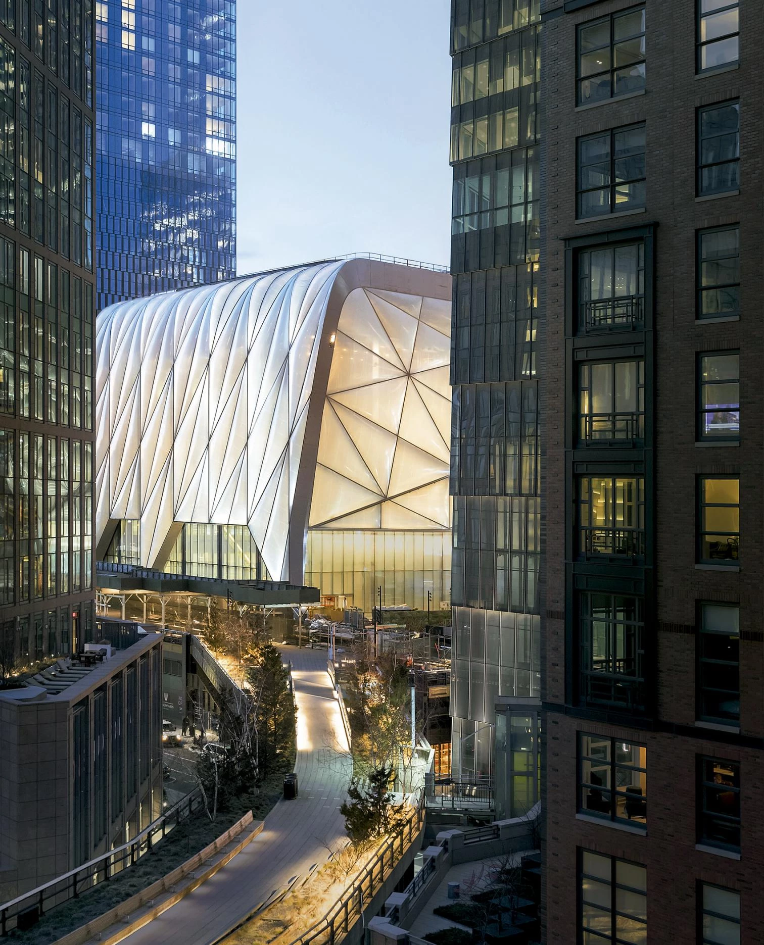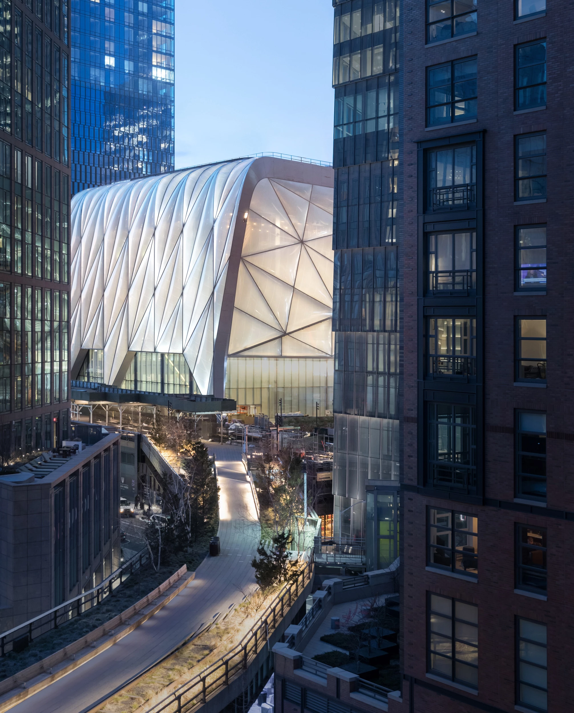 En el extremo occidental de Manhattan, donde el High Line se encuentra con los Hudson Yards, Diller Scofidio + Renfro, en colaboración con Rockwell Group, ha construido The Shed, un colosal centro de creación e investigación artística. Con seis niveles dedicados a la programación cultural y a las artes visuales, y cubierto por una carcasa móvil que puede colonizar la plaza adyacente generando un espacio para intervenciones de gran escala, el complejo se incrusta en la base de una torre residencial anexa y ofrece un amplio abanico de posibilidades de configuración, lo que garantiza su adaptación a las necesidades futuras.