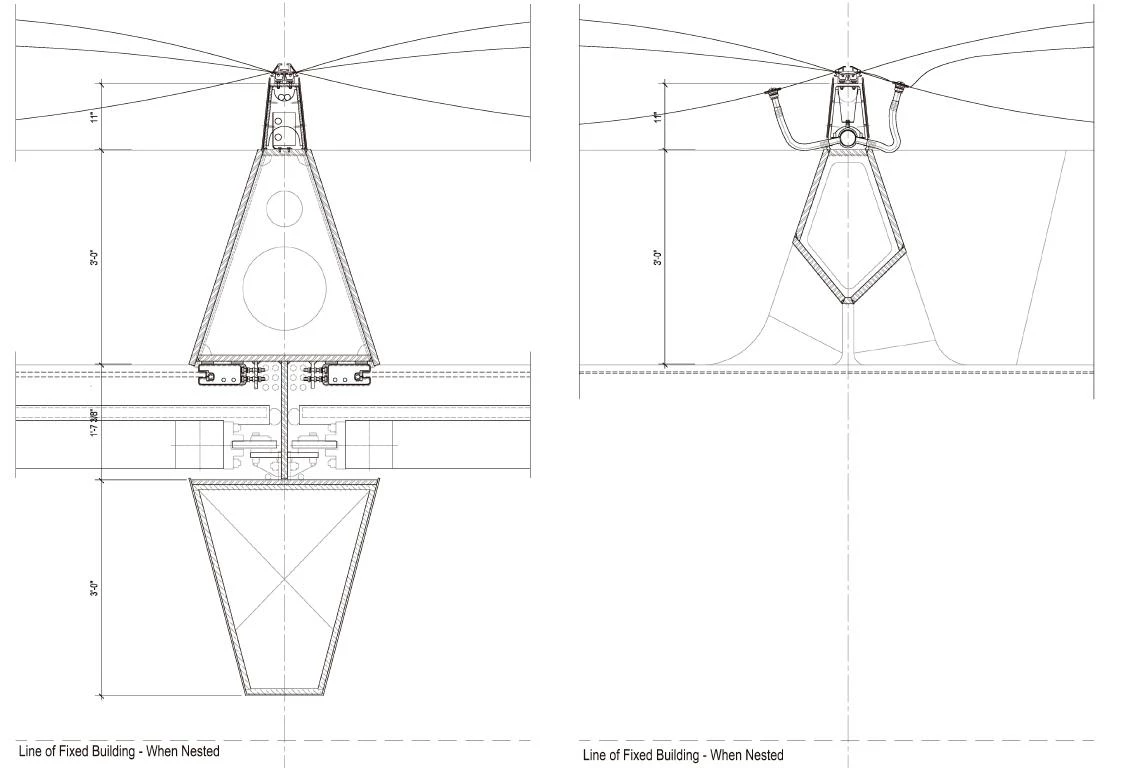La nave cuenta con una gran cubierta telescópica que al desplegarse, deslizándose desde su posición inicial sobre el edificio base a lo largo de unos rieles para colonizar la plaza contigua, duplica la huella del centro, incorporando 1.600 metros cuadrados.