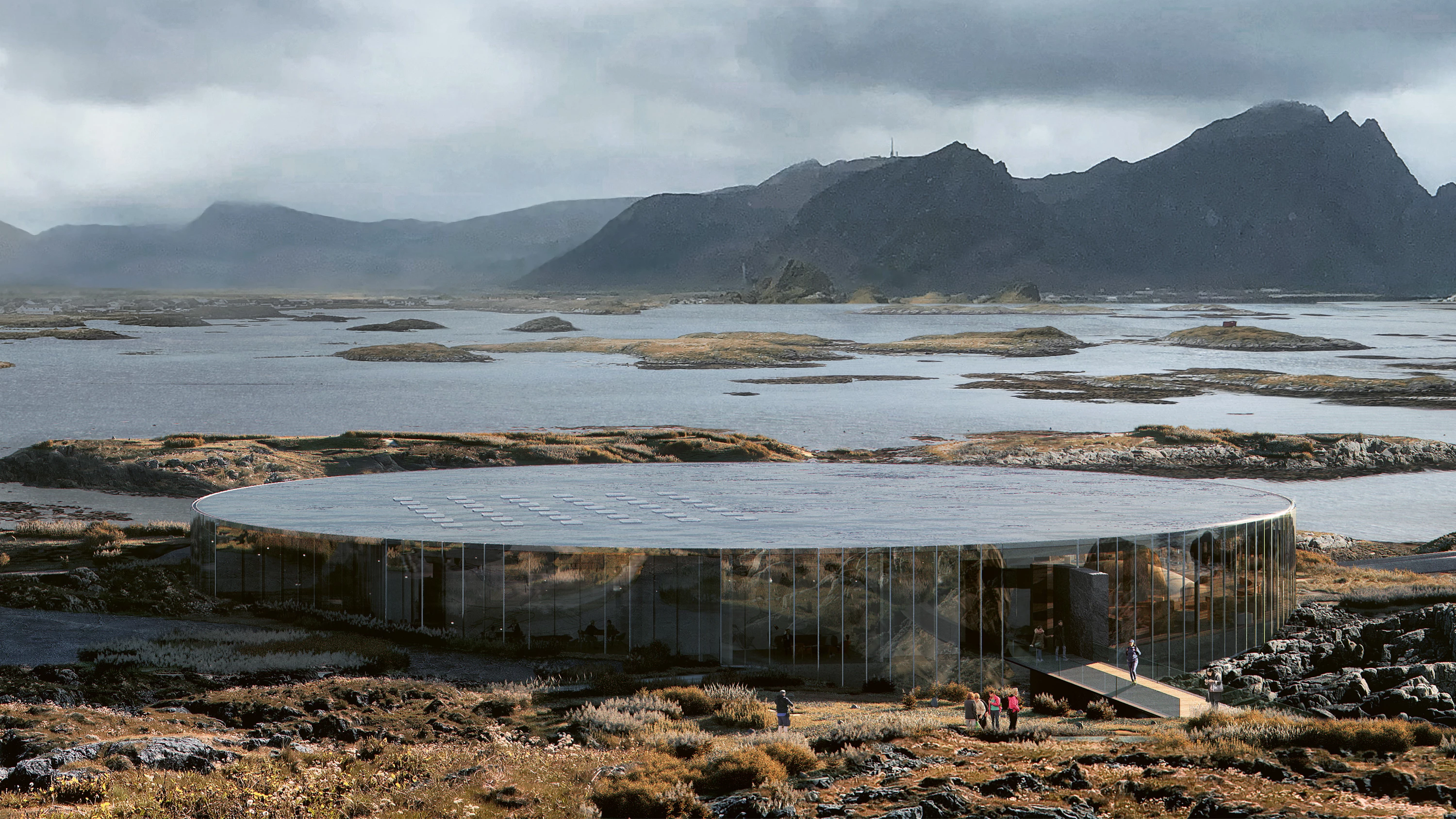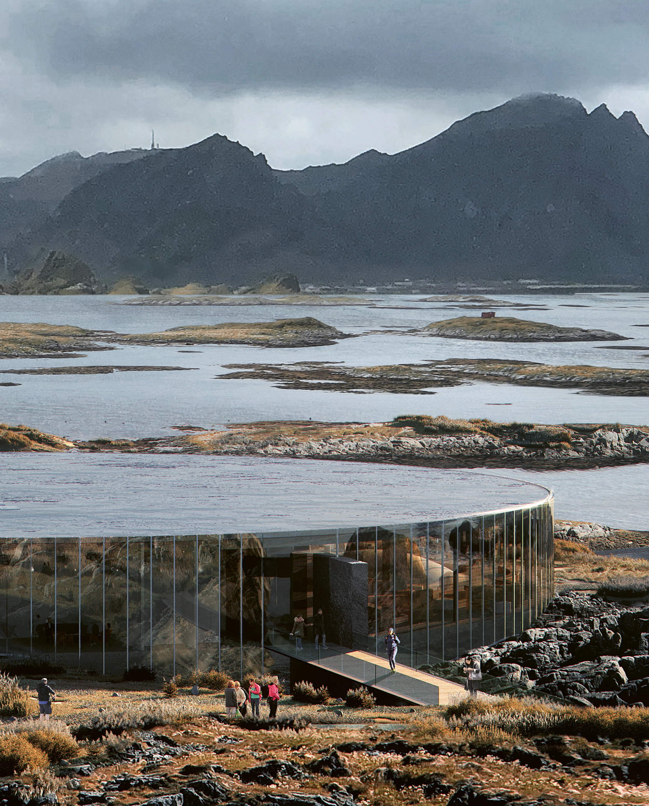 El edificio parte de dos ejes: uno horizontal —un círculo de superficie reflectante donde el mar y las montañas se encuentran—, y otro vertical, en forma de cilindro, en cuyo interior los visitantes pueden conocer la vida de las ballenas también en las profundidades... [+]