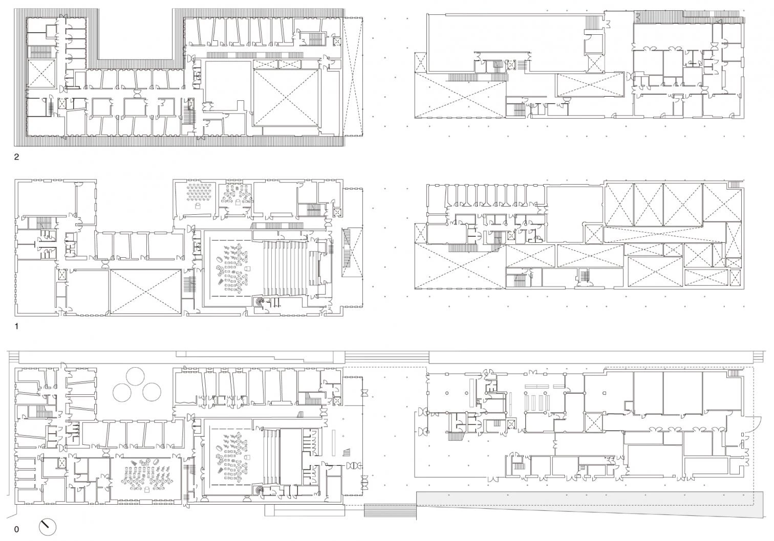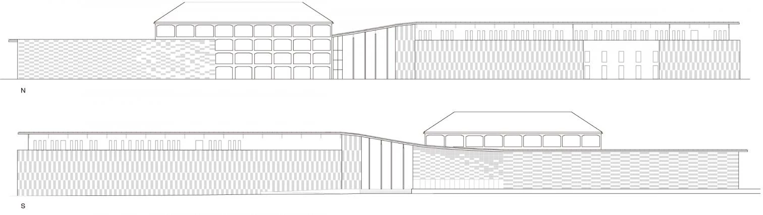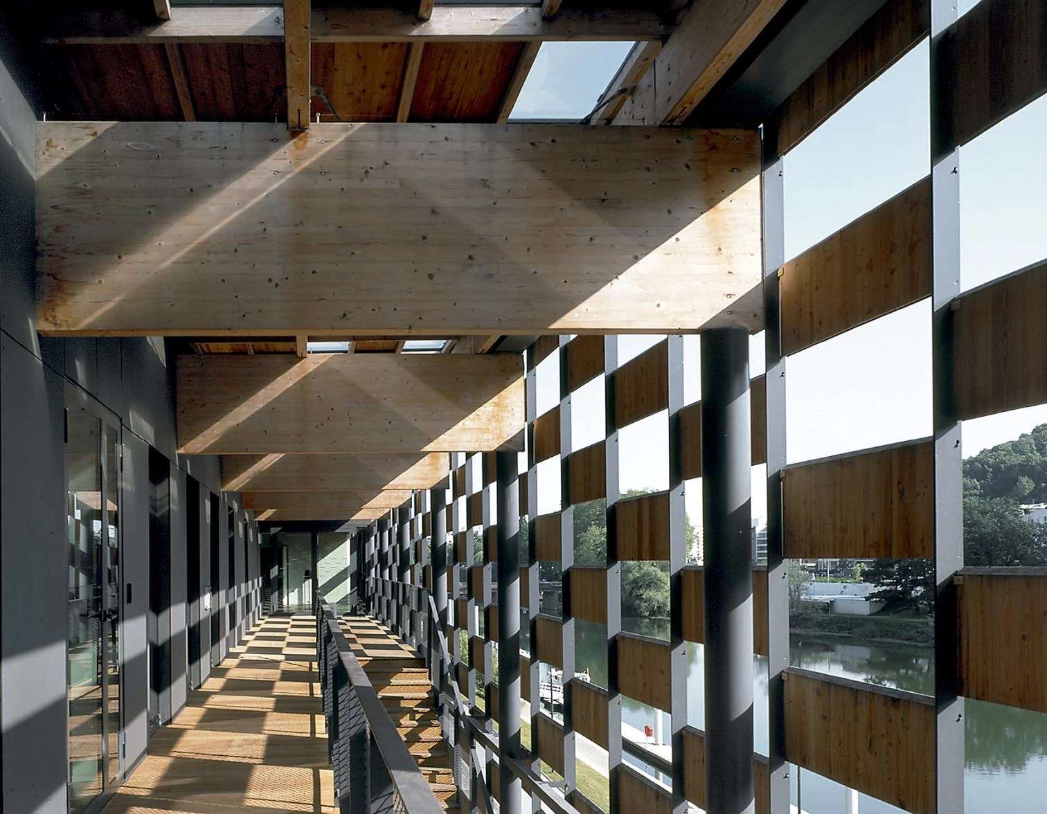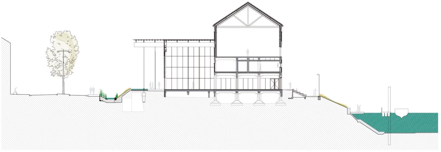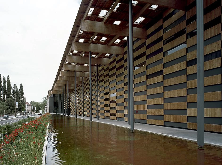 Al borde del río Doubs, a los pies de la ciudadela de Besançon, fortaleza construida en el siglo xvii por Vauban, se asienta el centro de las artes y la cultura. Un lugar percibido a lo largo de la historia como una barrera física por sus habitantes, tanto por su condición de límite con el río como por su pasado industrial. Dos volúmenes cerrados albergan los dos programas del complejo, el centro de arte de Besançon que incluye una galería de las colecciones regionales FRAC y una escuela de arte; y la ciudad de la música, un conservatorio con su propio auditorio. Una gran cubierta calada recoge e unifica estos programas creando un espacio al aire libre entre ambos que funciona como puerta monumental a la ciudad y al mismo tiempo de refugio evocando el espacio bajo los árboles, donde la luz se filtra suavemente a través de las hojas. Este efecto de luz matizada se produce también en el interior gracias a los paneles de vidrio colocados al azar en la cubierta. Sólo rompe la continuidad de la superficie un edificio industrial de ladrillo de los años treinta que se conserva y en el que se sitúa parcialmente el conservatorio. La estructura se resuelve con vigas de madera de 14 centímetros de ancho por un metro de canto que apoyan sobre esbeltas columnas metálicas de 20 centímetros de diámetro y 10 metros de altura.