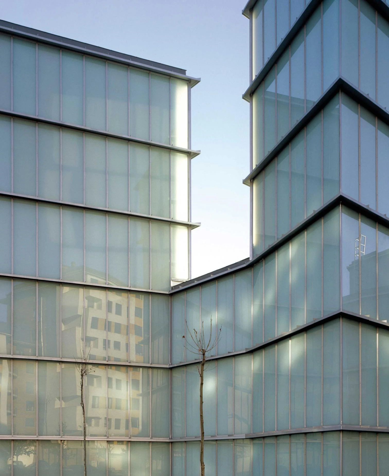 En el exterior, el conjunto envuelve sus paños opacos con vidrios de seguridad translúcidos, coloreados y vitrificados. En el punto de entrada, donde el edificio adopta la disposición de un ágora de forma cóncava que aloja actividades y encuentros, los colores elegidos para teñir el vidrio de la fachada resultan de la digitalización de un trozo del ‘Halconero de la cacería’, la vidriera más antigua de la catedral de León, fechada en el siglo XII.