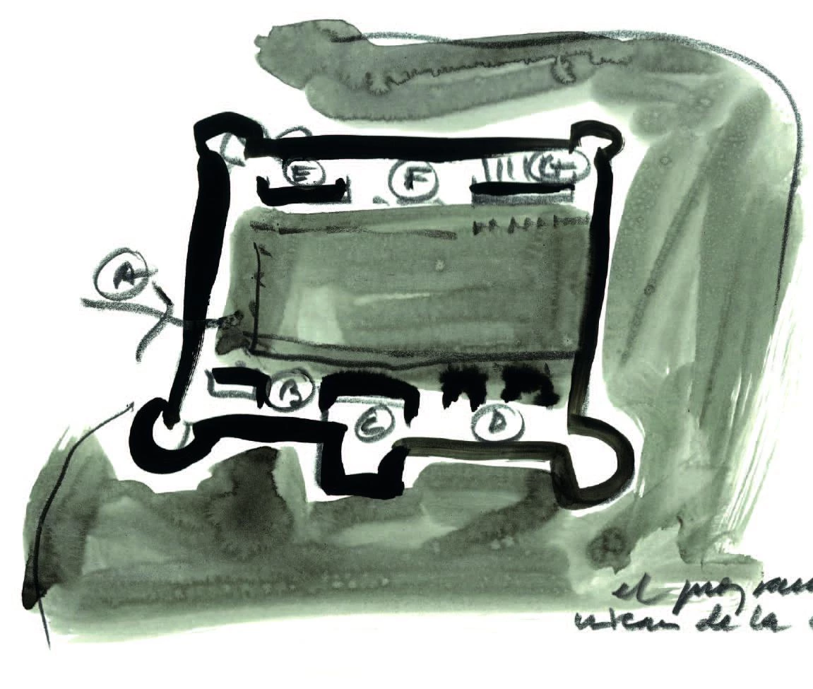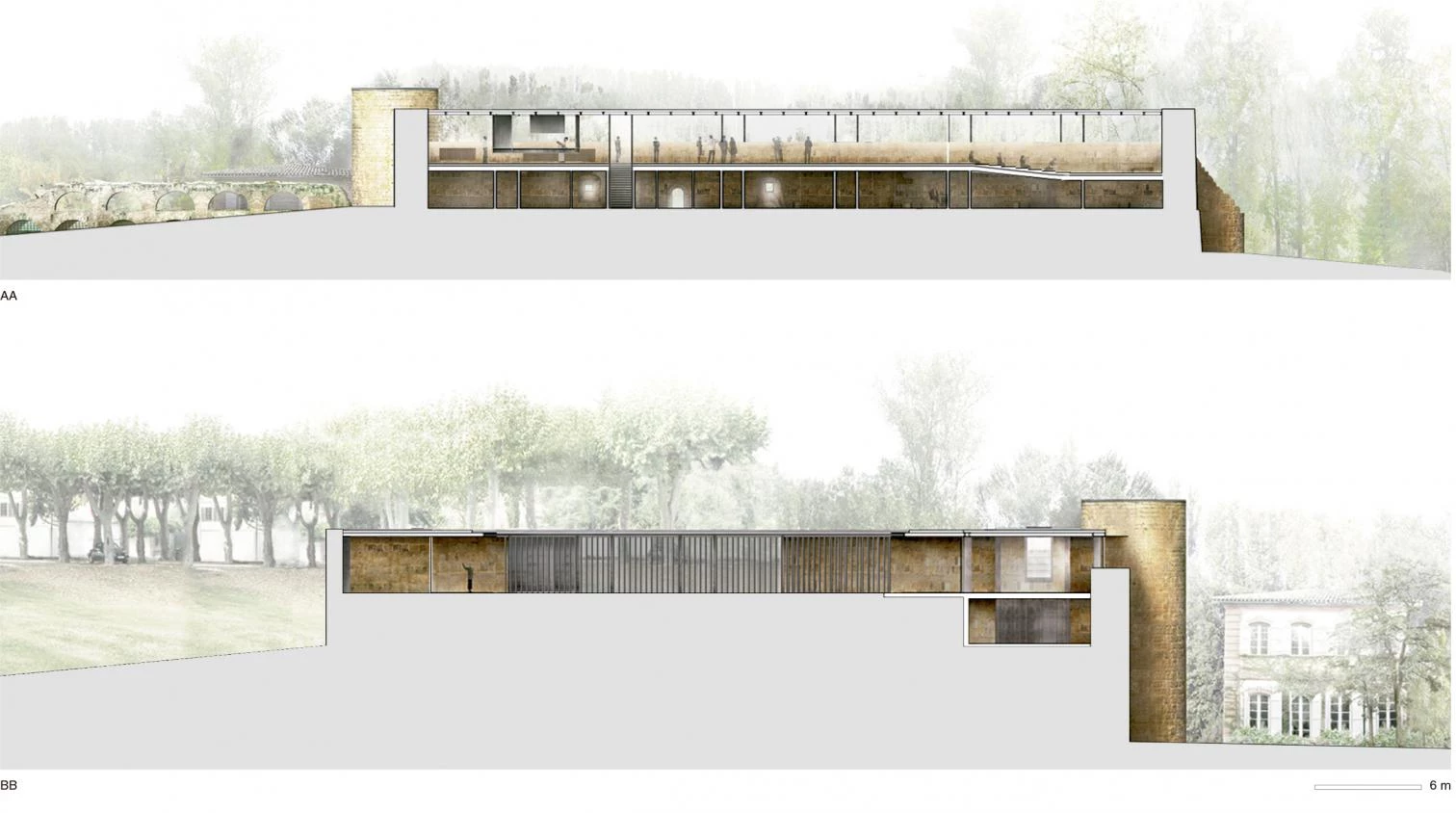 Localizado en la ribera del Aveyron a su paso por Nègrepelisse, una pequeña localidad rural de la región del Midi-Pyrénées francés, el Centro de arte La Cuisine es un espacio cultural dedicado al arte culinario, entendido como una actividad integral ligada al territorio y a la tradición agropecuaria. El centro ocupa el antiguo castillo del pueblo, cuyos orígenes se remontan al siglo XIII. La fortificación, restaurada en 2001, posee una fuerte identidad icónica debido a su perímetro amurallado que envuelve un gran patio de armas. En esta línea, la intervención sobre el castillo refuerza la disposición original, adosando las piezas del programa a tres de sus cuatro lados, para liberar el espacio central y revitalizarlo como punto de conexión y escenario de actividades para todo el pueblo. La intervención, casi imperceptible desde el exterior, minimiza su impacto en el interior a través de la homogeneidad de los materiales empleados: el vidrio y el acero cortén. El acceso al recinto se realiza por el oeste, a través de un pórtico de acero abierto en el muro de piedra, que conduce directamente al patio de armas. En el frente norte se sitúa la banda de mayor crujía con un aula de cocina, una sala de exposiciones y otra de proyecciones o charlas, y hacia el sur se sitúan los espacios de talleres y la administración.