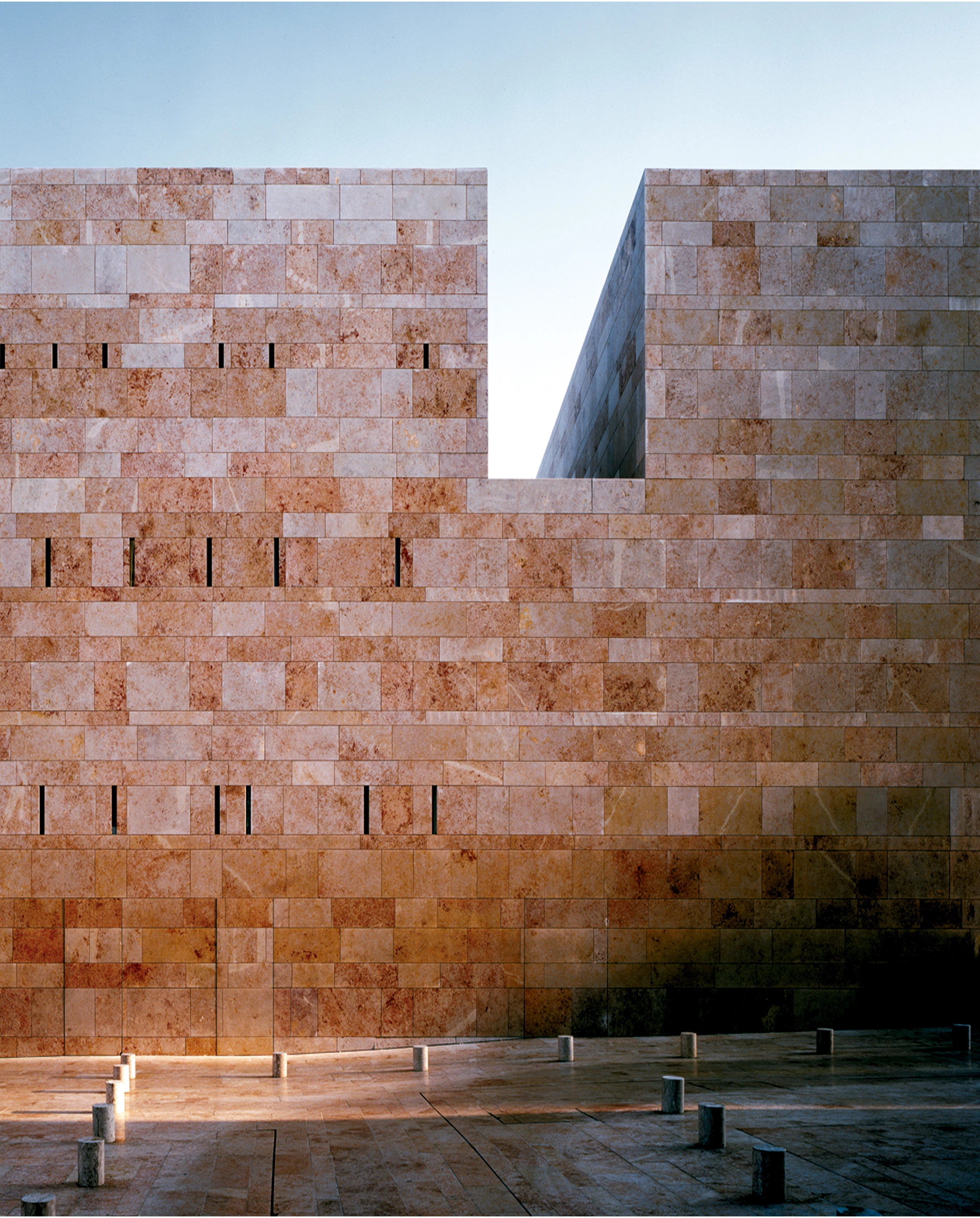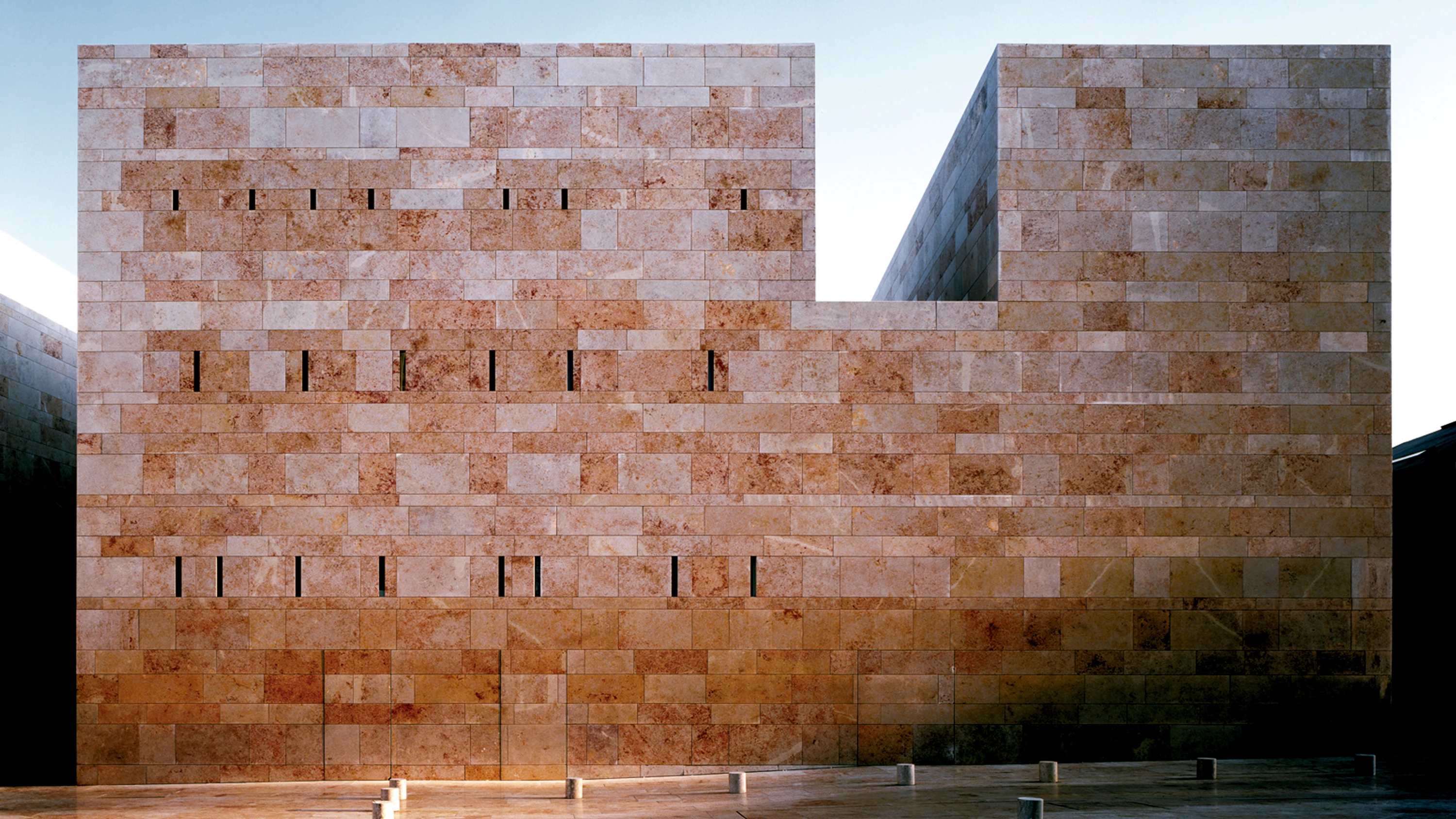 Hacia la parte moderna de la ciudad se construye un frente opaco de piedra caliza, mientras que en las fachadas que dan al casco antiguo unos ventanales corridos llevan el bullicio de la calle al interior del edificio, garantizando la transparencia entre las actividades culturales y la vida cotidiana. La luz natural que también penetra en el interior se refleja en los paramentos blancos y en el suelo, revestido de mármol del mismo color.