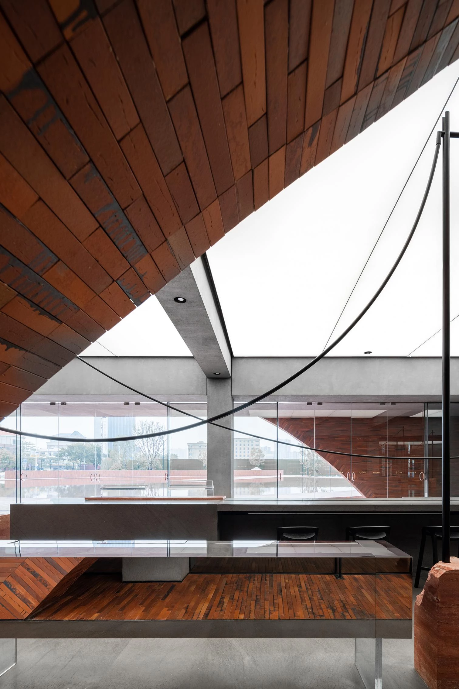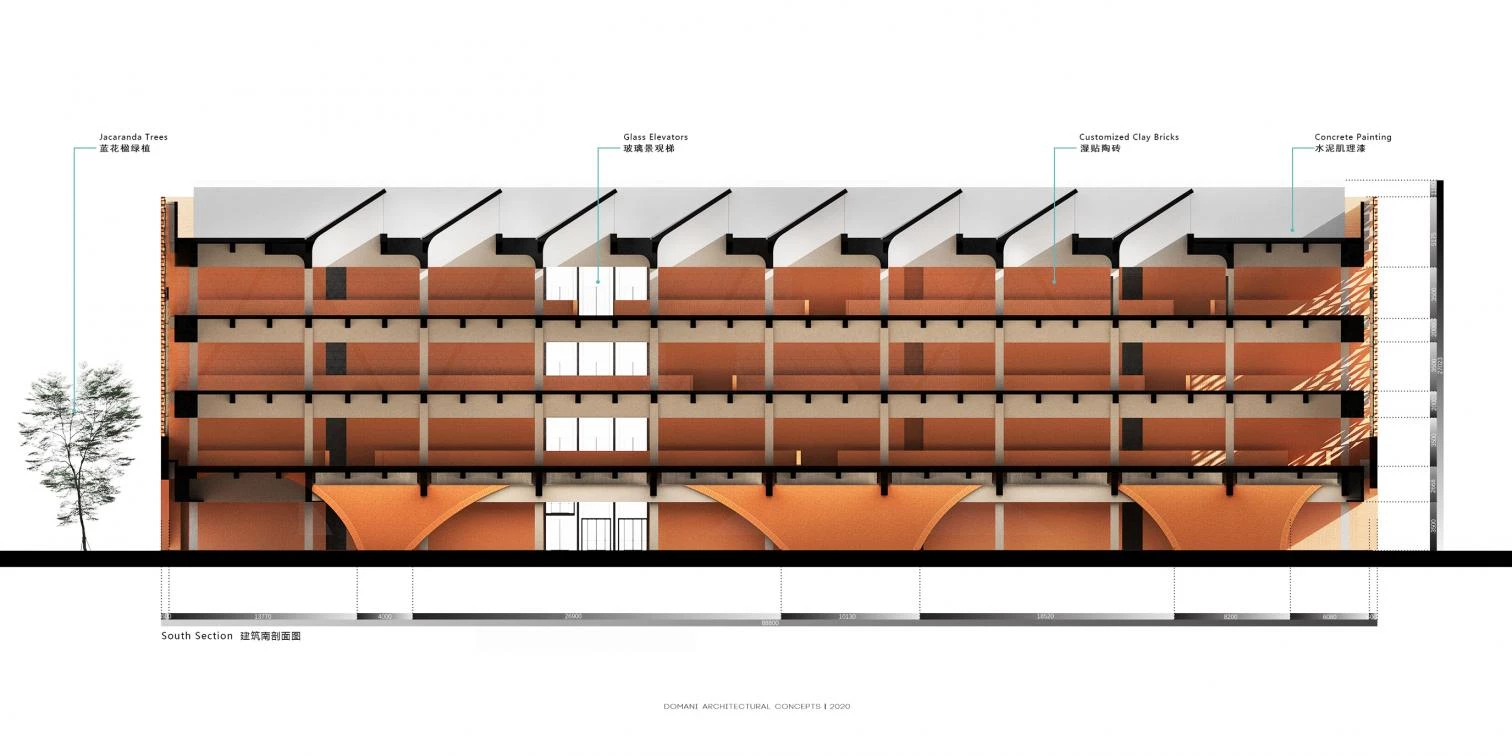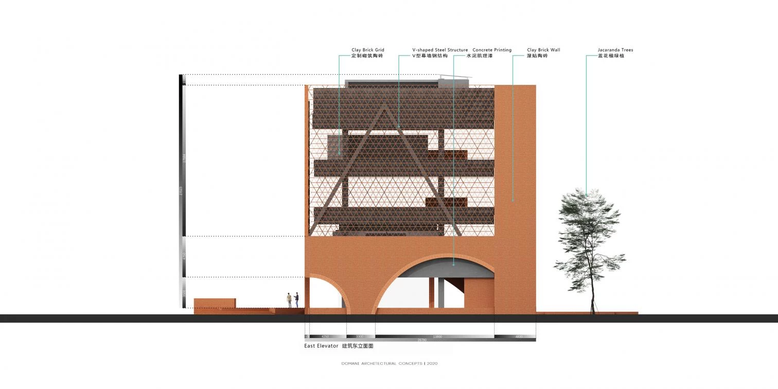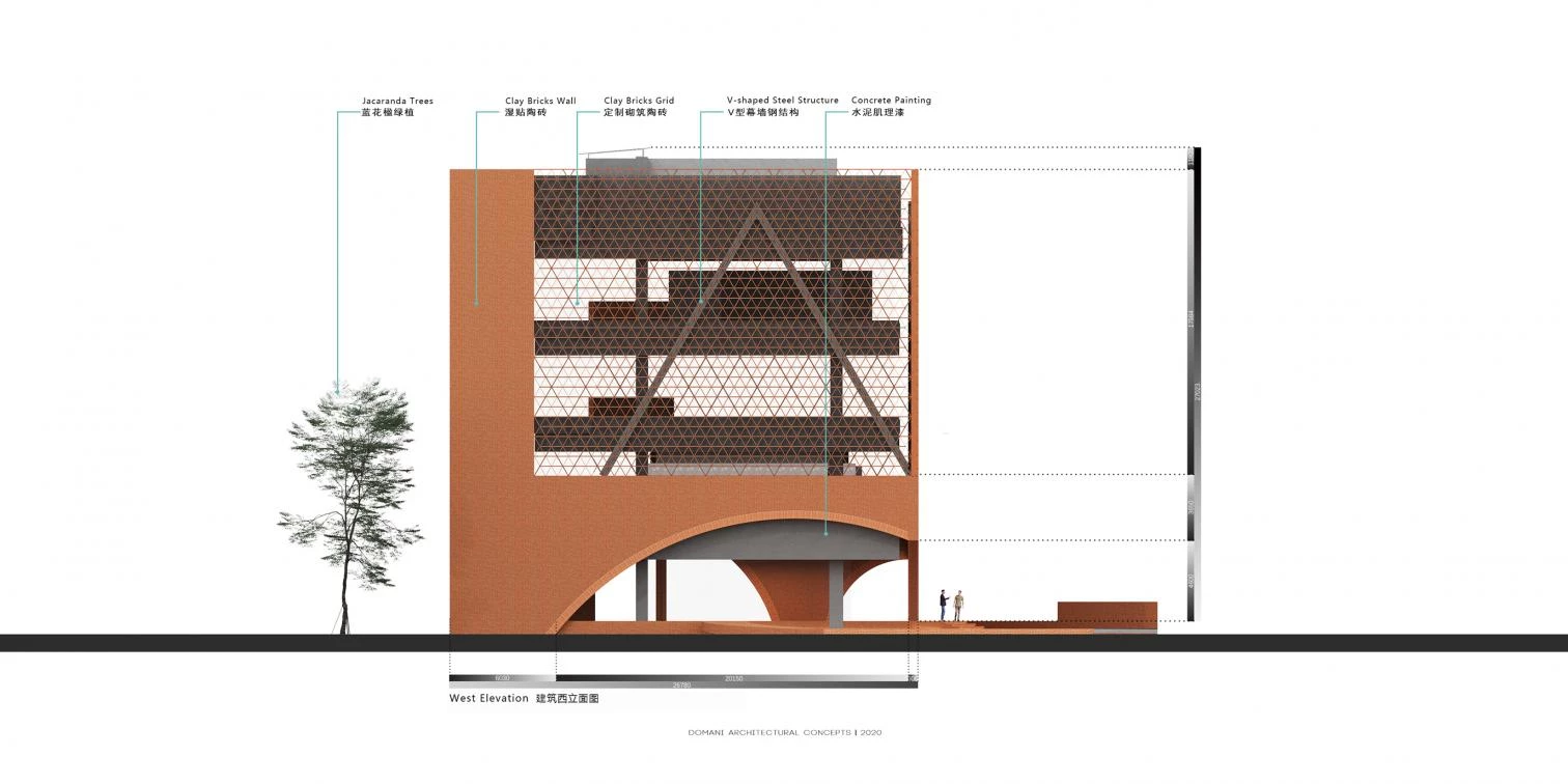 Dirigida por la arquitecta Ann Yu de la firma Domani Architectural Concepts, esta construcción para la compañía Times China está envuelta por celosías de ladrillos de tonos rojizos. Denominado Times I-City o TIC, el edificio contiene salas expositivas, zonas de ventas y oficinas. Las fachadas caladas se construyen utilizando un sistema de muro cortina con módulos cerámicos de triángulos equiláteros conectados por fijaciones ocultas de aluminio. Al exterior, un jardín pavimentado con grava negra incluye un gran estanque circular con una plataforma de observación que se extiende hasta su centro.