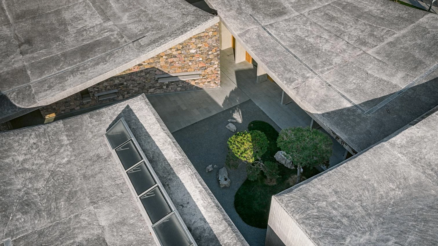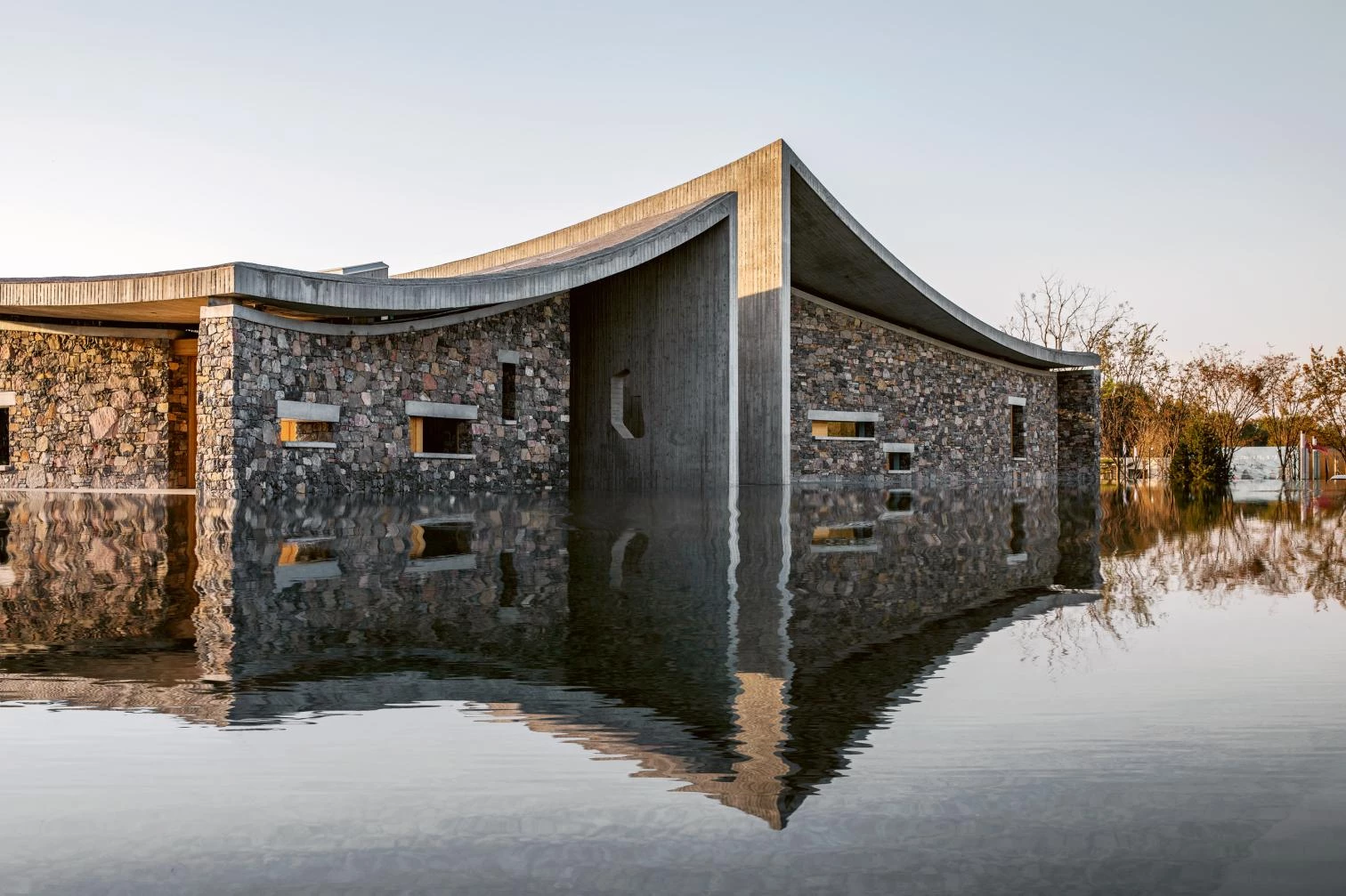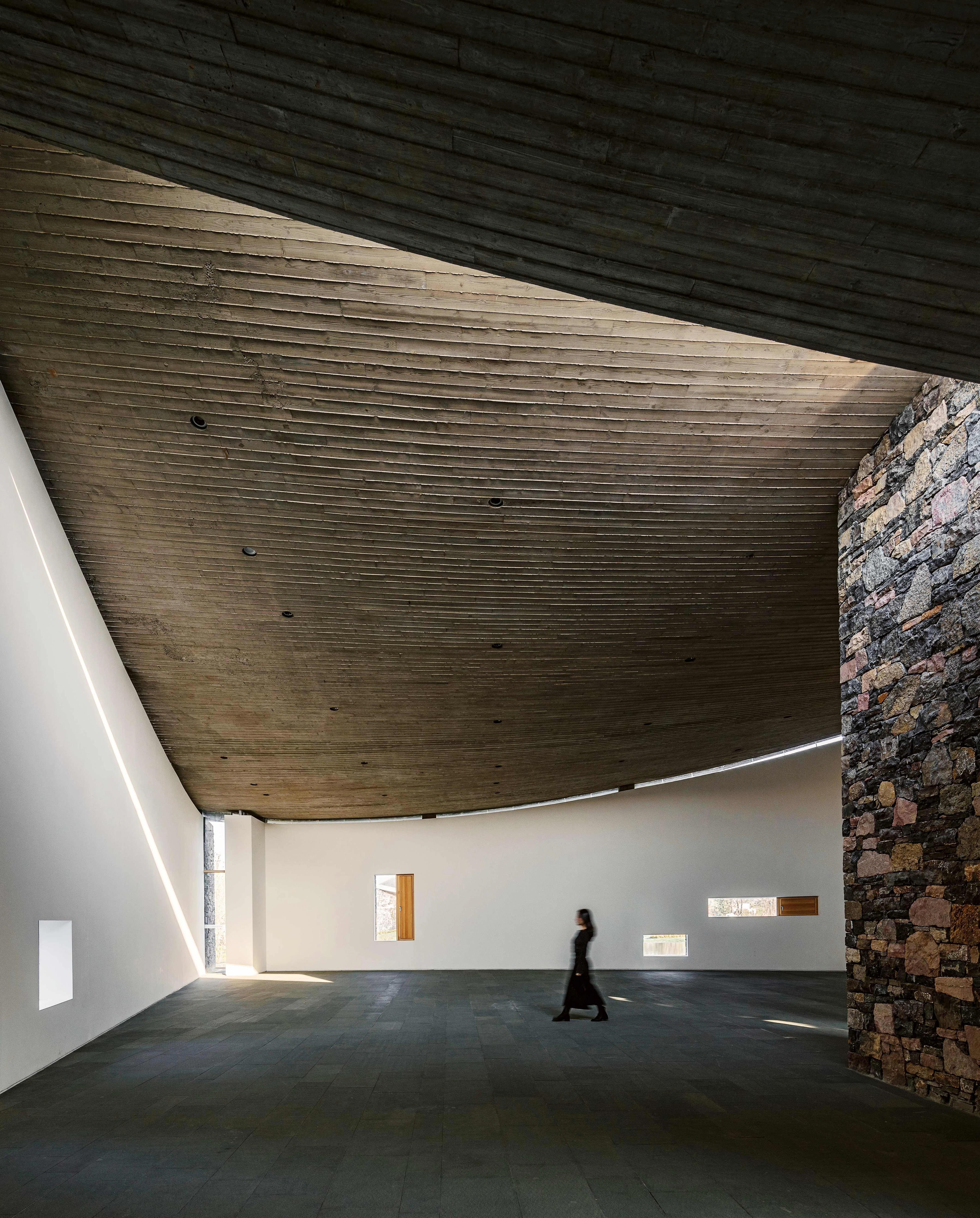 Sobre los muros de piedra, que se conforman junto a una lámina de agua según técnicas características del norte del país, descansan unas cubiertas de hormigón que tensan los espacios interiores con sus suaves formas hiperbólicas.