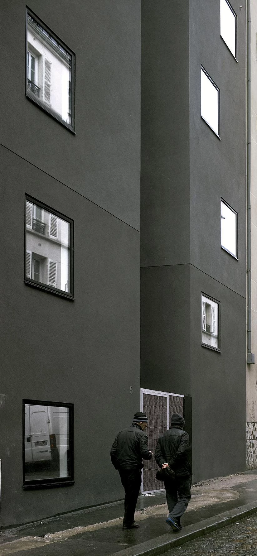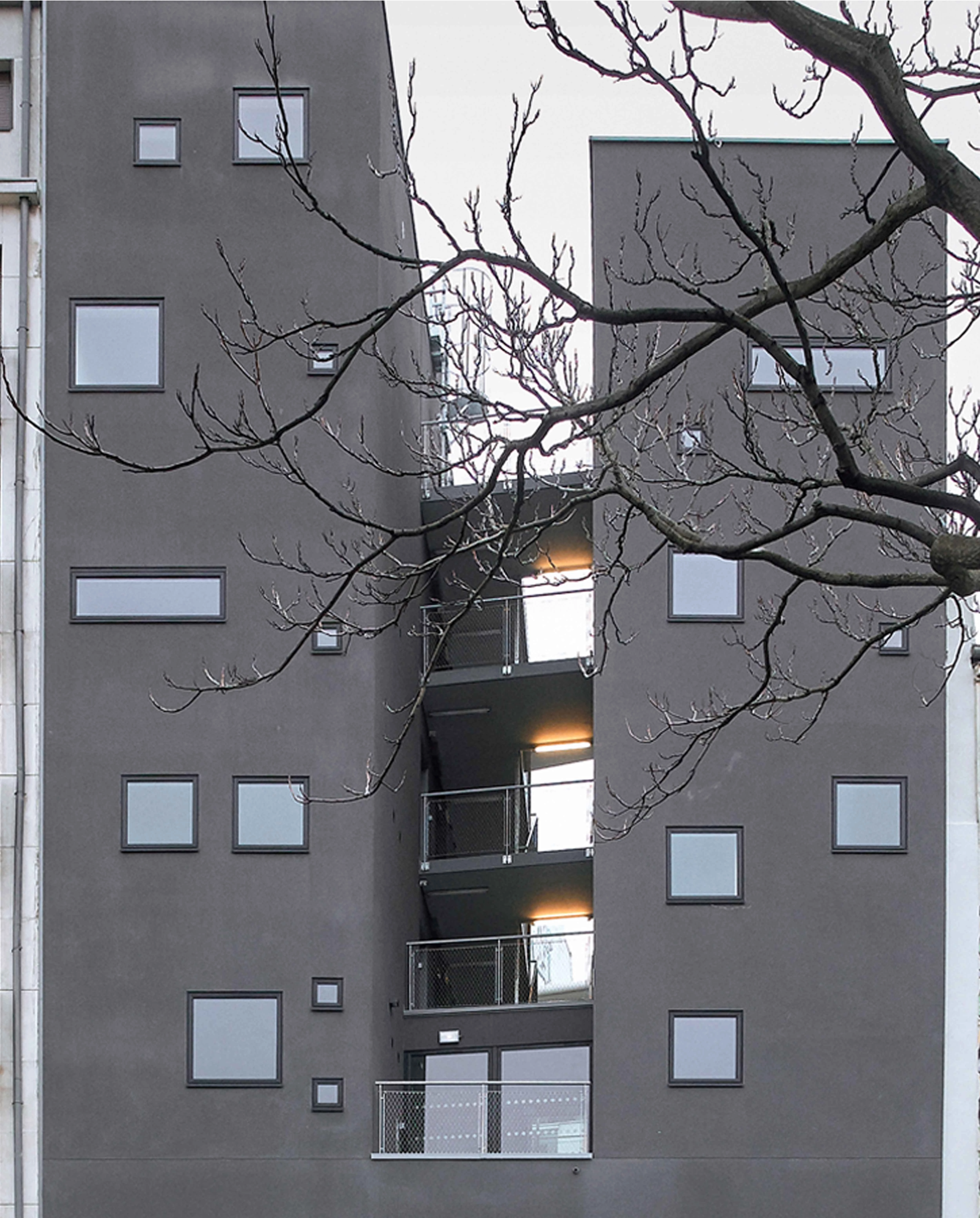 Dos programas diferentes coexisten en el seno de este proyecto. El primero es un centro de acogida, de seguimiento y educación para la reducción de riesgos por la drogradicción, que está abierto sólo durante el día. El segundo propone pequeñas viviendas de reinserción para antiguos toxicómanos. El reto es, por tanto, crear sobre una misma parcela dos edificios separados según sus usos. El proyecto se convierte así en una estructura vertical inserta en el tejido circundante y caracterizada por un vacío central que separa los dos programas en volúmenes independientes. La idea del proyecto es esta conexión: una grieta que permita la existencia de un espacio de transición entre la ciudad y la habitación, entre el gran paisaje y el hogar.