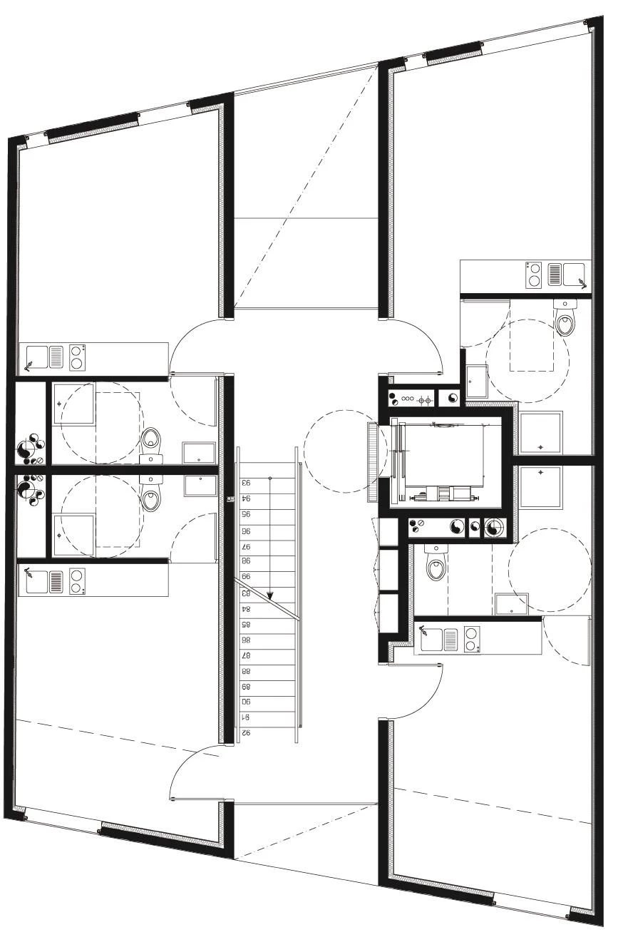 El centro de acogida y reinserción se sitúa en los tres primeros niveles y dispone de un subsuelo que alberga vestuarios y locales técnicos. Las viviendas ocupan de la tercera a la sexta planta, y se organizan alrededor de un núcleo de circulación central, al aire libre, conectado a una serie de pasarelas que funcionan como espacio de interacción. Por su parte, los apartamentos de las últimas plantas disponen de grandes terrazas panorámicas. El acceso a las viviendas se encuentra en la Rue de Chartres, ya que esta calle cuenta con la ventaja de pertenecer a un tejido más social, más urbano, a escala humana. En cambio, la entrada al centro de reinserción, que debía ser más anónima, se sitúa en el bulevar.