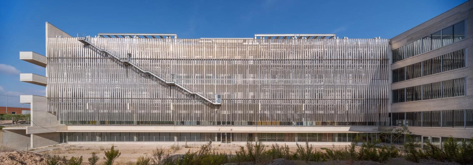 Con un gran voladizo plegado en la fachada principal, el Centro está situado en el Parque Científico de la Universidad de Alicante. El programa funcional contempla módulos con despachos-laboratorios para las empresas científicas y tecnológicas. Estos espacios flexibles están dotados de complejas instalaciones, que determinan la organización formal del edificio en forma de U. La conexión entre los brazos constituye el cuerpo principal que aloja las zonas comunes: el vestíbulo, el auditorio, la cafetería-restaurante y los locales de servicio correspondientes a los laboratorios de empresas. Los brazos contienen los laboratorios, la administración y las aulas de formación, acotando un largo y estrecho patio excavado y ajardinado, tras celosías de lamas angulares de aluminio.