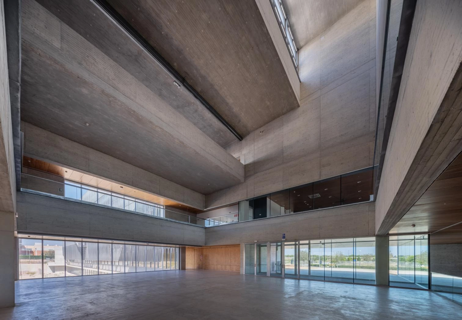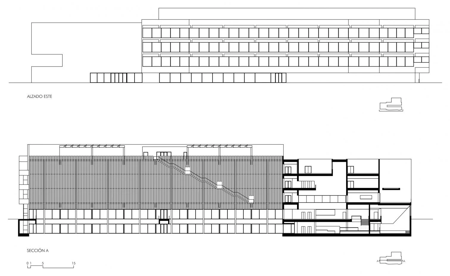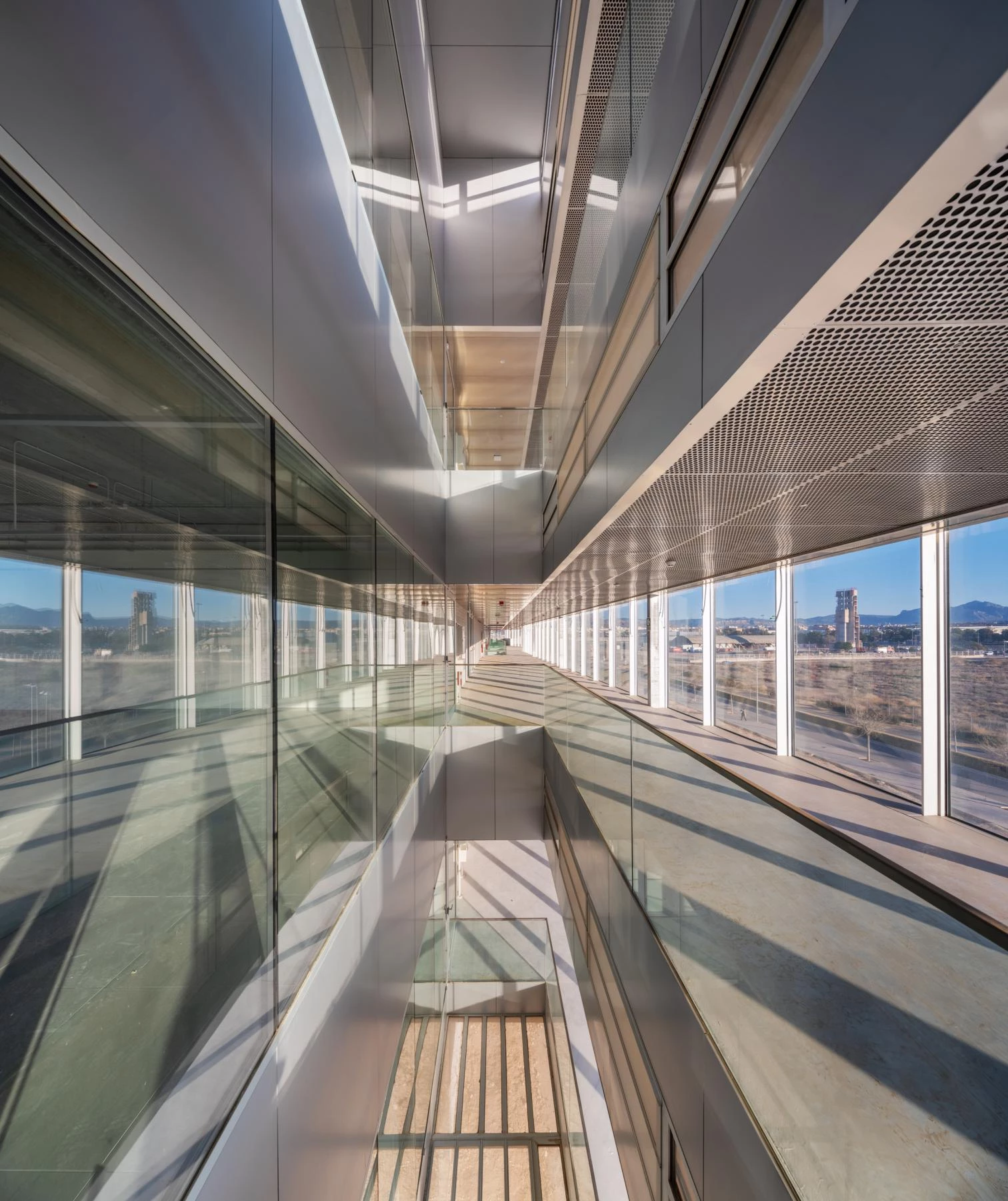 Las galerías, además de espacios de tránsito, estancia y relación, constituyen un sistema pasivo de regulación térmica del edificio. La sucesión lineal de pequeños patios atraviesa todos los niveles, que junto a las lamas móviles situadas lateralmente en cada una de las plantas permiten controlar el acceso de aire del exterior.