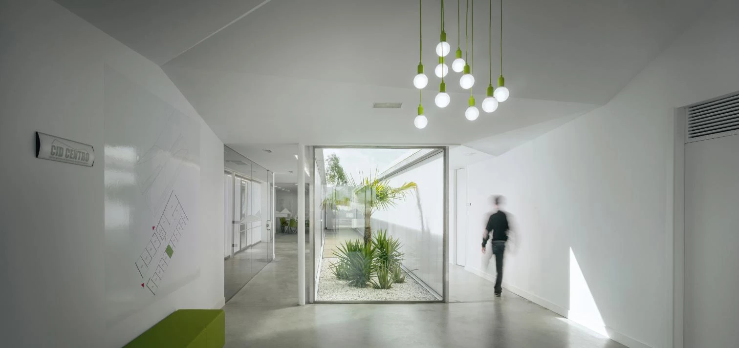 En busca de la mayor flexibilidad y economía de circulaciones, los usos —incubadora de empresas, oficinas de apoyo y salas de reuniones—, se disponen en torno al vestíbulo central, que se convierte en el corazón del edificio.