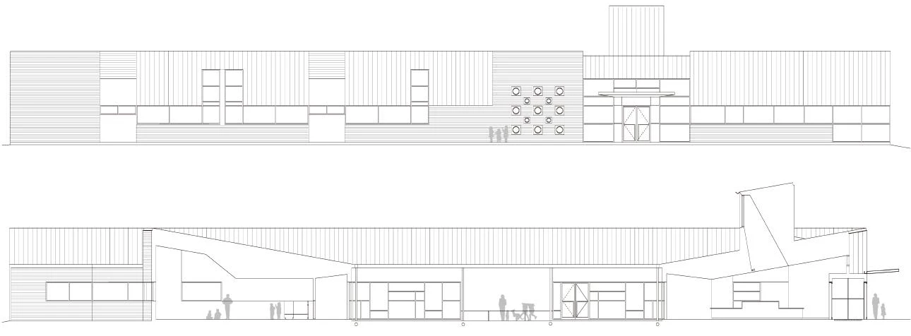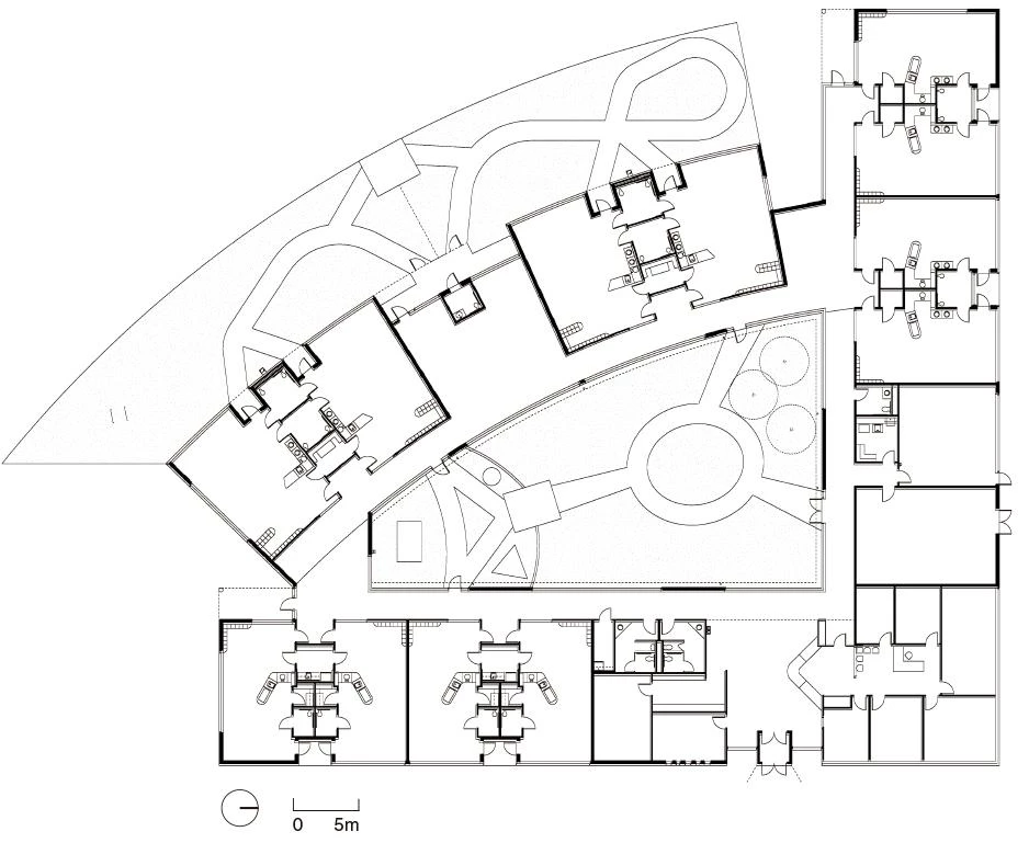 Desde el punto de vista del programa, el centro consiste en un conjunto de clases moduladas e independientes que atienden las necesidades de cada uno de los diferentes grupos de edad: desde los bebés hasta los niños de dos años, y desde estos a los que alcanzan la edad preescolar. Esta multiplicidad de espacios se estructura mediante una calle interior que evoca la huella del edificio y que se dispone en torno a una zona central protegida y destinada a juegos. Adoptando la forma de una cuña, este espacio central hace las veces de patio por donde penetra la luz natural, alcanzando las aulas tras atravesar una serie de ventanas interiores.