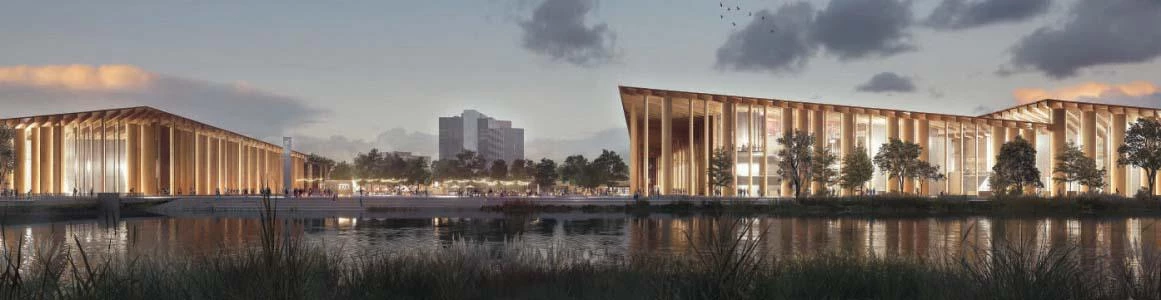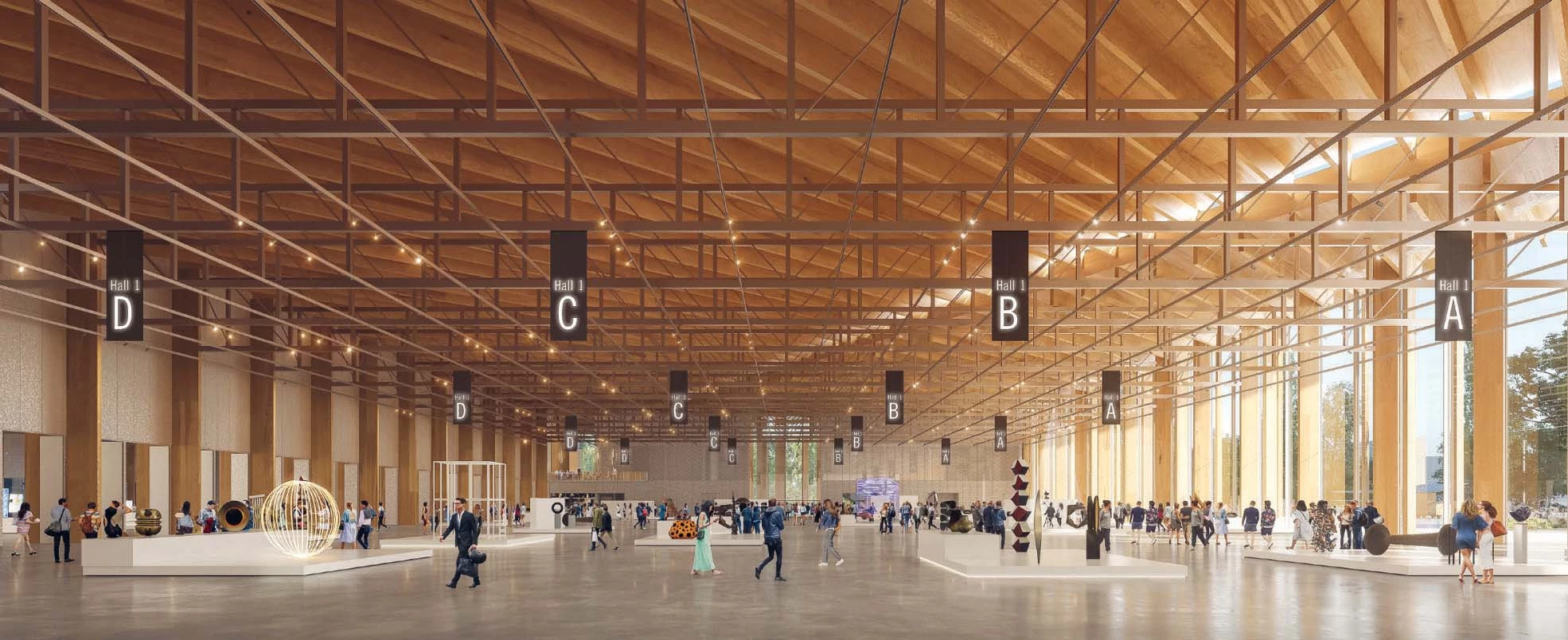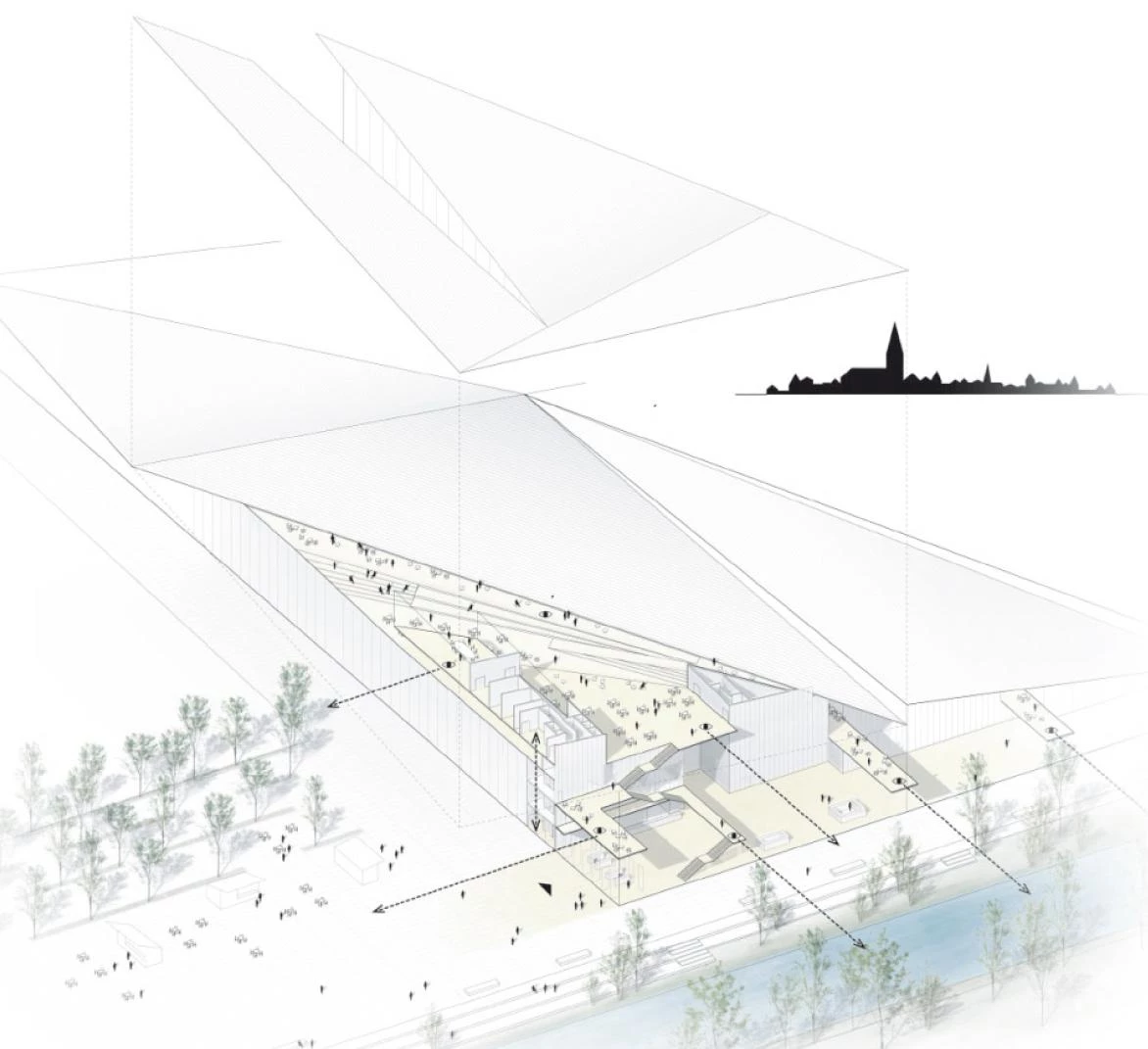 Un vestíbulo de entrada dará acceso a cuatro de las cinco salas de exposiciones del centro, la quinta estará en un pabellón exento cercano al edificio principal. Los grandes ventanales que envuelven los dos volúmenes permitirán crear una estrecha conexión visual con el entorno y el río.