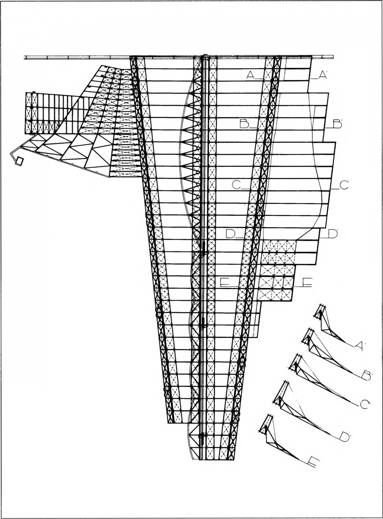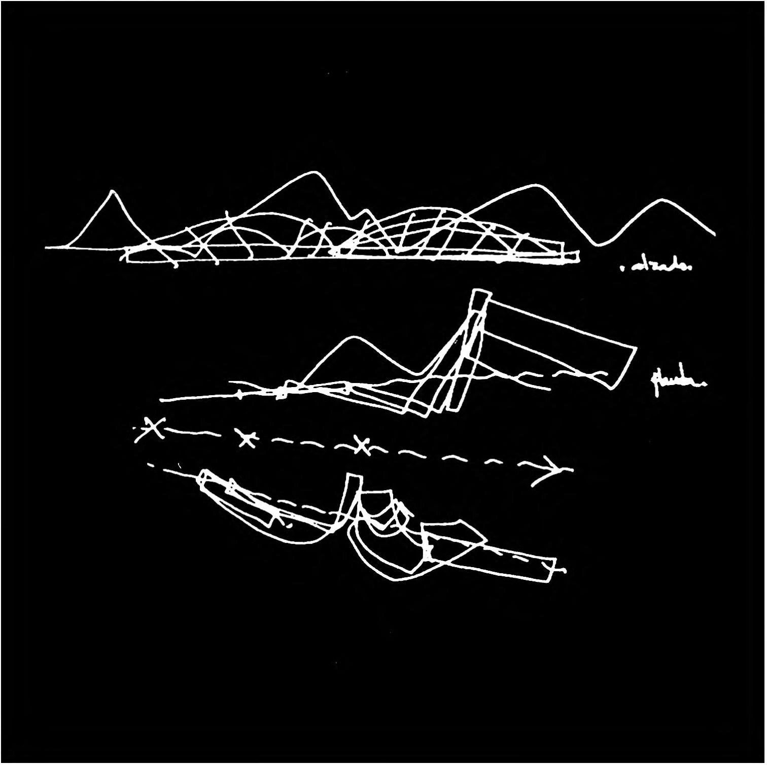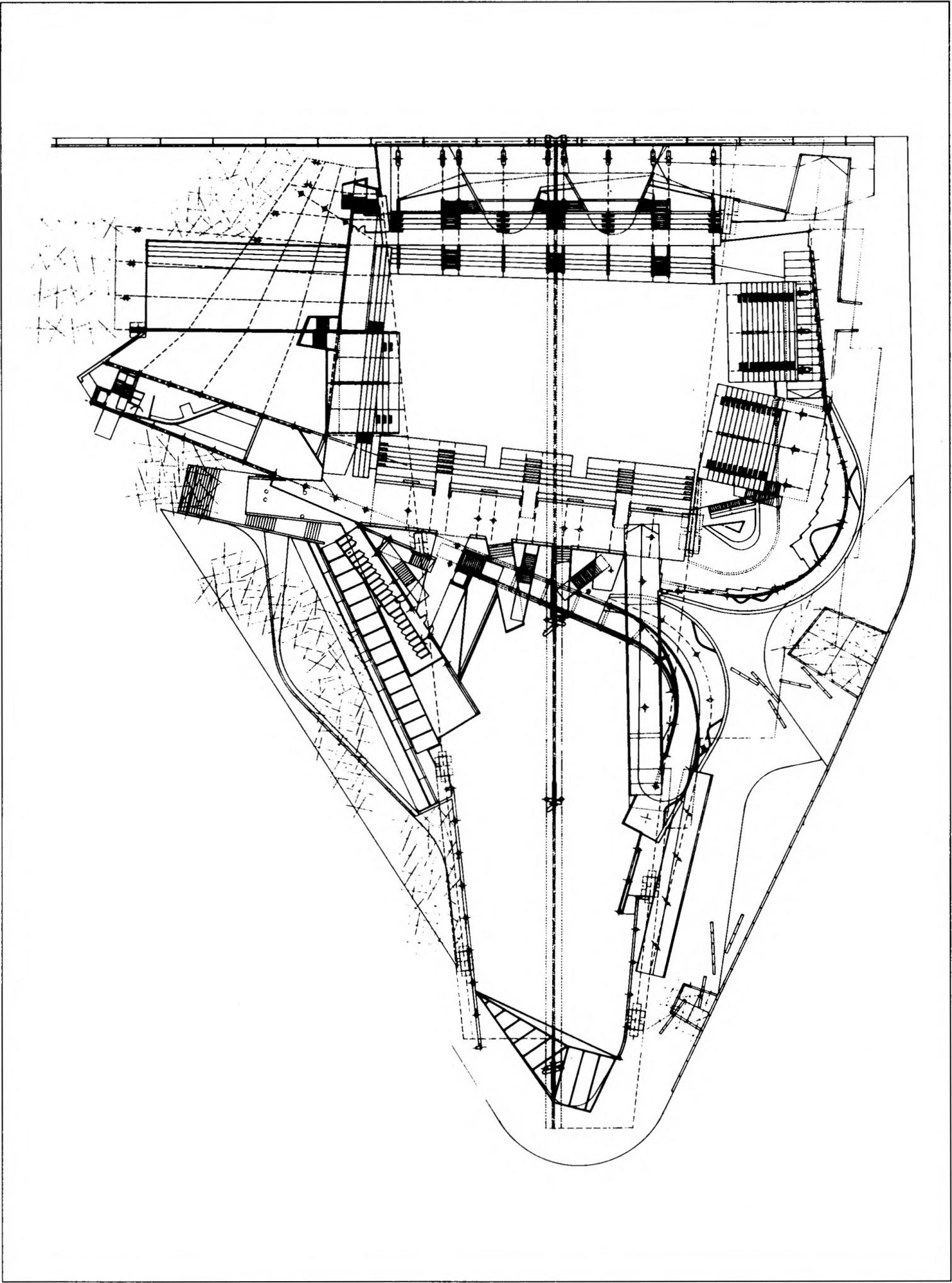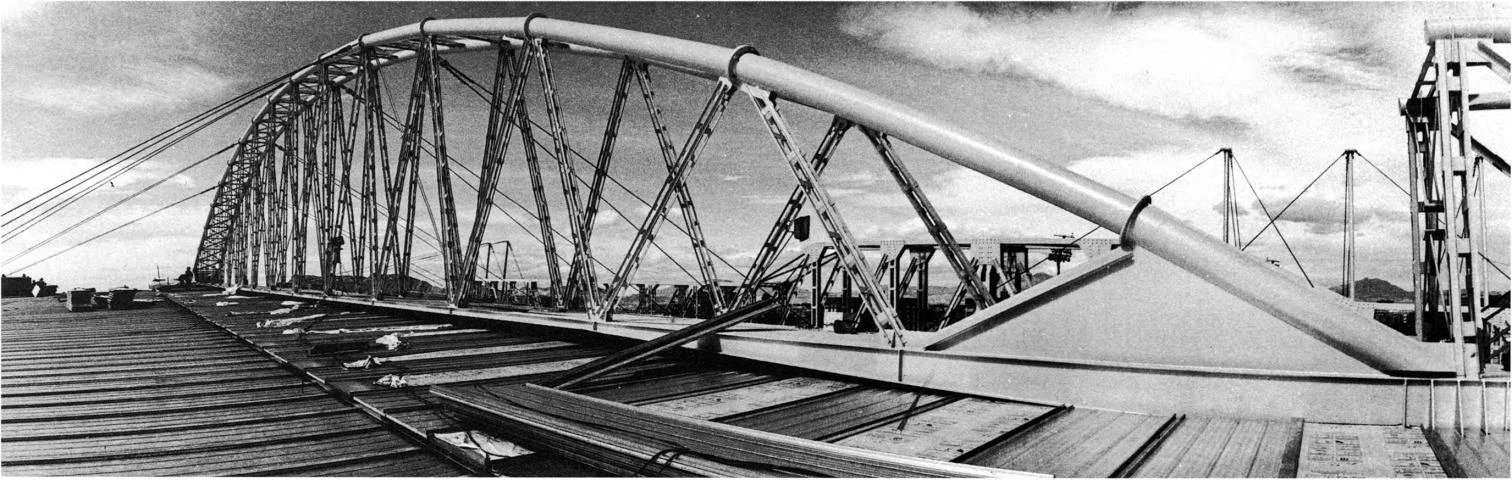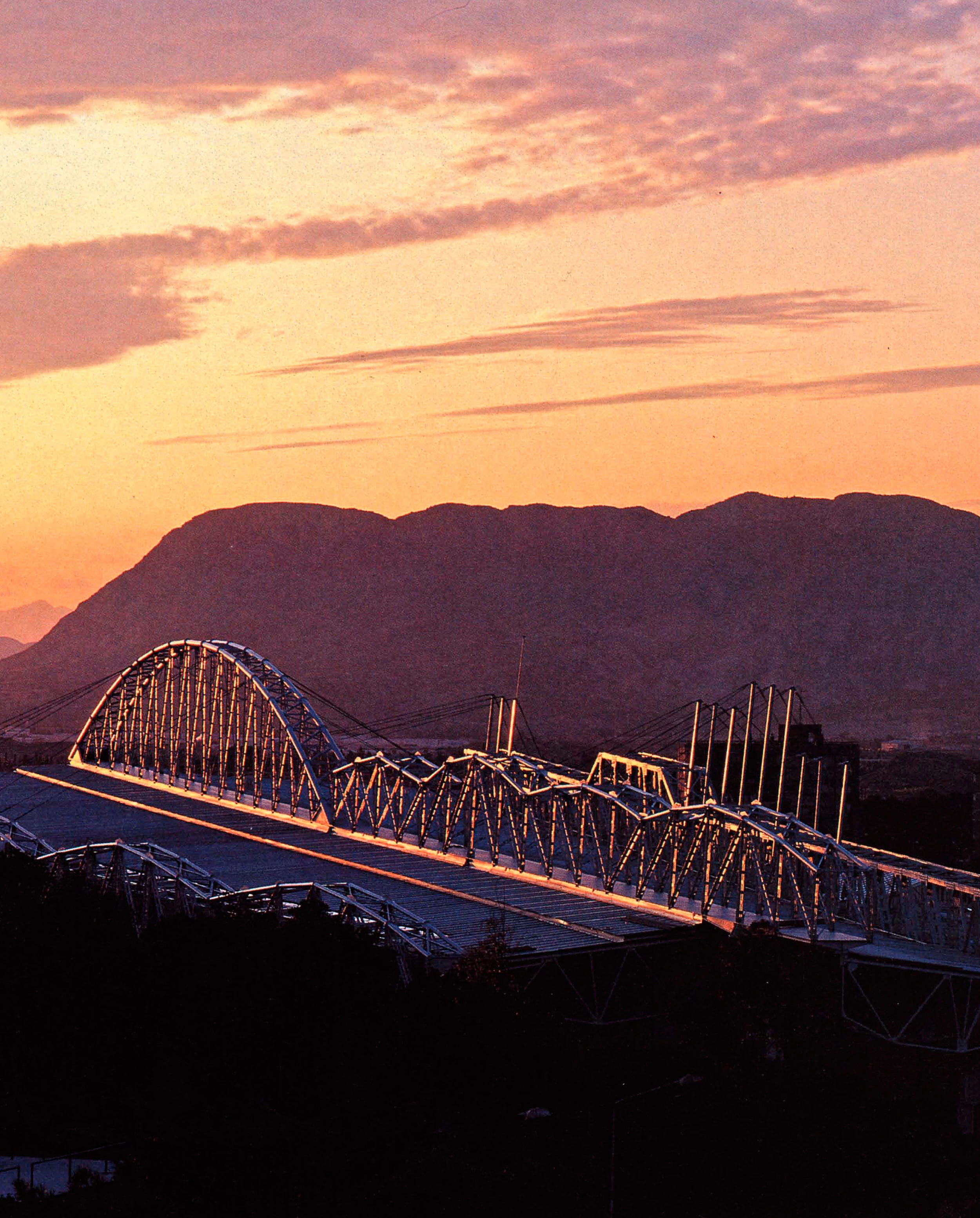 Para entender cómo se conjuga todo esto hay que prestar atención a las direcciones principales de la estructura de la cubierta. Las variaciones de los recorridos antes descritos se unifican bajo las directrices principales de esta estructura: tres cerchas cubren el edificio longitudinalmente, sin otorgar especial protagonismo a las partes que lo componen. Las cerchas modifican su perfil superior según las diferentes luces que deben cubrir, de forma que la silueta exterior viene a ser equivalente a la trayectoria interna del público que se mueve por los diversos espacios. La relación con el perfil de las montañas y la ciudad se extiende, pues, al movimiento del público por el interior.