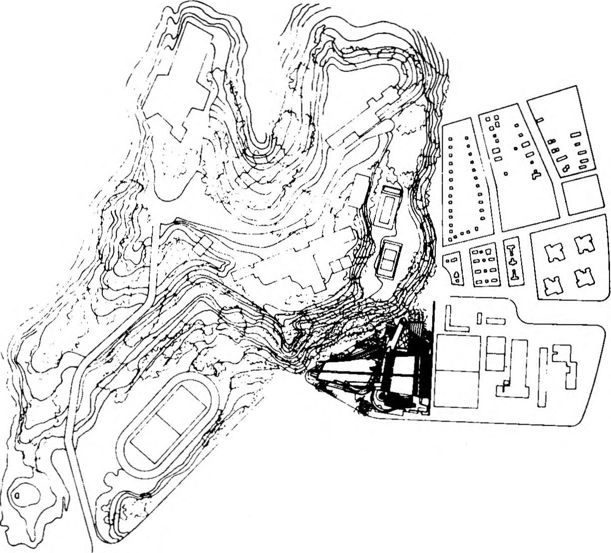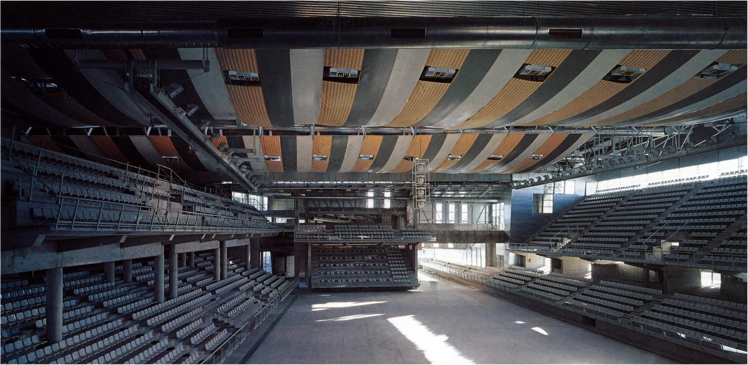 Tal vez la mejor forma de comprender físicamente el proyecto sería interpretarlo como una modificación topográfica de las últimas curvas de nivel de la colina posterior, que se transforman, a través del vacío de las salas de competición y de entrenamiento, en los elementos más públicos del edificio: el pórtico y el vestíbulo de acceso. Para conseguir esto, las curvas de nivel se convierten en diferentes rampas que relacionan las dos salas separadas de competición y entrenamiento. El edificio cobra forma cada vez que es utilizado: los recorridos del público coinciden con el perímetro de las salas y generan una serie de trayectorias variables.