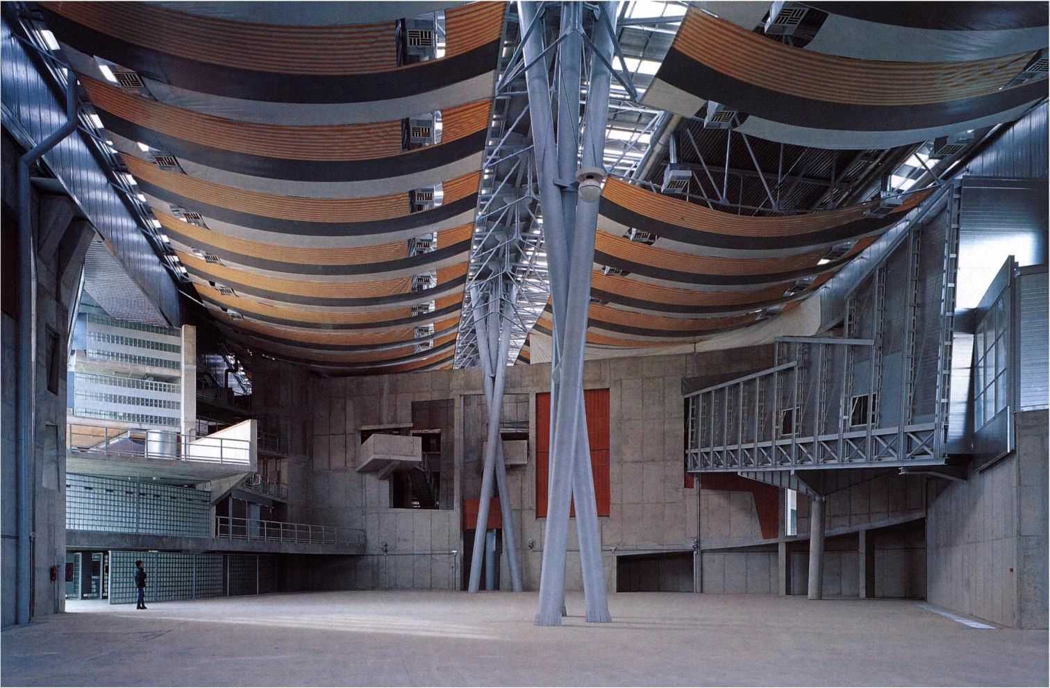La fuerza expresiva de las grandes cerchas de cubierta y el complejo juego volumétrico de los elementos exteriores contribuyen a afirmar la presencia del edificio en el paisaje.