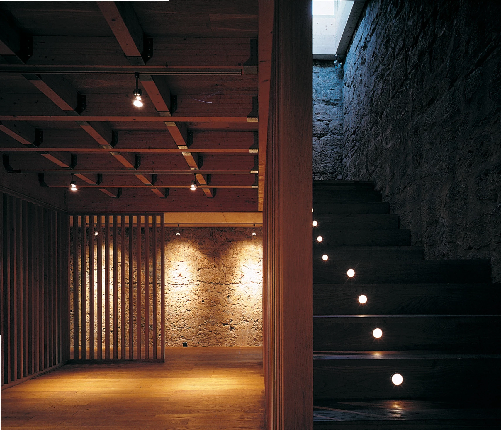 Carente de cubierta y de todo tipo de compartimentaciones, la torre del homenaje era en el momento de iniciar la intervención un tubo erguido y hueco de planta cuadrada, definido por cuatro muros de piedra que habían sido zunchados en una obra de consolidación reciente. Intentando alterar estas condiciones de contorno lo menos posible, una suerte de ‘mueble’ proporciona todos los elementos necesarios para albergar el aula y la escalera que asciende hasta el mirador habilitado sobre la cubierta, desde el que contemplar la panorámica del pueblo. Ante la posibilidad de que los criterios de restauración o las necesidades funcionales cambien a lo largo del tiempo, esta obra de rehabilitación se plantea como la inserción reversible de una estructura independiente que apenas toca los sillares del castillo.