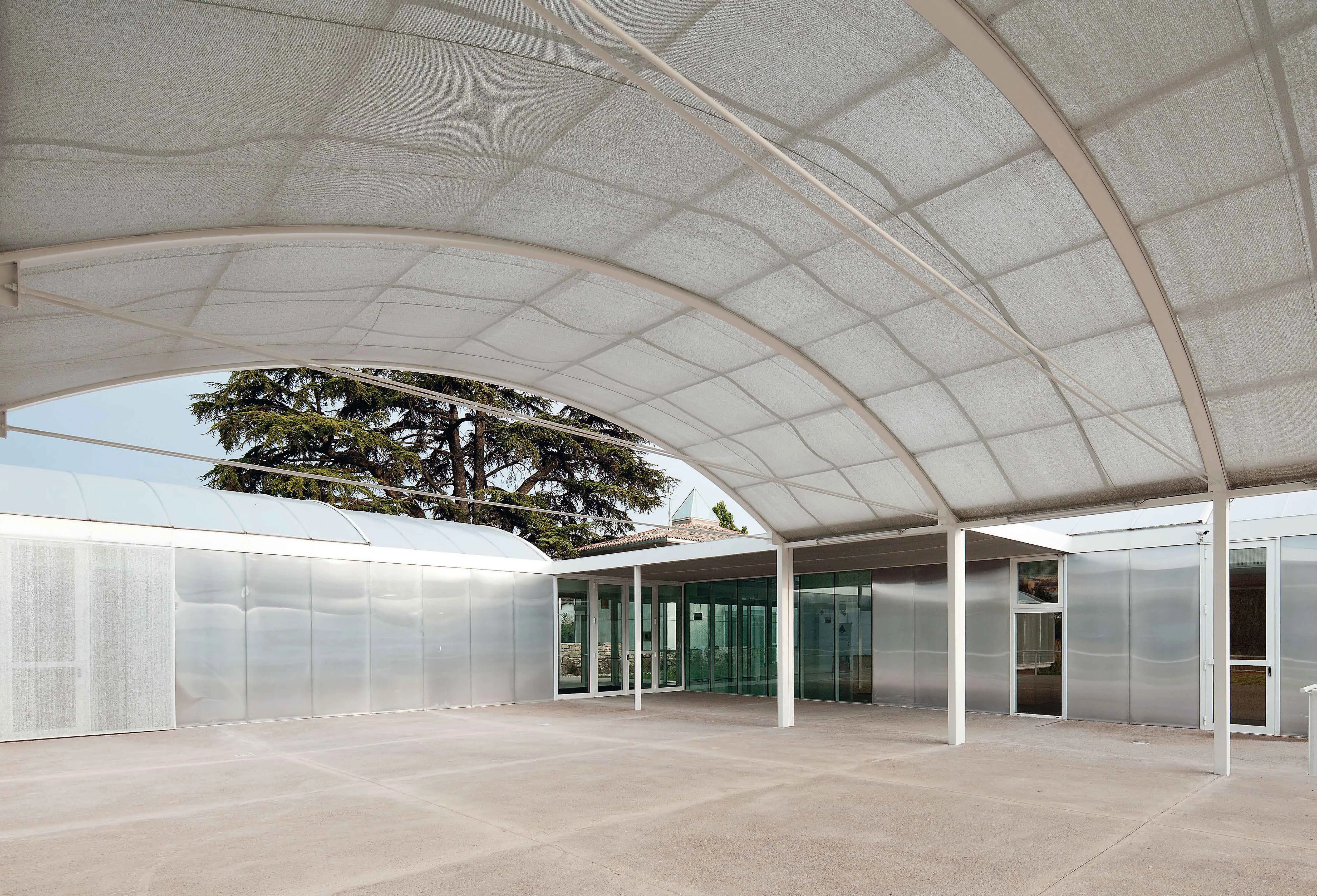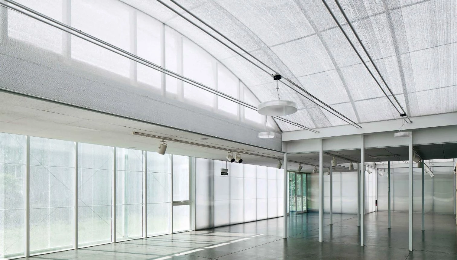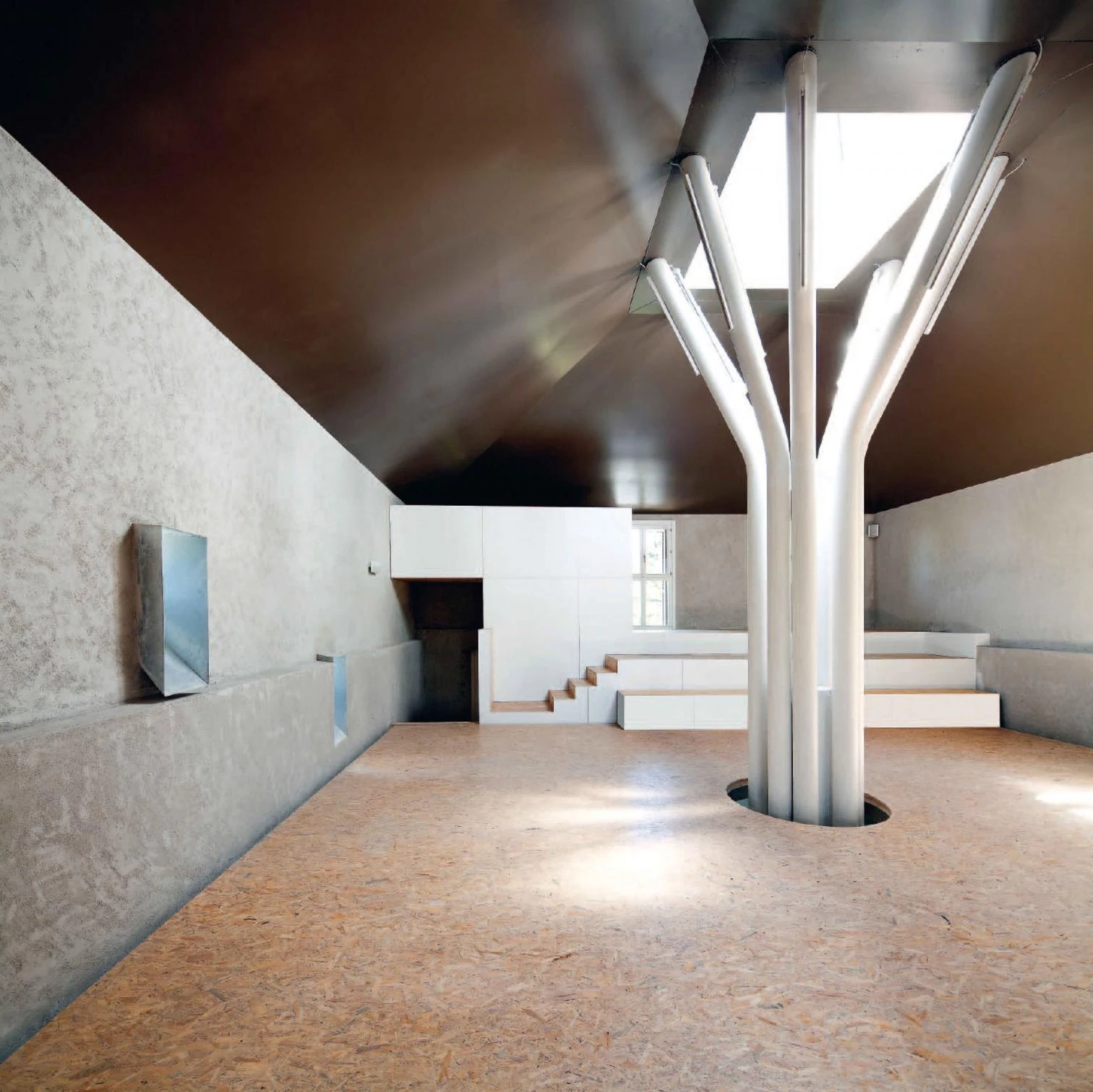 Se ha reutilizado una construcción existente como establo y se ha reconvertido la casa Gurbindo en un espacio expositivo diáfano que se organiza alrededor de un árbol de acero situado bajo un lucernario piramidal.