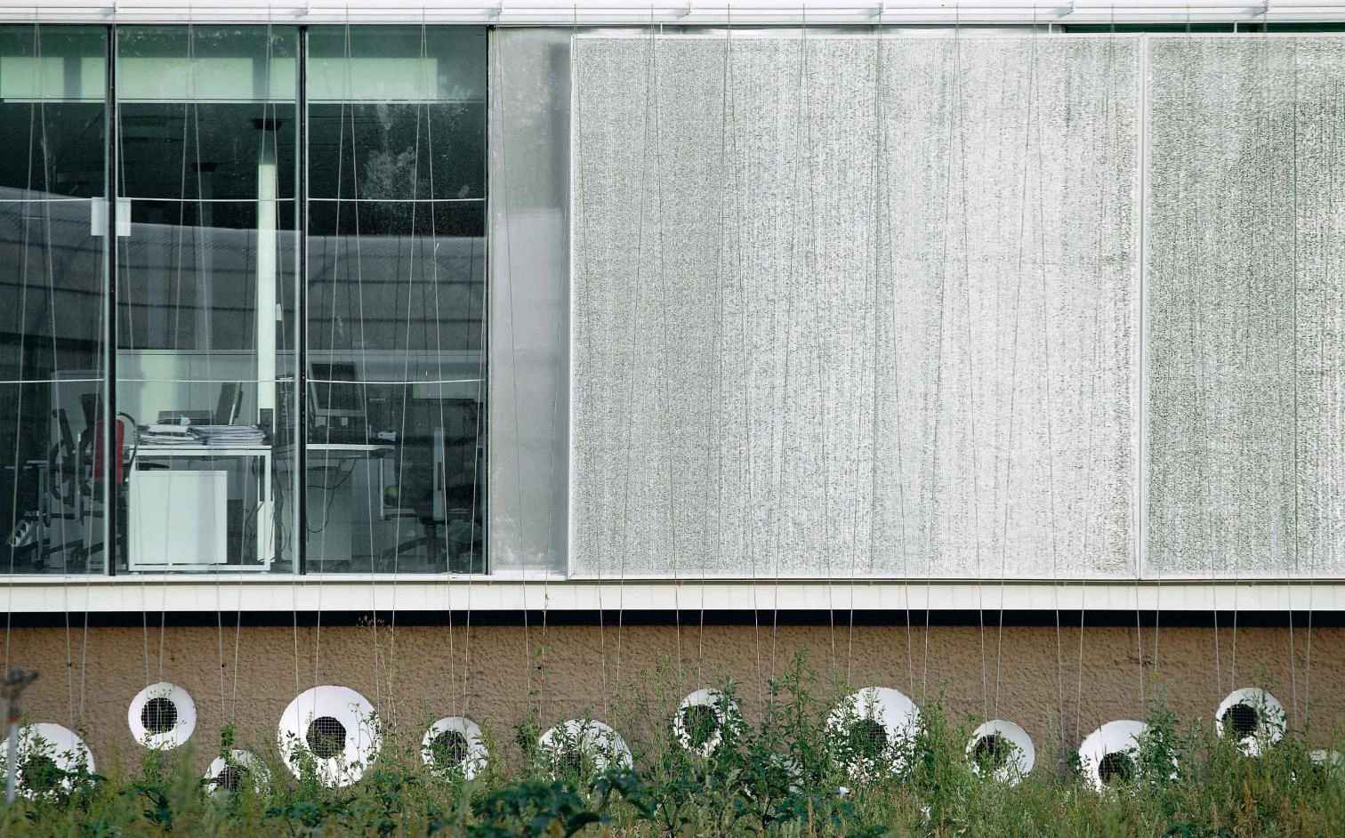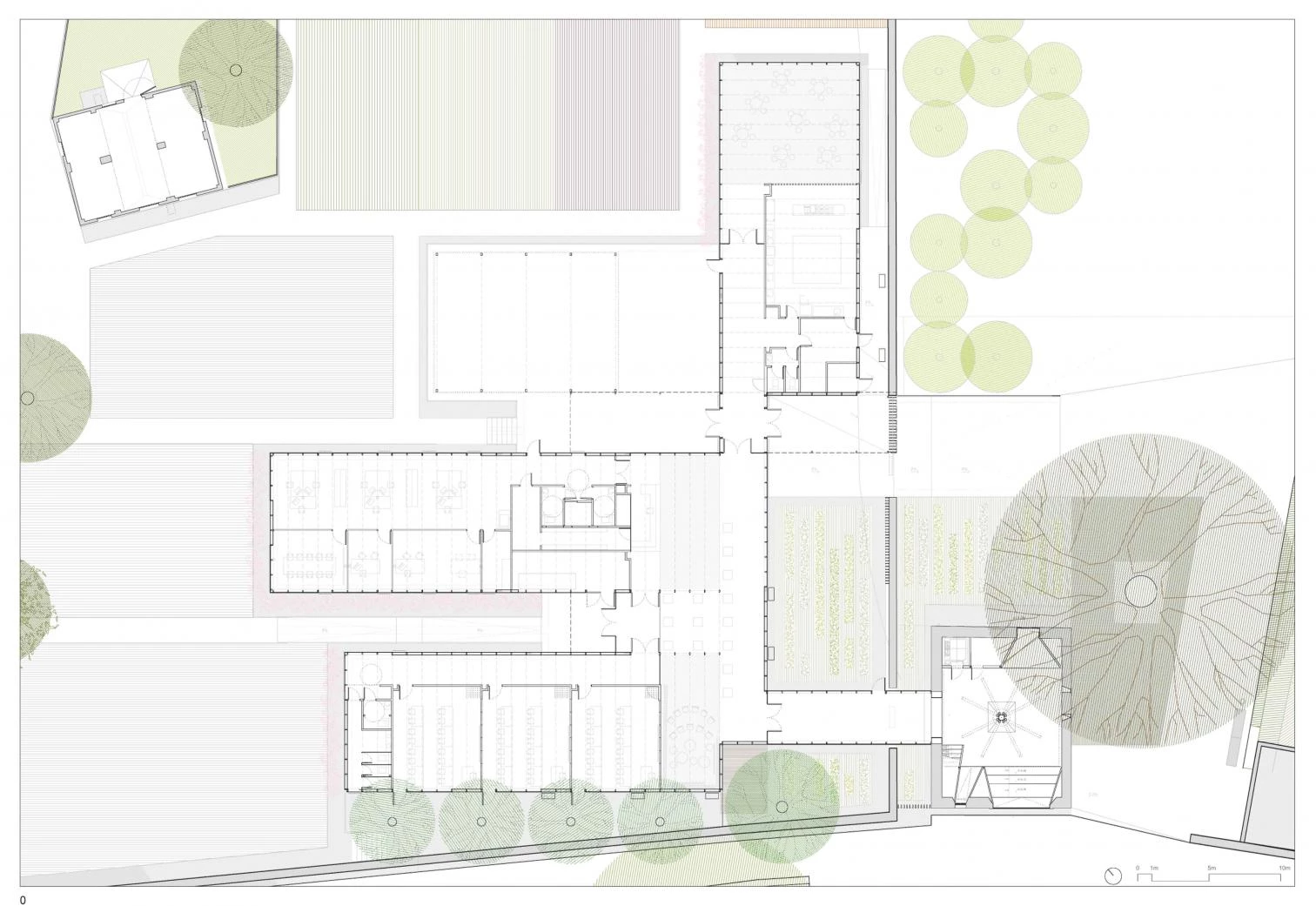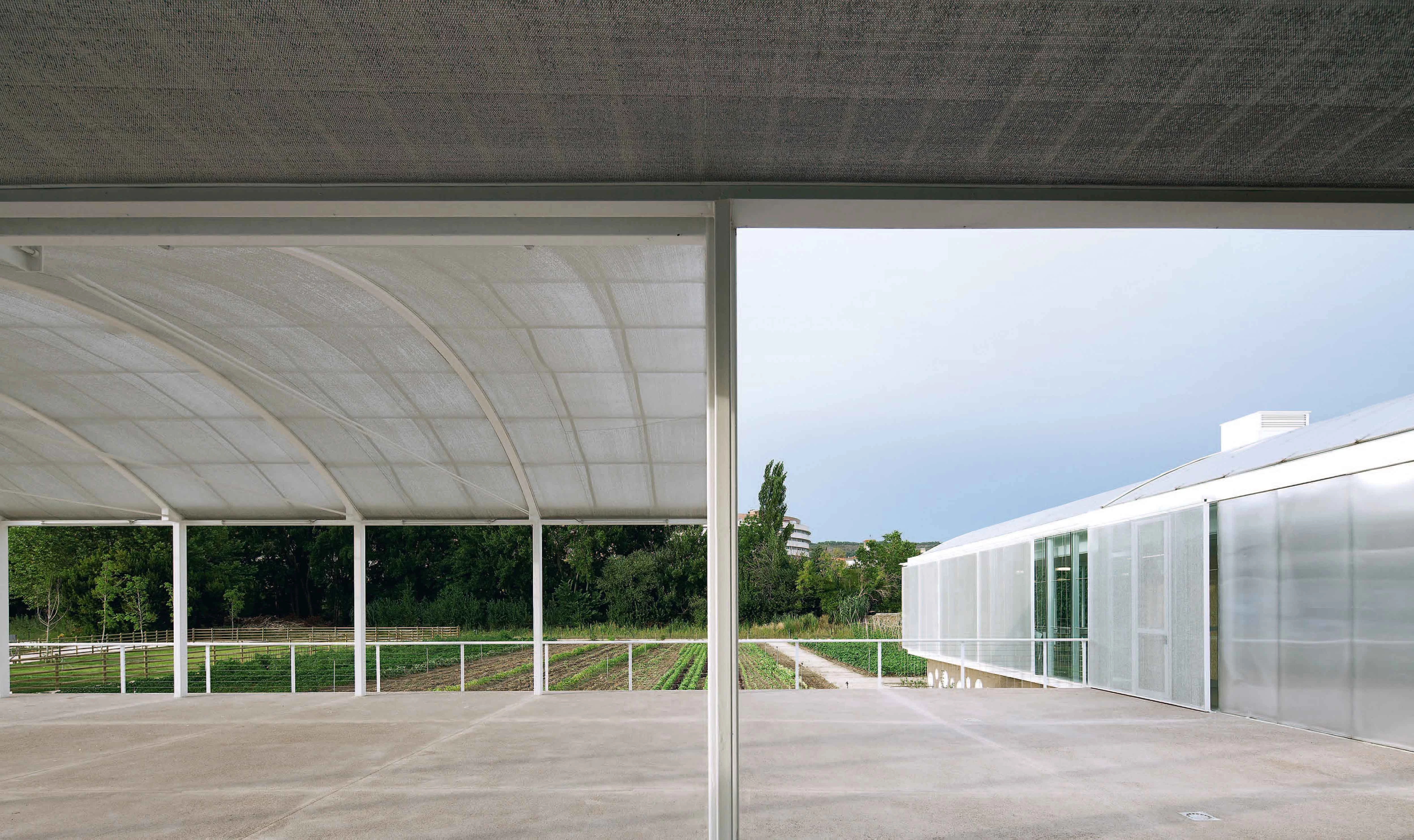 El edificio de la fundación se plantea en una sola planta de factura cercana a la de los invernaderos. En este afán de integración, se utiliza una paleta material de policarbonato, vidrio, malla de sombra de invernaderos, estructura ligera y plantación de trepadoras. Todo el conjunto se instala entre muros viejos de piedra manipulados por razones hidráulicas, arquitectónicas y paisajísticas. Tres naves largas separadas entre sí y articuladas a través de un vestíbulo conforman un edificio asentado sobre un plinto que se eleva un metro sobre el terreno para protegerse de las inundaciones. El programa se compone de varias aulas flexibles, un espacio de restauración y cursos de cocina asociados al producto de la huerta, unos espacios de oficina y un espacio expositivo que ocupa una antigua casa rehabilitada. En los exteriores, el establo, que utiliza una construcción preexistente, un invernadero como semillero y espacio para aperos, y una gran superficie de huertas completan el programa del centro.