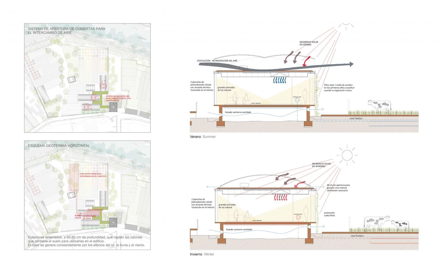 Entre los objetivos prioritarios del proyecto estaba conseguir la máxima autosuficiencia energética. Para ello se aprovecha la iluminación natural, con el diseño traslúcido de fachadas y techos mediante paneles de policarbonato celular rellenos de aislamiento térmico transparente, que permiten minimizar el consumo eléctrico del alumbrado. Asimismo, las fachadas acristaladas con orientación de SE a SO se protegen con paneles de mallas de aluminio, a la espera de que el crecimiento de las enredaderas permita prescindir de ellas. La ventilación se beneficia del diseño arquitectónico de las cubiertas con sistemas de apertura tradicional de los invernaderos. Este diseño permite acumular el calor de la radiación solar en invierno, mientras que en verano las cubiertas permanecen abiertas dando lugar a una circulación del aire que permite refrescar el ambiente. Por último, se hace un uso intensivo de los recursos geotérmicos del entorno con un doble emparrillado horizontal por debajo del nivel freático del río Arga.