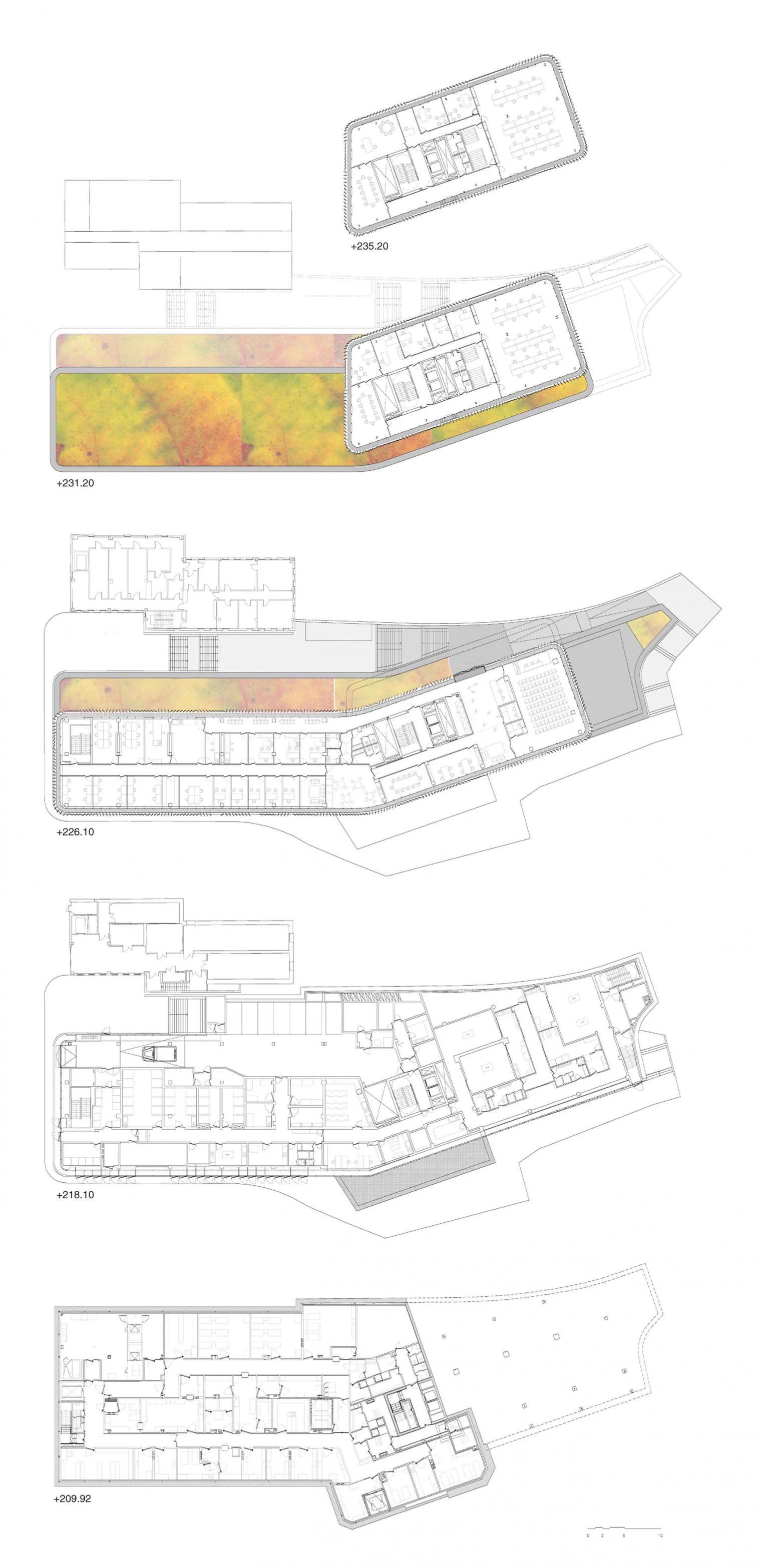 La complejidad y las necesidades específicas del programa se traducen en un esquema eficaz tanto en planta como en sección. Las comunicaciones verticales se sitúan en el centro y en los dos extremos de la pastilla longitudinal, dividiendo el espacio en tres sectores principales. En los niveles subterráneos se disponen las áreas restringidas, como los quirófanos o el estabulario. Sobre ellas, emergen dos plantas semienterradas que acogen los laboratorios y las áreas de trabajo. Por último, en una pieza de menor tamaño y exenta, se sitúan los espacios de gestión y la maquinaria técnica.