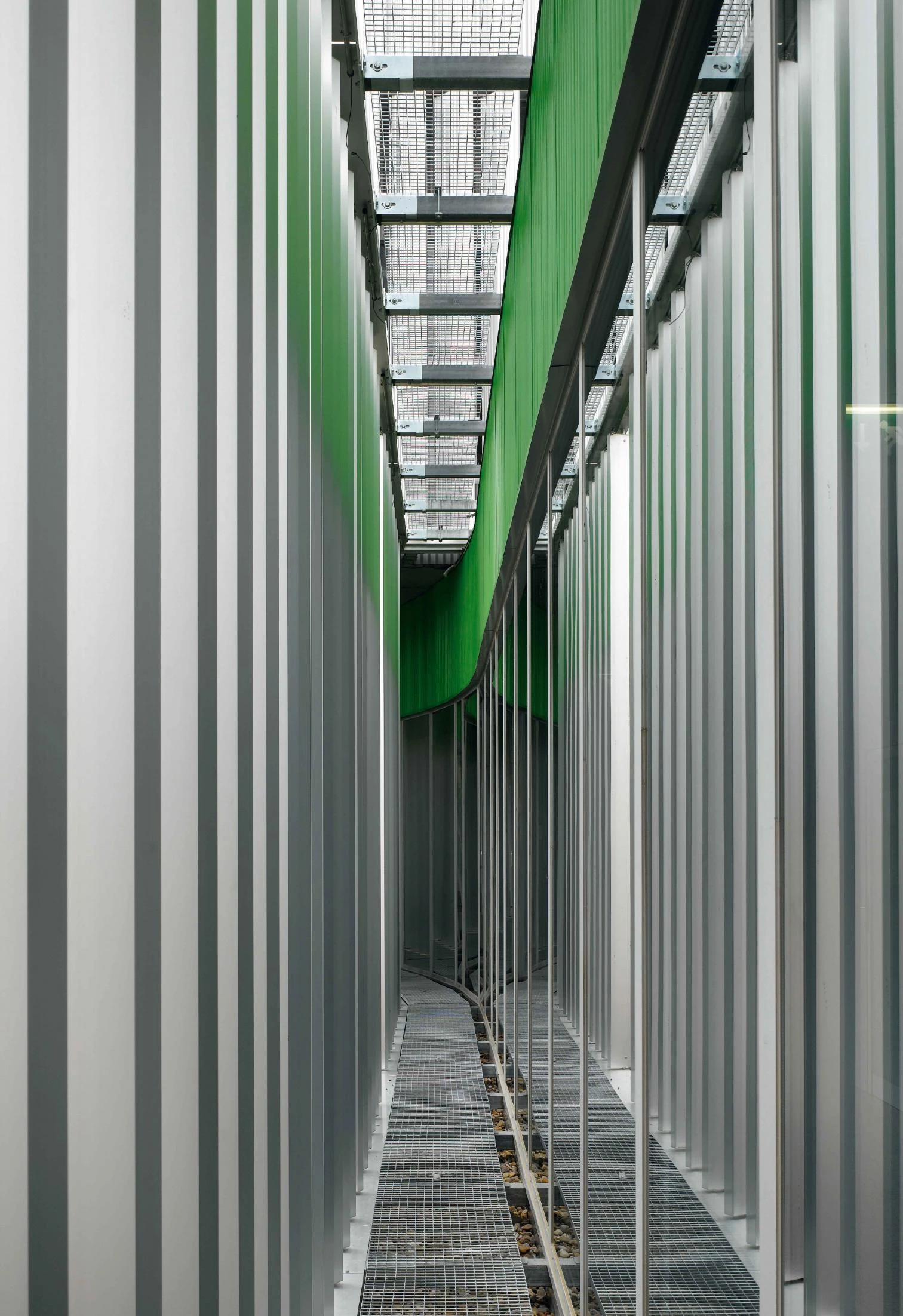 Las diferentes plantas, que se adaptan a la geometría longitudinal de la parcela, se superponen estableciendo un diálogo volumétrico con los edificios del entorno. Una piel de lamas metálicas envuelve cada nivel de forma continua, lo que aporta una imagen unitaria al conjunto. Esta continuidad se refuerza gracias a que las esquinas se redondean evitando fragmentar los volúmenes en planos. El sistema de lamas motorizadas permite, además, que los usuarios puedan regular la entrada de luz en función de sus necesidades concretas y variar la incidencia solar, abriendo la celosía en invierno para captar energía y cerrándola en verano para protegerse del calor. Entre esta primera pantalla permeable y el límite interior, se crea un colchón térmico que amortigua los cambios de temperatura, ya que favorece la circulación del aire a lo largo de la fachada en la dirección vertical. Las lamas, construidas mediante aluminio extrusionado, cuentan con una cara lisa y otra estriada conformada mediante moldes de perfil irregular.