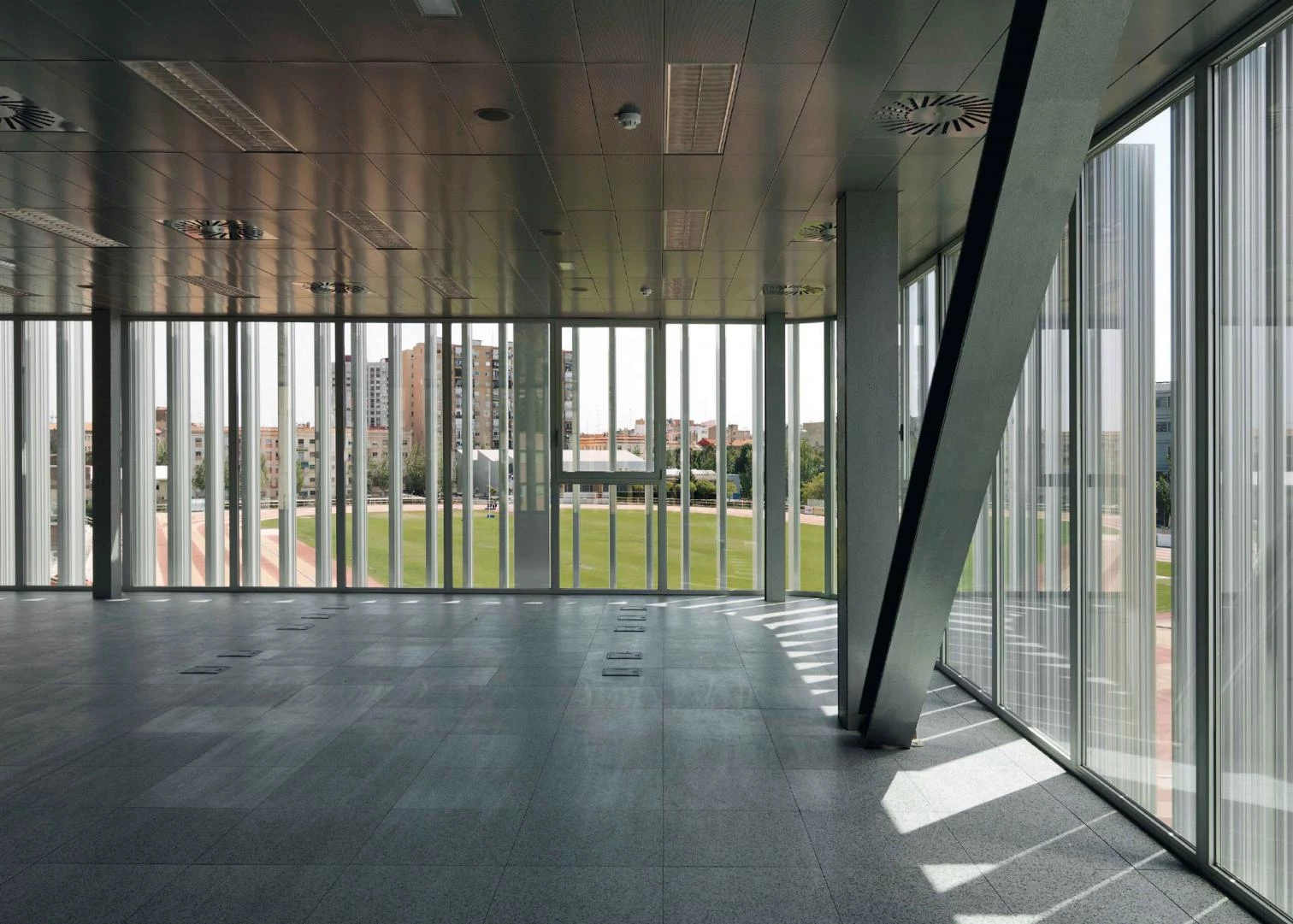 Compuesta por lamas orientables de aluminio extrusionado, la piel que envuelve el edificio permite regular la intensidad de luz y las vistas en función de las necesidades específicas de cada parte del programa.