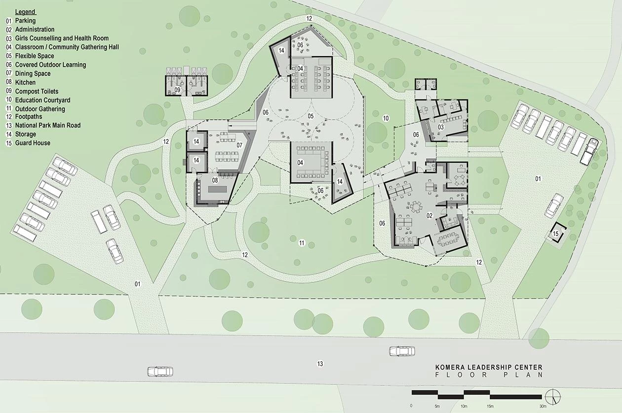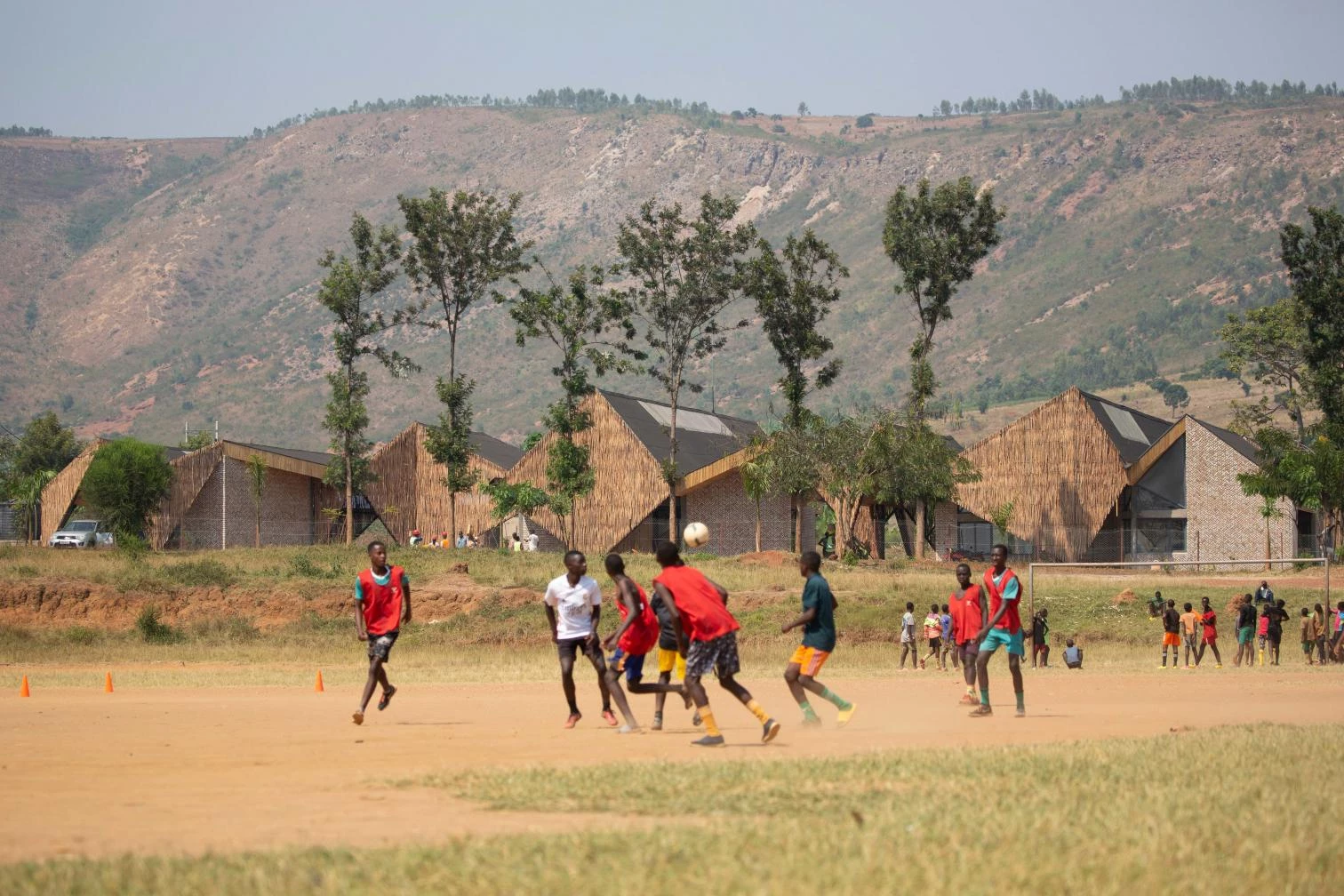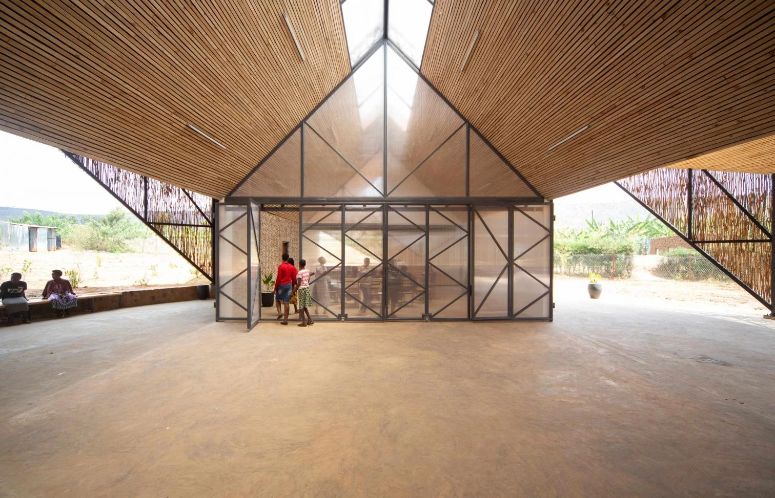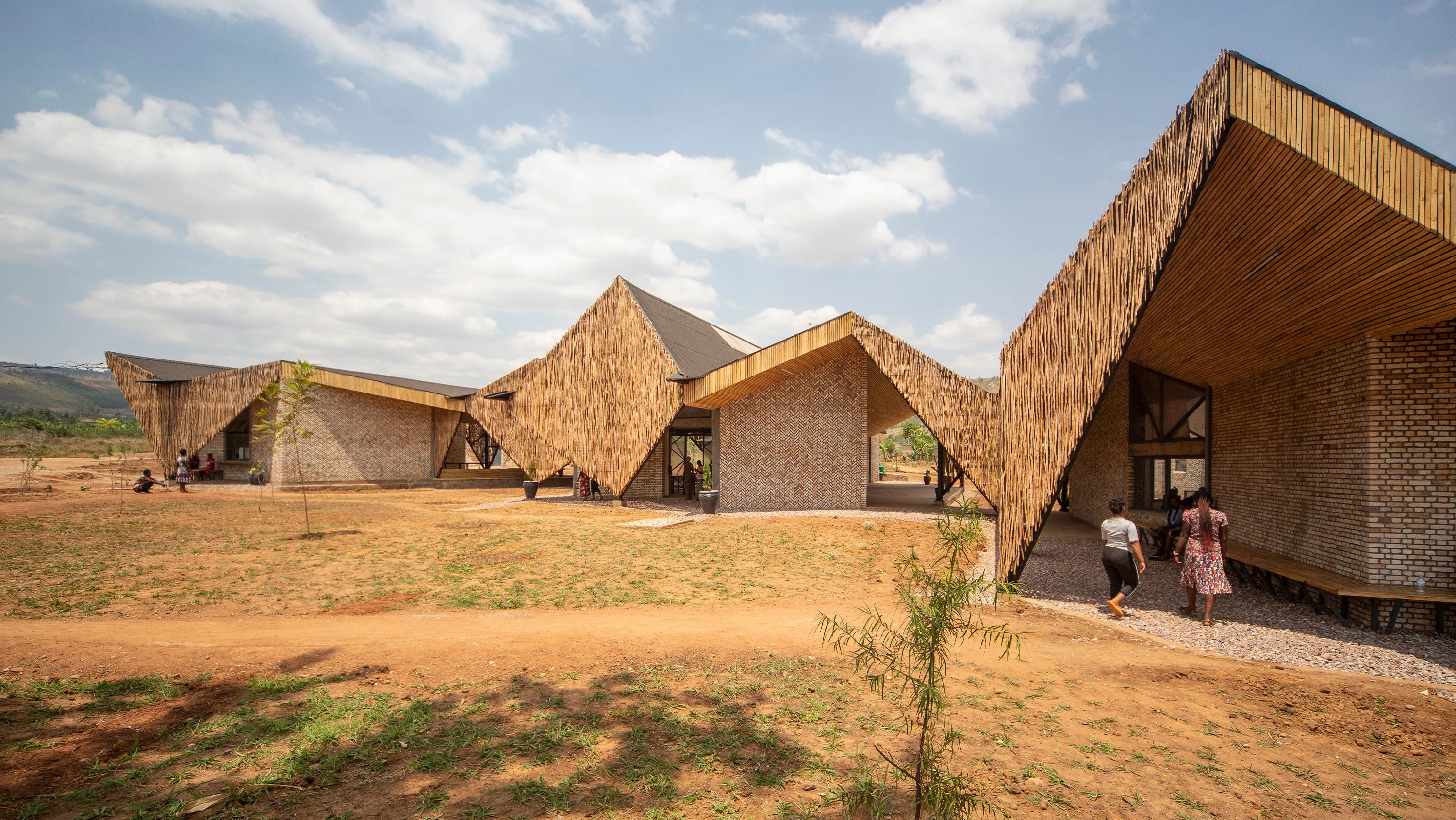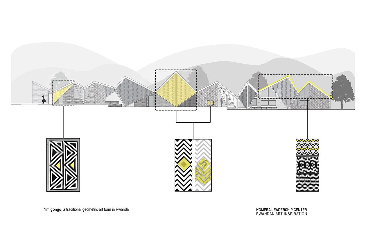 Las inclinaciones de los techos, las pantallas tejidas de eucalipto y los patrones decorativos de ladrillo están inspirados en el Imigongo, arte de tradición local, vinculado a la palabra ruandesa komera, que significa ‘mantenerse firme y tener coraje’.
