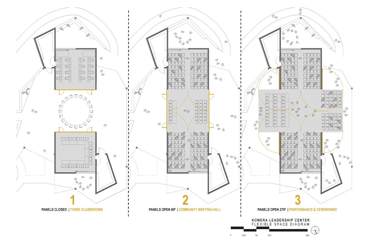 El corazón del conjunto presenta un espacio flexible que se transforma a través de la apertura o cierre de amplios paneles móviles, según las necesidades funcionales para albergar grandes eventos, un amplio salón o tres aulas.