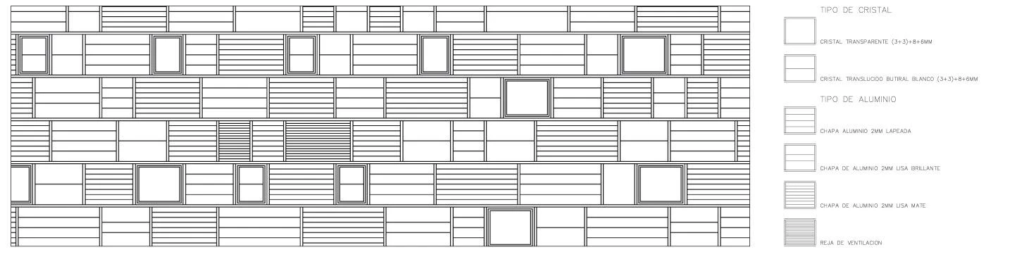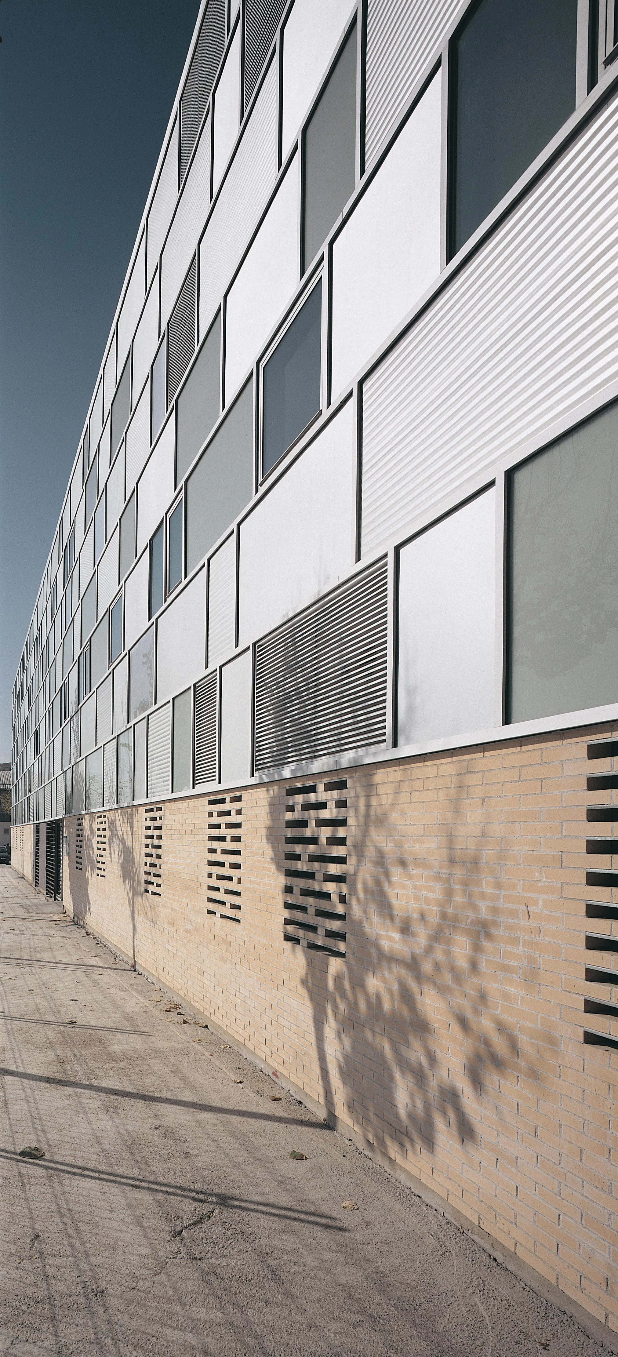 Para conseguir la imagen abstracta y unitaria que permita identificar el carácter institucional del centro sanitario, el edificio se esconde tras un animado tapiz que reúne el orden y el azar en un muro cortina formado por seis materiales en cuatro formatos distintos. Como si de las letras de un abecedario se tratase, el vidrio translúcido y el cristal transparente, el aluminio acabado en brillo o en mate, estriado o con un esmerilado en bandas se combina como un código cambiante que tan sólo se somete a la pauta impuesta por la sucesión horizontal de la estructura de fachada. Al interior, los paneles de melamina proporcionan el material lavable y de mantenimiento sencillo que requieren unas instalaciones de esta índole.