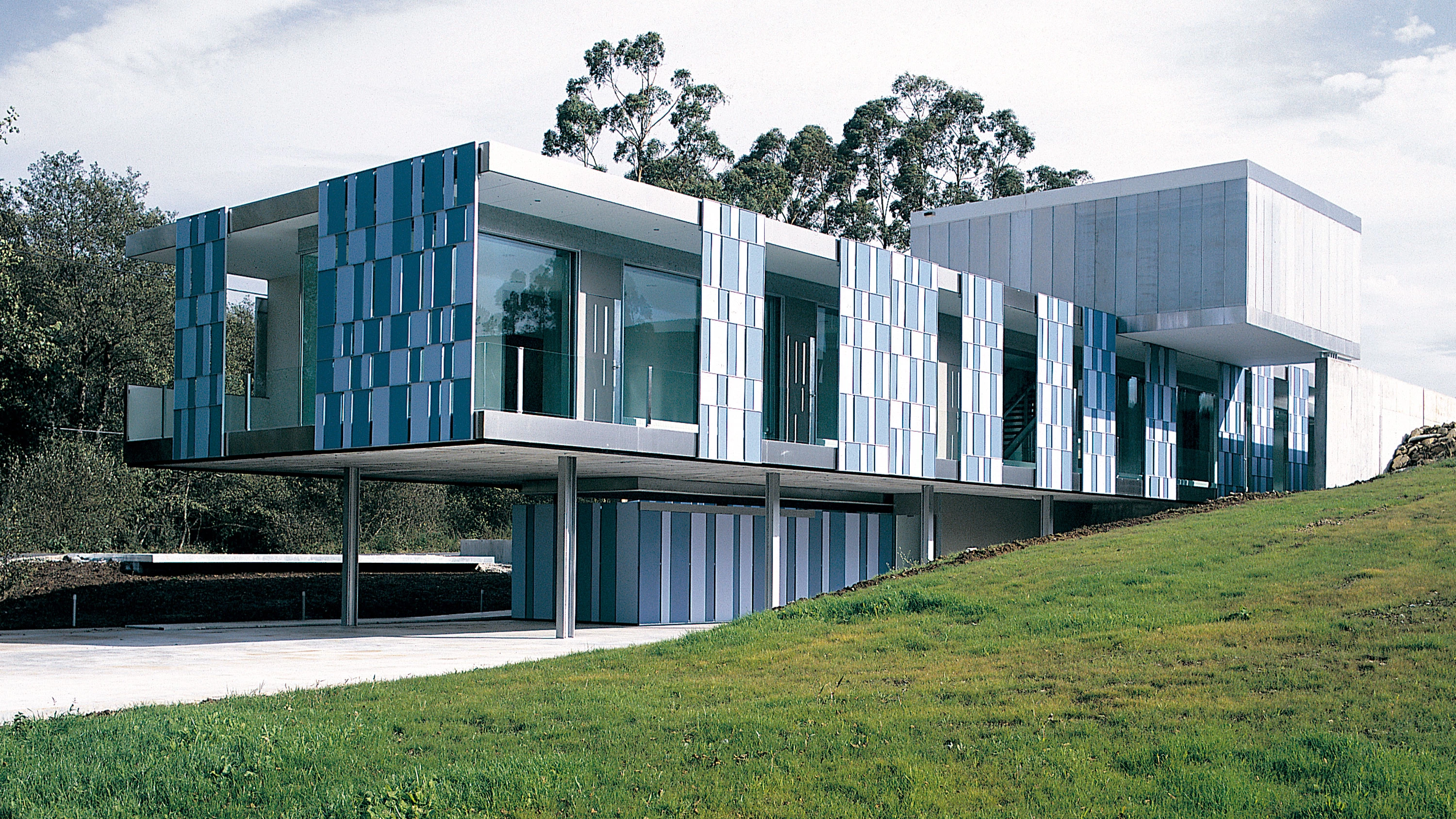 El concepto de espacio de encuentro se materializa mediante la manipulación de otro concepto: el de piel multicapa capaz de crear espacios intermedios. Una primera hoja como una celosía donde incide la luz: el usuario participa de su transformación, con sensaciones e impresiones múltiples. Se conforma a través de catorce correderas de cuatro metros de altura; el material, tableros de viroc lacado en colores azules. Una estrategia sencilla en su diseño permite crear una multiplicidad de reflejos, vibraciones y movimientos... [+]
