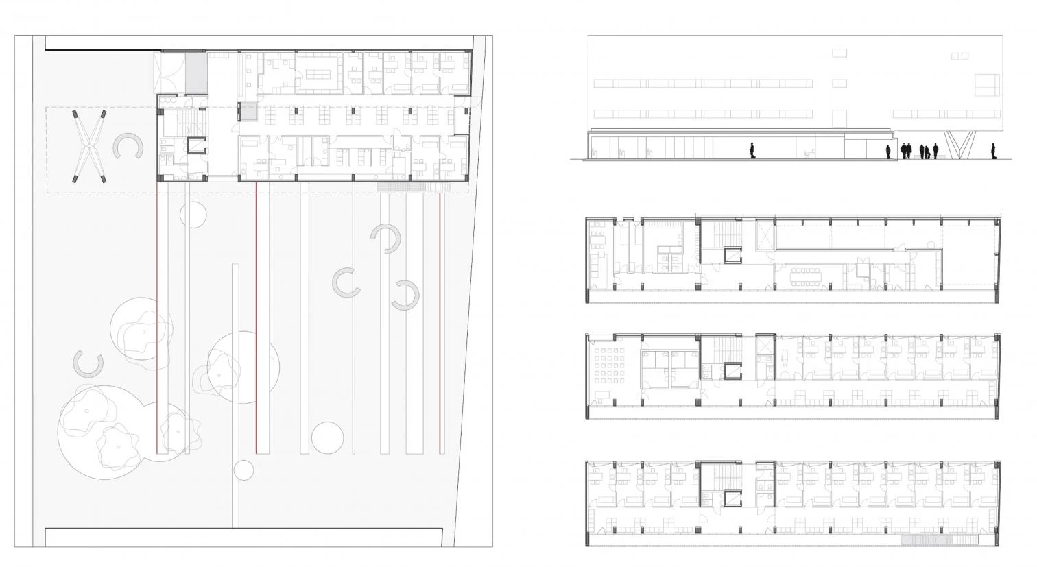 Los dos edificios de equipamientos se contemplarán de un lado a otro de la nueva plaza, cuyo pavimento refuerza esta relación mediante líneas rectas cerámicas trazadas entre los dos extremos. Las formas circulares utilizadas para los parterres y los bancos cristalizan reminiscencias del uso fabril que ocupó este espacio hasta hace pocos años. Además, los bancos alojan elementos de iluminación que los transforman en grandes lámparas por la noche, manteniendo así su carácter de puntos de encuentro. En el contexto de alta densidad edificatoria que caracteriza al barrio de El Raval, la plaza constituirá un necesario espacio de relación para su población que debe contribuir al reforzamiento de los vínculos sociales.