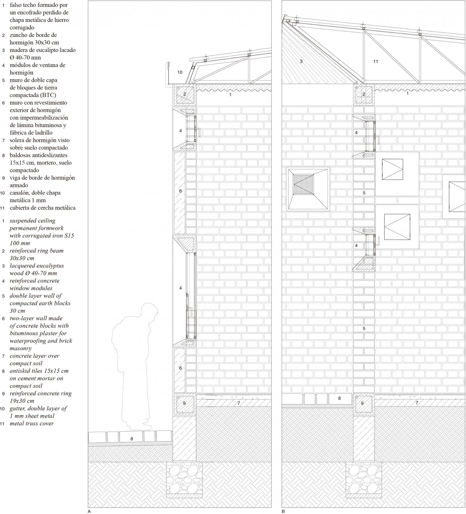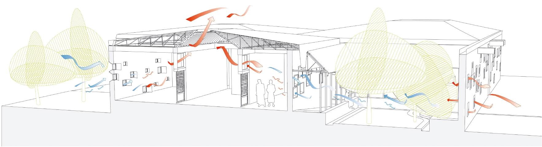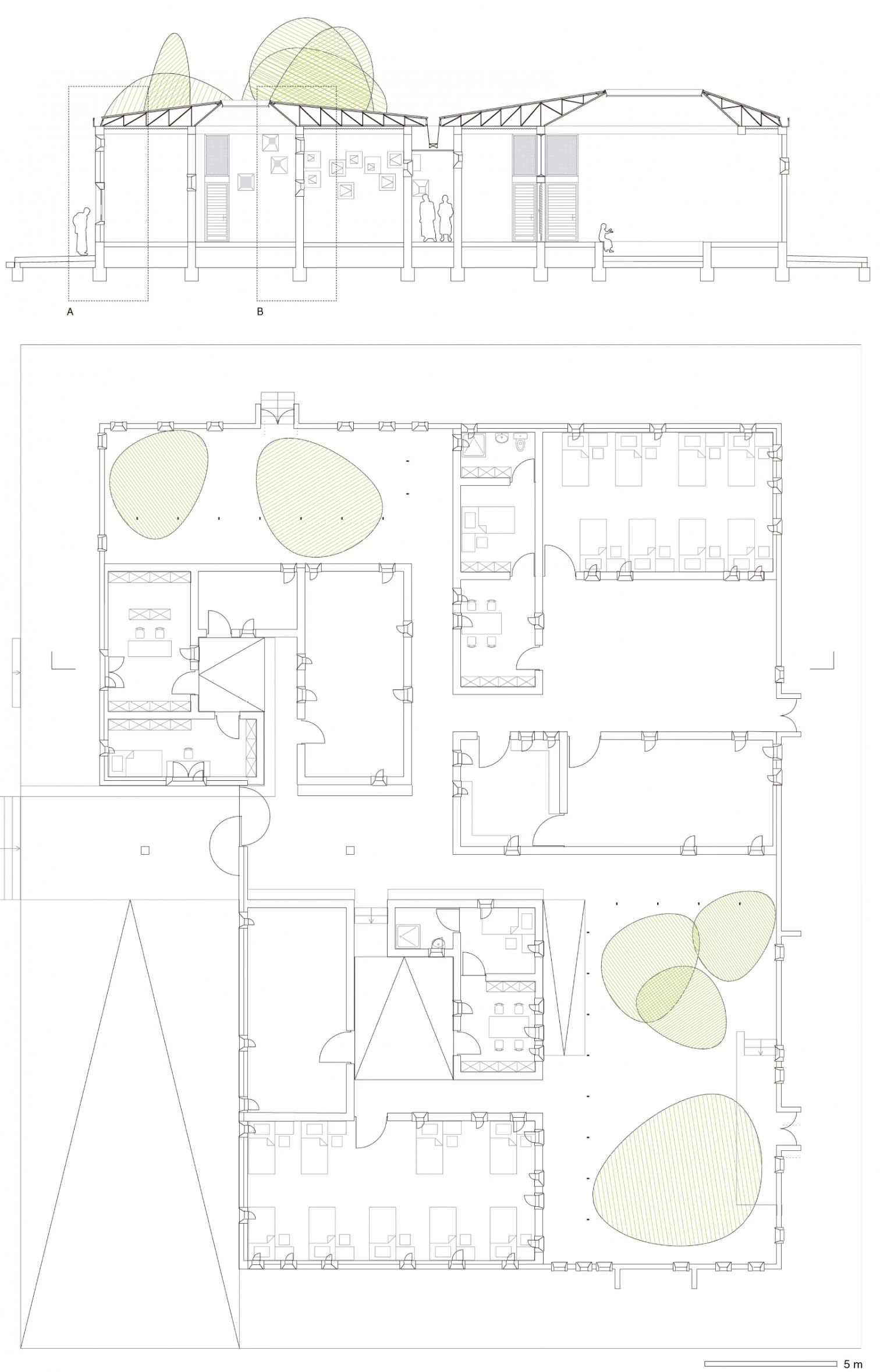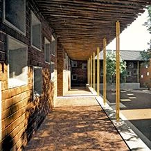 Con la intención de dotar al centro de un ambiente agradable para la comunidad, se han diseñado dos grandes patios de uso común donde los pacientes y familiares pueden descansar a la sombra. Además, cada unidad cuenta con su propio patio interior. El conjunto se cierra con un muro exterior permeable gracias a sus múltiples huecos. Diseñadas según tres módulos de diferentes tamaños, las ventanas se conciben como marcos de fotos que ofrecen al paciente diferentes enfoques del paisaje. Los muros exteriores están formados por una capa de ladrillos huecos de hormigón recubiertos de arcilla.