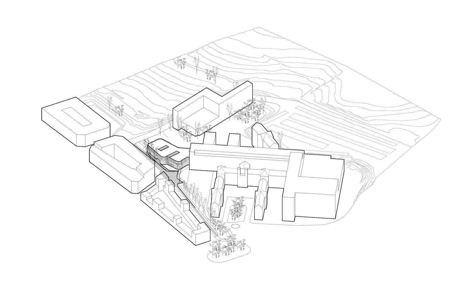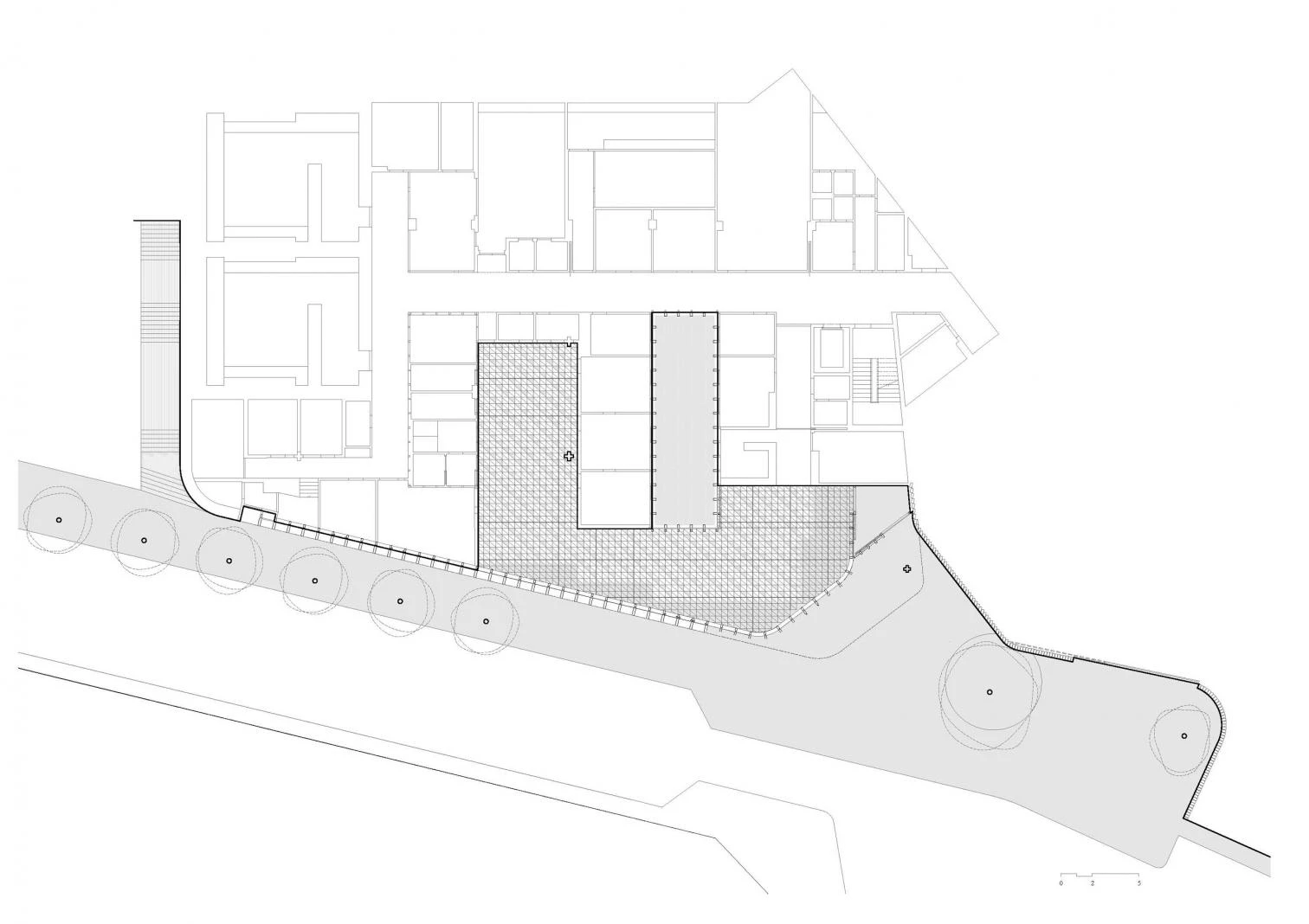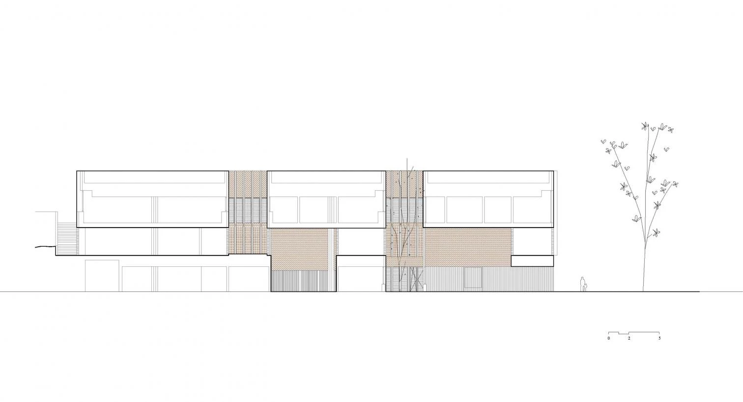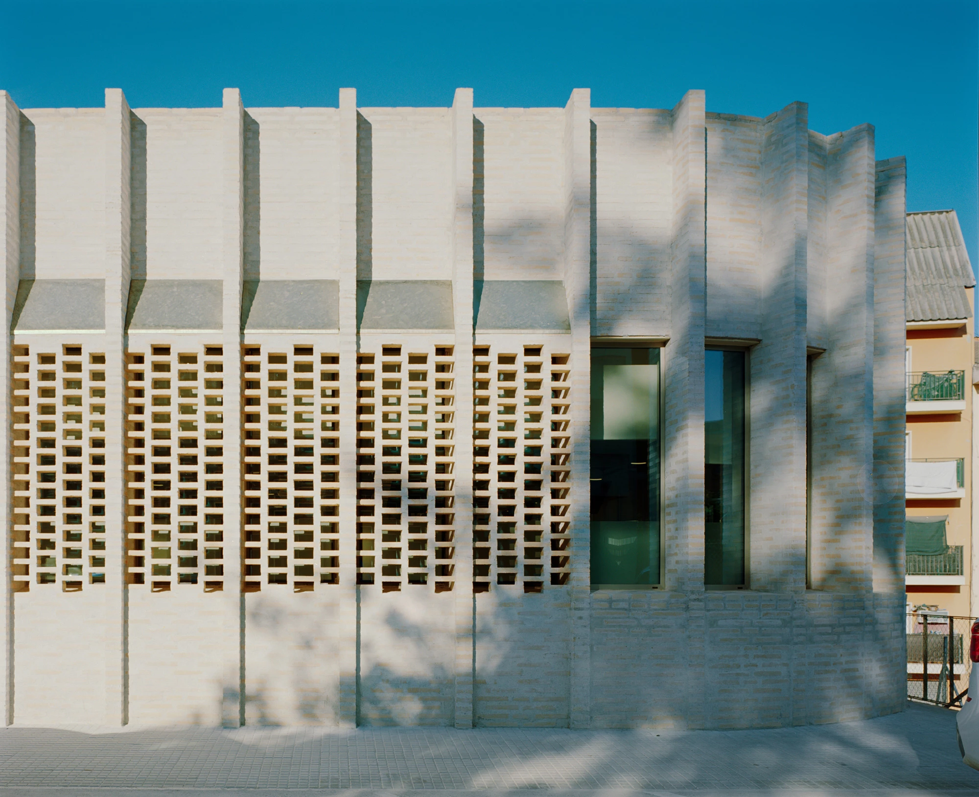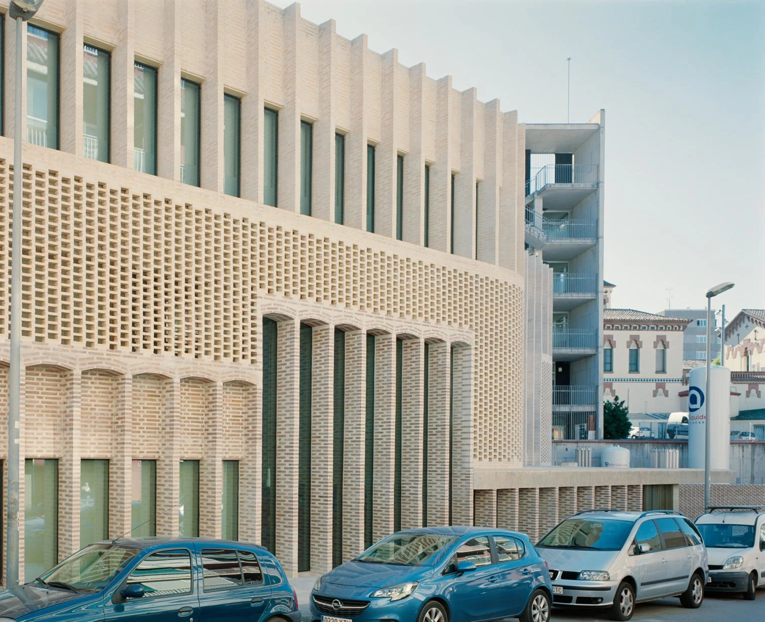Envuelto con lamas de ladrillo cerámico y celosías adaptadas a las diferentes situaciones del interior, este centro de día se sitúa dentro de una red de equipamientos sanitarios de proximidad, que permiten recibir tratamientos de larga duración sin tener que desplazarse a la capital. Organizado alrededor de dos patios, el volumen sinuoso presenta dos plantas con accesos diferenciados, según lo exige el programa: tratamientos de radioterapia en el nivel de la calle y de hemodiálisis en el nivel superior con acceso desde el jardín interior del hospital. La diferencia de cotas permite una planta intermedia que acoge las instalaciones, la cual desaparece para ofrecer una doble altura a espacios como la sala de espera principal. El edificio se retrasa para ampliar un poco la acera y construye con su geometría una pequeña plaza y el acceso principal.