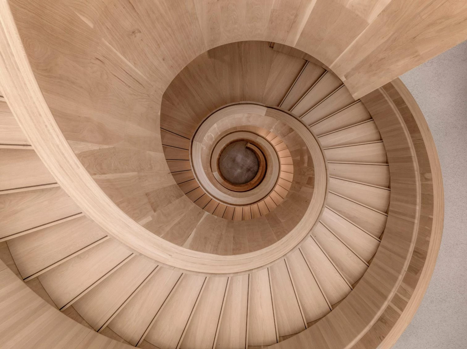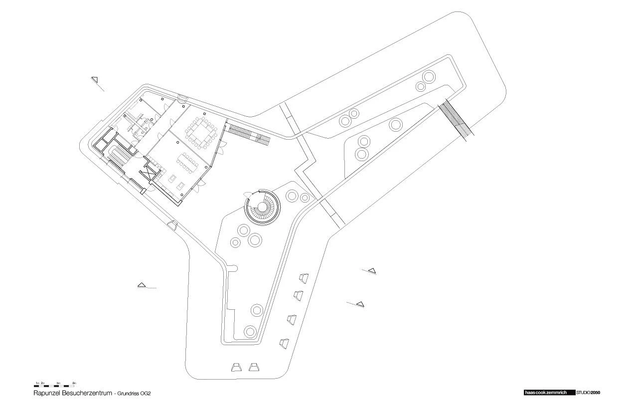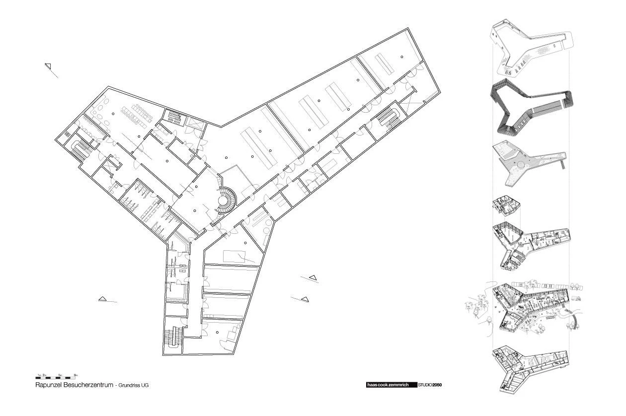 El cuento de hadas de los hermanos Grimm Rapunzel, publicado en 1812, inspira el proyecto. Con 14,5 metros de alto, la escalera de caracol que conecta todos los niveles del edificio evoca la larga trenza de la protagonista, encerrada en una torre. Envuelta en madera, la construcción se eleva evocando la altura de esta, desde donde Rapunzel deja caer su lago cabello rubio. La cubierta transitable permite disfrutar de las vistas al paisaje, mientras su amplio voladizo proporciona sombra. Se optimizan la ventilación y la iluminación naturales.